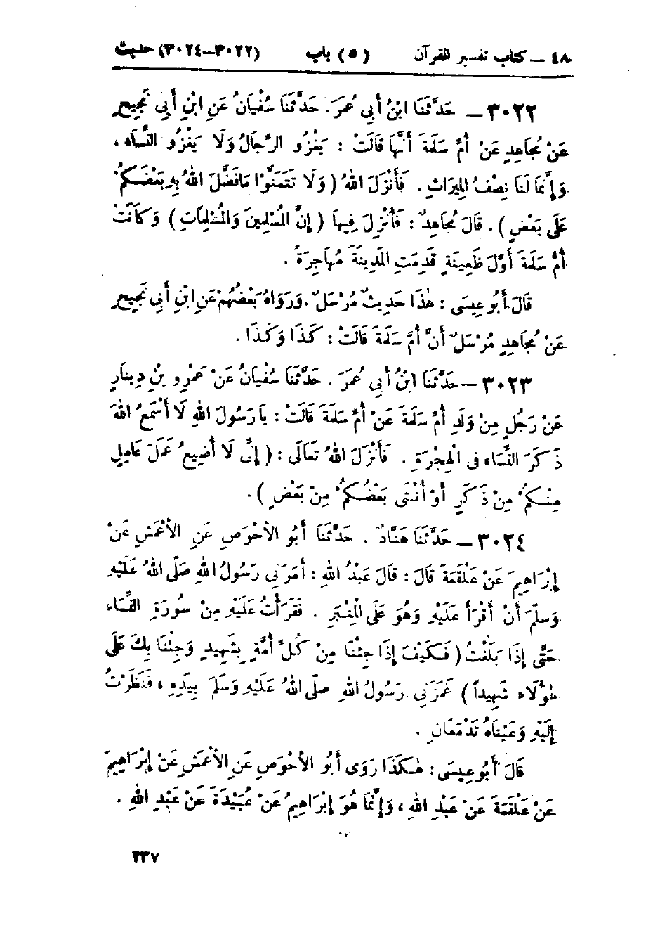 3022 - حَدَّثَنَا ابْنُ أَبِي عُمَرَ قَالَ: حَدَّثَنَا سُفْيَانُ، عَنْ ابْنِ أَبِي نَجِيحٍ، عَنْ مُجَاهِدٍ، عَنْ أُمِّ سَلَمَةَ، أَنَّهَا قَالَتْ: «§يَغْزُو الرِّجَالُ وَلَا تَغْزُو النِّسَاءُ وَإِنَّمَا لَنَا نِصْفُ المِيرَاثِ». فَأَنْزَلَ اللَّهُ {وَلَا تَتَمَنَّوْا مَا فَضَّلَ اللَّهُ بِهِ بَعْضَكُمْ عَلَى بَعْضٍ} [النساء: 32] قَالَ مُجَاهِدٌ: " وَأَنْزَلَ فِيهَا {إِنَّ المُسْلِمِينَ وَالمُسْلِمَاتِ} [الأحزاب: 35] وَكَانَتْ أُمُّ سَلَمَةَ أَوَّلَ ظَعِينَةٍ قَدِمَتِ المَدِينَةَ مُهَاجِرَةً ": " هَذَا حَدِيثٌ مُرْسَلٌ، وَرَوَاهُ بَعْضُهُمْ عَنْ ابْنِ أَبِي نَجِيحٍ، عَنْ مُجَاهِدٍ، مُرْسَلًا، أَنَّ أُمَّ سَلَمَةَ، قَالَتْ: كَذَا وَكَذَا "
