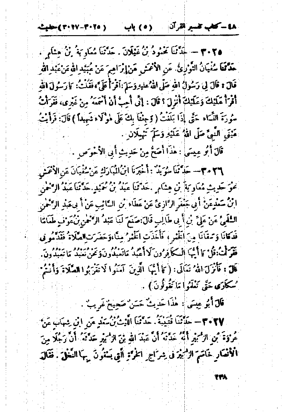 3025 - حَدَّثَنَا مَحْمُودُ بْنُ غَيْلَانَ قَالَ: حَدَّثَنَا مُعَاوِيَةُ بْنُ هِشَامٍ قَالَ: حَدَّثَنَا سُفْيَانُ الثَّوْرِيُّ، عَنْ الأَعْمَشِ، عَنْ إِبْرَاهِيمَ، عَنْ عَبِيدَةَ، عَنْ عَبْدِ اللَّهِ، قَالَ: قَالَ لِي رَسُولُ اللَّهِ صَلَّى اللَّهُ عَلَيْهِ وَسَلَّمَ: «§اقْرَأْ عَلَيَّ» فَقُلْتُ: يَا رَسُولَ اللَّهِ أَقْرَأُ عَلَيْكَ وَعَلَيْكَ أُنْزِلَ؟ قَالَ: «إِنِّي أُحِبُّ أَنْ أَسْمَعَهُ مِنْ غَيْرِي» فَقَرَأْتُ سُورَةَ النِّسَاءِ حَتَّى بَلَغْتُ {وَجِئْنَا بِكَ عَلَى هَؤُلَاءِ شَهِيدًا} [النساء: 41] قَالَ: فَرَأَيْتُ عَيْنَيِ النَّبِيِّ صَلَّى اللَّهُ عَلَيْهِ وَسَلَّمَ تَهْمِلَانِ: «هَذَا أَصَحُّ مِنْ حَدِيثِ أَبِي الأَحْوَصِ»