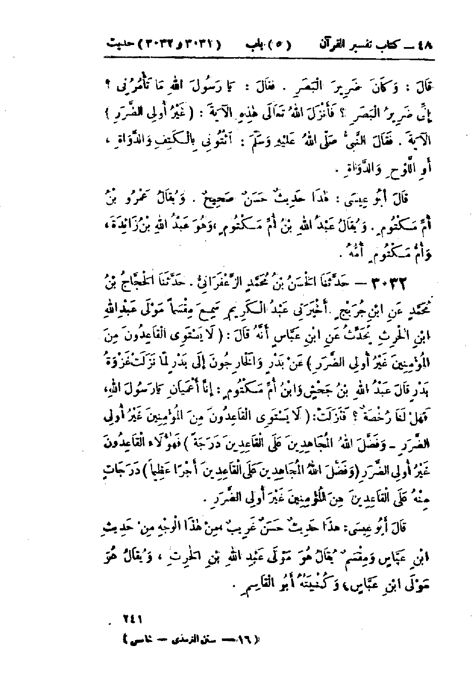 3032 - حَدَّثَنَا الحَسَنُ بْنُ مُحَمَّدٍ الزَّعْفَرَانِيُّ قَالَ: حَدَّثَنَا الحَجَّاجُ بْنُ مُحَمَّدٍ، عَنْ ابْنِ جُرَيْجٍ قَالَ: أَخْبَرَنِي عَبْدُ الكَرِيمِ، سَمِعَ مِقْسَمًا، مَوْلَى عَبْدِ اللَّهِ بْنِ الحَارِثِ، يُحَدِّثُ عَنْ ابْنِ عَبَّاسٍ، أَنَّهُ قَالَ: {لَا يَسْتَوِي القَاعِدُونَ مِنَ المُؤْمِنِينَ غَيْرُ أُولِي الضَّرَرِ} [النساء: 95] عَنْ بَدْرٍ، وَالخَارِجُونَ إِلَى بَدْرٍ لَمَّا نَزَلَتْ غَزْوَةُ بَدْرٍ قَالَ عَبْدُ اللَّهِ بْنُ جَحْشِ، وَابْنُ أُمِّ مَكْتُومٍ: " إِنَّا أَعْمَيَانِ يَا رَسُولَ اللَّهِ، فَهَلْ لَنَا رُخْصَةٌ؟ فَنَزَلَتْ: {§لَا يَسْتَوِي القَاعِدُونَ مِنَ المُؤْمِنِينَ غَيْرُ أُولِي الضَّرَرِ} [النساء: 95] وَ {فَضَّلَ اللَّهُ المُجَاهِدِينَ} [النساء: 95] {عَلَى القَاعِدِينَ دَرَجَةً} [النساء: 95] فَهَؤُلَاءِ القَاعِدُونَ غَيْرُ أُولِي الضَّرَرِ {وَفَضَّلَ اللَّهُ المُجَاهِدِينَ عَلَى القَاعِدِينَ أَجْرًا عَظِيمًا} [النساء: 95] دَرَجَاتٍ مِنْهُ عَلَى القَاعِدِينَ مِنَ المُؤْمِنِينَ غَيْرِ أُولِي الضَّرَرِ ": " هَذَا حَدِيثٌ حَسَنٌ غَرِيبٌ مِنْ هَذَا الوَجْهِ مِنْ حَدِيثِ ابْنِ عَبَّاسٍ، وَمِقْسَمٌ يُقَالُ: هُوَ مَوْلَى عَبْدِ اللَّهِ بْنِ الحَارِثِ، وَيُقَالُ: هُوَ مَوْلَى ابْنِ عَبَّاسٍ، وَكُنْيَتُهُ أَبُو القَاسِمِ "