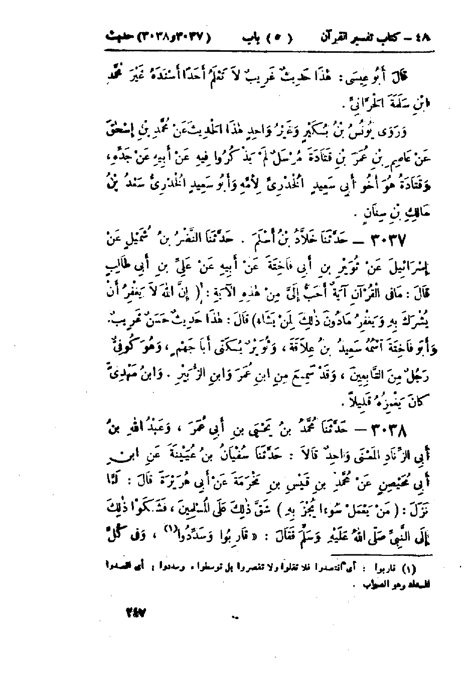 3037 - حَدَّثَنَا خَلَّادُ بْنُ أَسْلَمَ قَالَ: حَدَّثَنَا النَّضْرُ بْنُ شُمَيْلٍ، عَنْ إِسْرَائِيلَ، عَنْ ثُوَيْرِ بْنِ أَبِي فَاخِتَةَ، عَنْ أَبِيهِ، عَنْ عَلِيِّ بْنِ أَبِي طَالِبٍ، قَالَ: " §مَا فِي القُرْآنِ آيَةٌ أَحَبُّ إِلَيَّ مِنْ هَذِهِ الآيَةِ {إِنَّ اللَّهَ لَا يَغْفِرُ أَنْ يُشْرَكَ بِهِ وَيَغْفِرُ مَا دُونَ ذَلِكَ لِمَنْ يَشَاءُ} [النساء: 48] «.» وَهَذَا حَدِيثٌ حَسَنٌ غَرِيبٌ، وَأَبُو فَاخِتَةَ اسْمُهُ: سَعِيدُ بْنُ عِلَاقَةَ، وَثُوَيْرٌ يُكْنَى أَبَا جَهْمٍ، وَهُوَ رَجُلٌ كُوفِيٌّ مِنَ التَّابِعِينَ، وَقَدْ سَمِعَ مِنْ ابْنِ عُمَرَ، وَابْنِ الزُّبَيْرِ، وَابْنُ مَهْدِيٍّ كَانَ يَغْمِزُهُ قَلِيلًا "