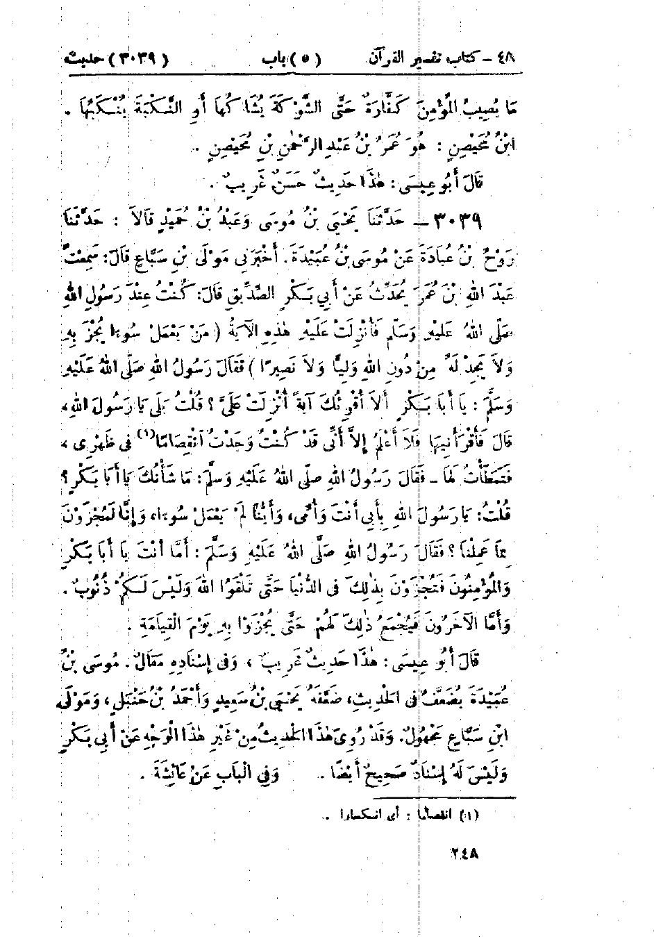 3039 - حَدَّثَنَا يَحْيَى بْنُ مُوسَى، وَعَبْدُ بْنُ حُمَيْدٍ، قَالَا: حَدَّثَنَا رَوْحُ بْنُ عُبَادَةَ، عَنْ مُوسَى بْنِ عُبَيْدَةَ قَالَ: أَخْبَرَنِي مَوْلَى ابْنِ سِبَاعٍ، قَالَ: سَمِعْتُ عَبْدَ اللَّهِ بْنَ عُمَرَ، يُحَدِّثُ عَنْ أَبِي بَكْرٍ الصِّدِّيقِ، قَالَ: كُنْتُ عِنْدَ رَسُولِ اللَّهِ صَلَّى اللَّهُ عَلَيْهِ وَسَلَّمَ فَأُنْزِلَتْ عَلَيْهِ هَذِهِ الآيَةَ: {مَنْ يَعْمَلْ سُوءًا يُجْزَ} [سورة: النساء، آية رقم: 123] بِهِ وَلَا يَجِدْ لَهُ مِنْ دُونِ اللَّهِ وَلِيًّا وَلَا نَصِيرًا فَقَالَ رَسُولُ اللَّهِ صَلَّى اللَّهُ عَلَيْهِ وَسَلَّمَ: «يَا أَبَا بَكْرٍ §أَلَا أُقْرِئُكَ آيَةً أُنْزِلَتْ عَلَيَّ»؟ قُلْتُ: بَلَى يَا رَسُولَ اللَّهِ، قَالَ: فَأَقْرَأَنِيهَا فَلَا أَعْلَمُ إِلَّا أَنِّي وَجَدْتُ اقْتِصَامًا فِي ظَهْرِي، فَتَمَطَّأْتُ لَهَا، فَقَالَ رَسُولُ اللَّهِ صَلَّى اللَّهُ عَلَيْهِ وَسَلَّمَ: «مَا شَأْنُكَ يَا أَبَا بَكْرٍ»؟ قُلْتُ: يَا رَسُولَ اللَّهِ بِأَبِي أَنْتَ وَأُمِّي، وَأَيُّنَا لَمْ يَعْمَلْ سُوءًا، وَإِنَّا لَمَجْزِيُّونَ بِمَا عَمِلْنَا؟ فَقَالَ رَسُولُ اللَّهِ صَلَّى اللَّهُ عَلَيْهِ وَسَلَّمَ: «أَمَّا أَنْتَ يَا أَبَا بَكْرٍ وَالمُؤْمِنُونَ فَتُجْزَوْنَ بِذَلِكَ فِي الدُّنْيَا حَتَّى تَلْقَوْا اللَّهَ وَلَيْسَ لَكُمْ ذُنُوبٌ، وَأَمَّا الآخَرُونَ فَيُجْمَعُ ذَلِكَ لَهُمْ حَتَّى يُجْزَوْا بِهِ يَوْمَ القِيَامَةِ»: «هَذَا حَدِيثٌ غَرِيبٌ وَفِي إِسْنَادِهِ مَقَالٌ. مُوسَى بْنُ عُبَيْدَةَ يُضَعَّفُ فِي الحَدِيثِ، ضَعَّفَهُ يَحْيَى بْنُ سَعِيدٍ وَأَحْمَدُ بْنُ حَنْبَلٍ، وَمَوْلَى ابْنِ سِبَاعٍ مَجْهُولٌ. وَقَدْ رُوِيَ هَذَا الحَدِيثُ مِنْ غَيْرِ هَذَا الوَجْهِ عَنْ أَبِي بَكْرٍ وَلَيْسَ لَهُ إِسْنَادٌ صَحِيحٌ أَيْضًا» وَفِي البَابِ عَنْ عَائِشَةَ