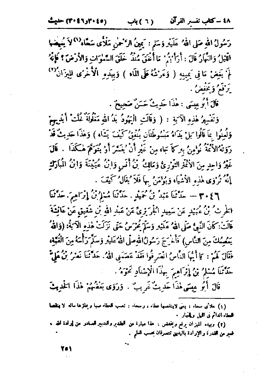 3046 - حَدَّثَنَا عَبْدُ بْنُ حُمَيْدٍ قَالَ: حَدَّثَنَا مُسْلِمُ بْنُ إِبْرَاهِيمَ قَالَ: حَدَّثَنَا الحَارِثُ بْنُ عُبَيْدٍ، عَنْ سَعِيدٍ الجُرَيْرِيِّ، عَنْ عَبْدِ اللَّهِ بْنِ شَقِيقٍ، عَنْ عَائِشَةَ، قَالَتْ: كَانَ النَّبِيُّ صَلَّى اللَّهُ عَلَيْهِ وَسَلَّمَ يُحْرَسُ حَتَّى نَزَلَتْ هَذِهِ الآيَةَ: {وَاللَّهُ يَعْصِمُكَ مِنَ النَّاسِ} [المائدة: 67] فَأَخْرَجَ رَسُولُ اللَّهِ صَلَّى اللَّهُ عَلَيْهِ وَسَلَّمَ رَأْسَهُ مِنَ القُبَّةِ، فَقَالَ لَهُمْ: «§يَا أَيُّهَا النَّاسُ انْصَرِفُوا فَقَدْ عَصَمَنِي اللَّهُ» حَدَّثَنَا نَصْرُ بْنُ عَلِيٍّ قَالَ: حَدَّثَنَا مُسْلِمُ بْنُ إِبْرَاهِيمَ، بِهَذَا الإِسْنَادِ نَحْوَهُ،: «هَذَا حَدِيثٌ غَرِيبٌ» وَرَوَى بَعْضُهُمْ هَذَا الحَدِيثَ -[252]- عَنِ الجُرَيْرِيِّ، عَنْ عَبْدِ اللَّهِ بْنِ شَقِيقٍ، قَالَ: «كَانَ النَّبِيُّ صَلَّى اللَّهُ عَلَيْهِ وَسَلَّمَ يُحْرَسُ» وَلَمْ يَذْكُرُوا فِيهِ عَنْ عَائِشَةَ