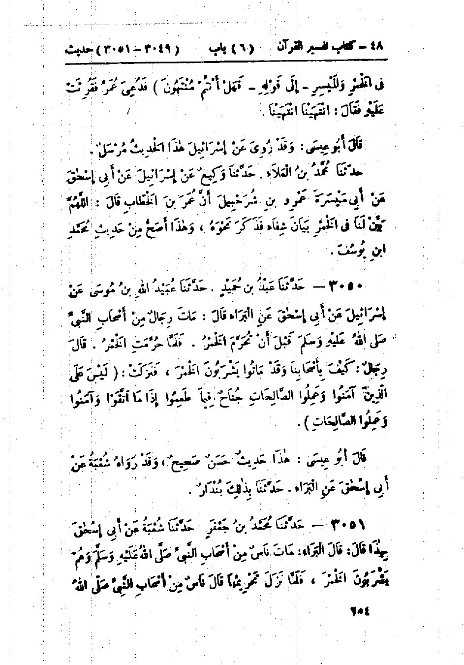 3051 - حَدَّثَنَا مُحَمَّدُ بْنُ جَعْفَرٍ قَالَ: حَدَّثَنَا شُعْبَةُ، عَنْ أَبِي إِسْحَاقَ، قَالَ: قَالَ البَرَاءُ: " مَاتَ نَاسٌ مِنْ أَصْحَابِ النَّبِيِّ صَلَّى اللَّهُ عَلَيْهِ وَسَلَّمَ وَهُمْ يَشْرَبُونَ الخَمْرَ، فَلَمَّا نَزَلَ تَحْرِيمُهَا قَالَ نَاسٌ مِنْ أَصْحَابِ النَّبِيِّ صَلَّى اللَّهُ -[255]- عَلَيْهِ وَسَلَّمَ: §فَكَيْفَ بِأَصْحَابِنَا الَّذِينَ مَاتُوا وَهُمْ يَشْرَبُونَهَا؟ قَالَ: فَنَزَلَتْ: {لَيْسَ عَلَى الَّذِينَ آمَنُوا وَعَمِلُوا الصَّالِحَاتِ} [المائدة: 93] " الْآيَةَ. هَذَا حَدِيثٌ حَسَنٌ صَحِيحٌ