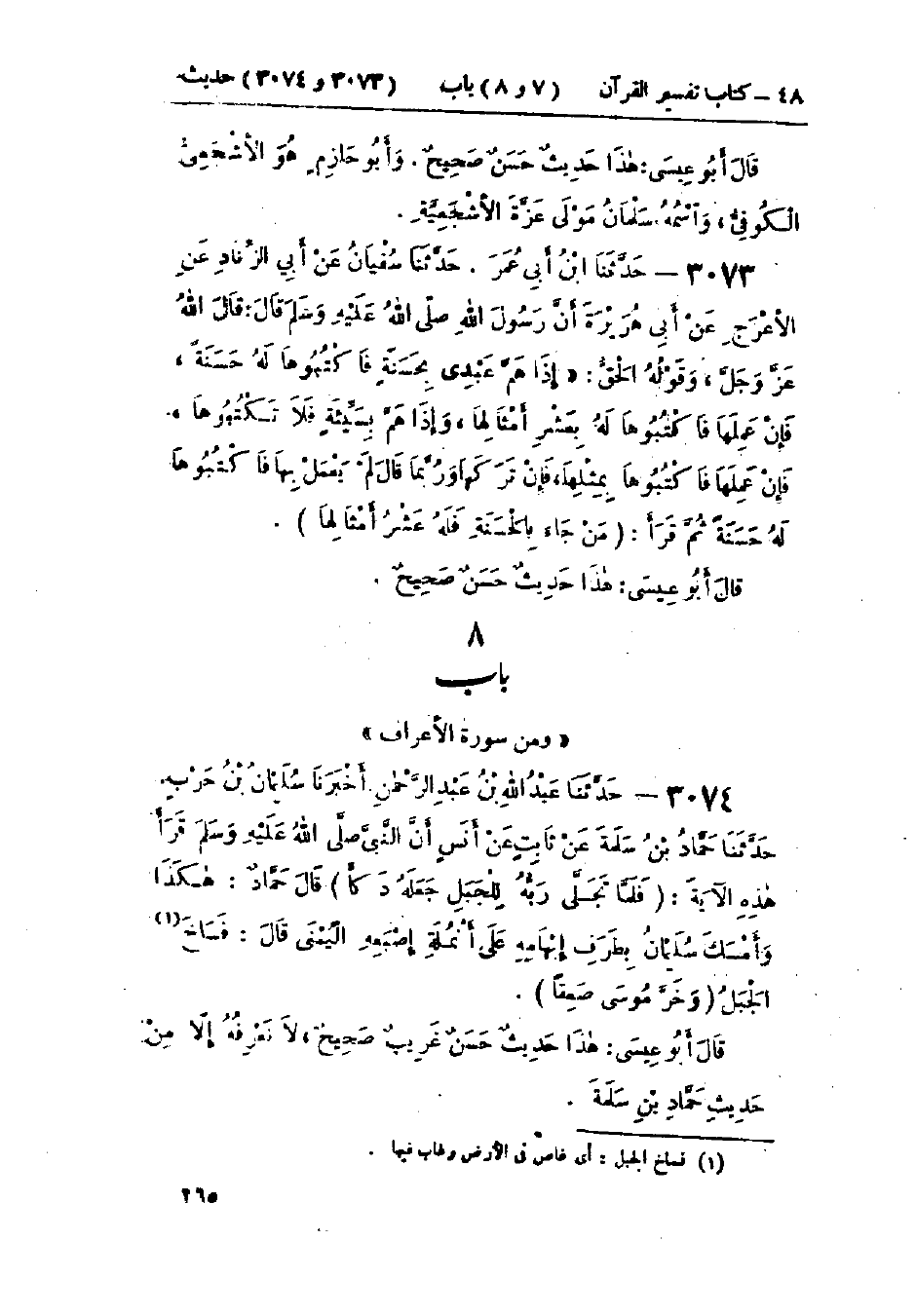 3074 - حَدَّثَنَا عَبْدُ اللَّهِ بْنُ عَبْدِ الرَّحْمَنِ قَالَ: أَخْبَرَنَا سُلَيْمَانُ بْنُ حَرْبٍ قَالَ: حَدَّثَنَا حَمَّادُ بْنُ سَلَمَةَ، عَنْ ثَابِتٍ، عَنْ أَنَسٍ، أَنَّ النَّبِيَّ صَلَّى اللَّهُ عَلَيْهِ وَسَلَّمَ: " §قَرَأَ هَذِهِ الآيَةَ {فَلَمَّا تَجَلَّى رَبُّهُ لِلْجَبَلِ جَعَلَهُ دَكًّا} [الأعراف: 143] " قَالَ حَمَّادٌ: هَكَذَا، وَأَمْسَكَ سُلَيْمَانُ بِطَرَفِ إِبْهَامِهِ عَلَى أُنْمُلَةِ إِصْبَعِهِ اليُمْنَى قَالَ: " فَسَاخَ الجَبَلُ {وَخَرَّ مُوسَى صَعِقًا} [الأعراف: 143] ": «هَذَا حَدِيثٌ حَسَنٌ صَحِيحٌ غَرِيبٌ لَا نَعْرِفُهُ إِلَّا مِنْ حَدِيثِ حَمَّادِ بْنِ سَلَمَةَ» -[266]- حَدَّثَنَا عَبْدُ الوَهَّابِ الوَرَّاقُ قَالَ: حَدَّثَنَا مُعَاذُ بْنُ مُعَاذٍ، عَنْ حَمَّادِ بْنِ سَلَمَةَ، عَنْ ثَابِتٍ، عَنْ أَنَسٍ، عَنِ النَّبِيِّ صَلَّى اللَّهُ عَلَيْهِ وَسَلَّمَ نَحْوَهُ