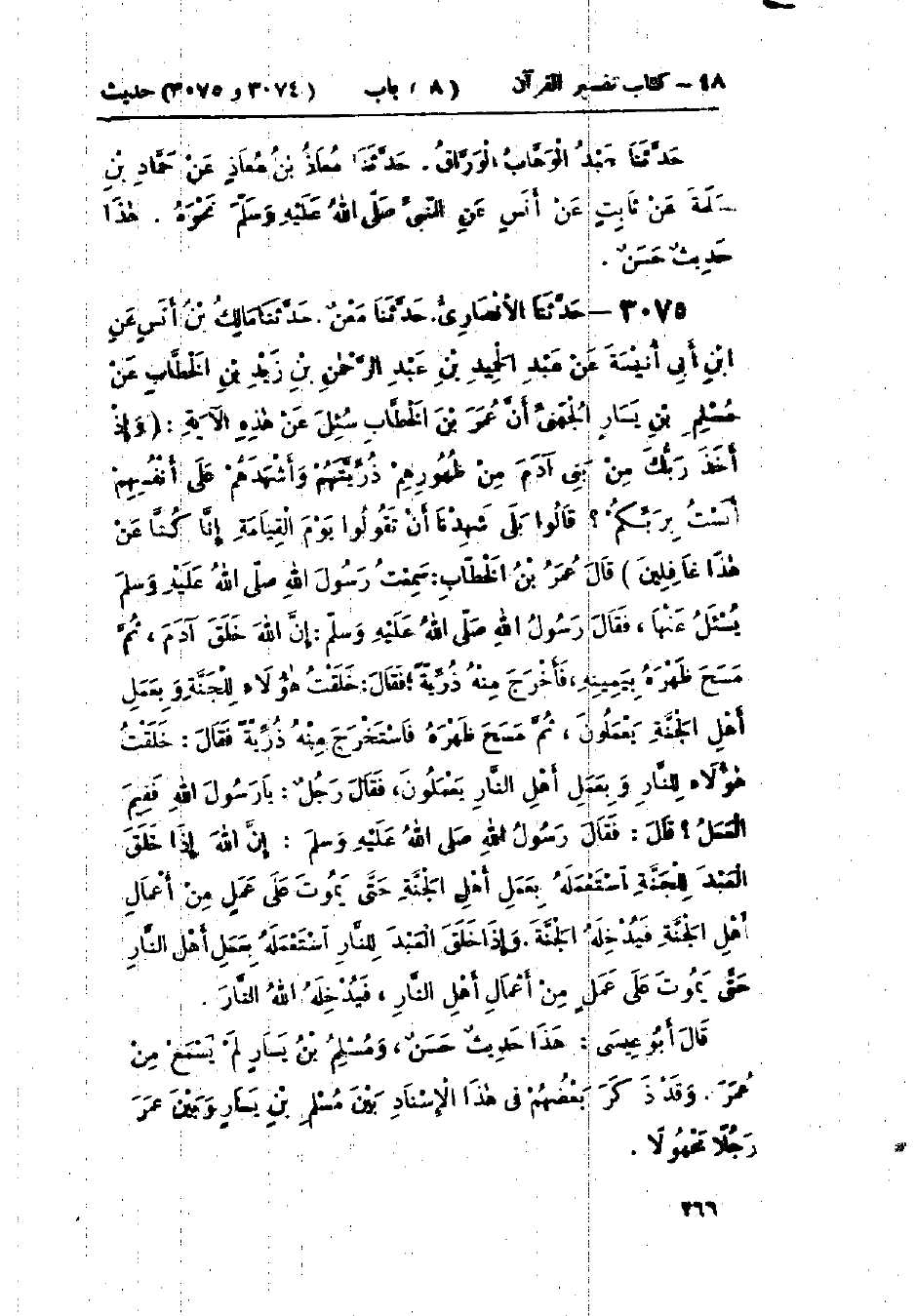 3075 - حَدَّثَنَا الأَنْصَارِيُّ قَالَ: حَدَّثَنَا مَعْنٌ قَالَ: حَدَّثَنَا مَالِكُ بْنُ أَنَسٍ، عَنِ ابْنِ أَبِي أُنَيْسَةَ، عَنْ عَبْدِ الحَمِيدِ بْنِ عَبْدِ الرَّحْمَنِ بْنِ زَيْدِ بْنِ الْخَطَّابِ، عَنْ مُسْلِمِ بْنِ يَسَارٍ الجُهَنِيِّ، أَنَّ عُمَرَ بْنَ الخَطَّابِ، سُئِلَ عَنْ هَذِهِ الآيَةِ {وَإِذْ أَخَذَ رَبُّكَ مِنْ بَنِي آدَمَ مِنْ ظُهُورِهِمْ ذُرِّيَّتَهُمْ} [الأعراف: 172] وَأَشْهَدَهُمْ عَلَى أَنْفُسِهِمْ أَلَسْتُ بِرَبِّكُمْ قَالُوا بَلَى شَهِدْنَا أَنْ تَقُولُوا يَوْمَ القِيَامَةِ إِنَّا كُنَّا عَنْ هَذَا غَافِلِينَ، قَالَ عُمَرُ بْنُ الخَطَّابِ: سَمِعْتُ رَسُولَ اللَّهِ صَلَّى اللَّهُ عَلَيْهِ وَسَلَّمَ يُسْأَلُ عَنْهَا، فَقَالَ رَسُولُ اللَّهِ صَلَّى اللَّهُ عَلَيْهِ وَسَلَّمَ: " إِنَّ اللَّهَ خَلَقَ آدَمَ، ثُمَّ مَسَحَ ظَهْرَهُ بِيَمِينِهِ، فَأَخْرَجَ مِنْهُ ذُرِّيَّةً، فَقَالَ: §خَلَقْتُ هَؤُلَاءِ لِلْجَنَّةِ وَبِعَمَلِ أَهْلِ الجَنَّةِ يَعْمَلُونَ، ثُمَّ مَسَحَ ظَهْرَهُ فَاسْتَخْرَجَ مِنْهُ ذُرِّيَّةً فَقَالَ: خَلَقْتُ هَؤُلَاءِ لِلنَّارِ وَبِعَمَلِ أَهْلِ النَّارِ يَعْمَلُونَ "، فَقَالَ رَجُلٌ: يَا رَسُولَ اللَّهِ، فَفِيمَ العَمَلُ؟ قَالَ: فَقَالَ رَسُولُ اللَّهِ صَلَّى اللَّهُ عَلَيْهِ وَسَلَّمَ: «إِنَّ اللَّهَ إِذَا خَلَقَ العَبْدَ لِلْجَنَّةِ اسْتَعْمَلَهُ بِعَمَلِ أَهْلِ الجَنَّةِ حَتَّى يَمُوتَ عَلَى عَمَلٍ مِنْ أَعْمَالِ أَهْلِ الجَنَّةِ فَيُدْخِلَهُ اللَّهُ الجَنَّةَ، وَإِذَا خَلَقَ العَبْدَ لِلنَّارِ اسْتَعْمَلَهُ بِعَمَلِ أَهْلِ النَّارِ حَتَّى يَمُوتَ عَلَى عَمَلٍ مِنْ أَعْمَالِ أَهْلِ النَّارِ، فَيُدْخِلَهُ اللَّهُ النَّارَ»: «هَذَا حَدِيثٌ حَسَنٌ وَمُسْلِمُ بْنُ يَسَارٍ لَمْ يَسْمَعْ مِنْ عُمَرَ، وَقَدْ ذَكَرَ بَعْضُهُمْ فِي هَذَا الإِسْنَادِ بَيْنَ مُسْلِمِ بْنِ يَسَارٍ وَبَيْنَ عُمَرَ رَجُلًا»