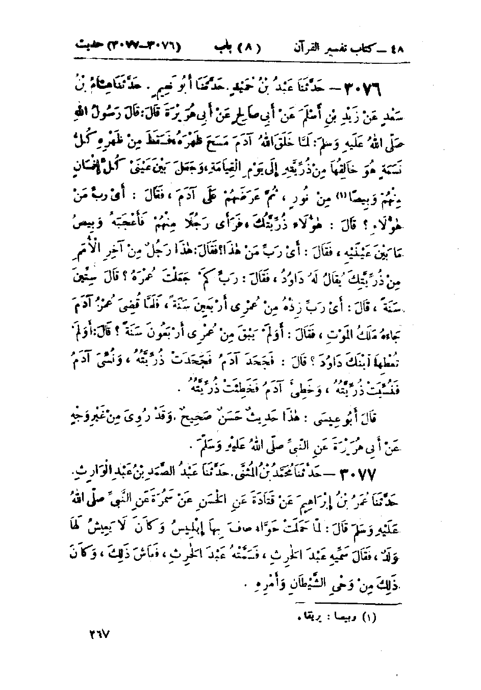 3076 - حَدَّثَنَا عَبْدُ بْنُ حُمَيْدٍ قَالَ: حَدَّثَنَا أَبُو نُعَيْمٍ قَالَ: حَدَّثَنَا هِشَامُ بْنُ سَعْدٍ، عَنْ زَيْدِ بْنِ أَسْلَمَ، عَنْ أَبِي صَالِحٍ، عَنْ أَبِي هُرَيْرَةَ، قَالَ: قَالَ رَسُولُ اللَّهِ صَلَّى اللَّهُ عَلَيْهِ وَسَلَّمَ: " لَمَّا خَلَقَ اللَّهُ آدَمَ مَسَحَ ظَهْرَهُ، فَسَقَطَ مِنْ ظَهْرِهِ كُلُّ نَسَمَةٍ هُوَ خَالِقُهَا مِنْ ذُرِّيَّتِهِ إِلَى يَوْمِ القِيَامَةِ، وَجَعَلَ بَيْنَ عَيْنَيْ كُلِّ إِنْسَانٍ مِنْهُمْ وَبِيصًا مِنْ نُورٍ، ثُمَّ عَرَضَهُمْ عَلَى آدَمَ فَقَالَ: أَيْ رَبِّ، مَنْ هَؤُلَاءِ؟ قَالَ: §هَؤُلَاءِ ذُرِّيَّتُكَ، فَرَأَى رَجُلًا مِنْهُمْ فَأَعْجَبَهُ وَبِيصُ مَا بَيْنَ عَيْنَيْهِ، فَقَالَ: أَيْ رَبِّ مَنْ هَذَا؟ فَقَالَ: هَذَا رَجُلٌ مِنْ آخِرِ الأُمَمِ مِنْ ذُرِّيَّتِكَ يُقَالُ لَهُ دَاوُدُ فَقَالَ: رَبِّ كَمْ جَعَلْتَ عُمْرَهُ؟ قَالَ: سِتِّينَ سَنَةً، قَالَ: أَيْ رَبِّ، زِدْهُ مِنْ عُمْرِي أَرْبَعِينَ سَنَةً، فَلَمَّا قُضِيَ عُمْرُ آدَمَ جَاءَهُ مَلَكُ المَوْتِ، فَقَالَ: أَوَلَمْ يَبْقَ مِنْ عُمْرِي أَرْبَعُونَ سَنَةً؟ قَالَ: أَوَلَمْ تُعْطِهَا ابْنَكَ دَاوُدَ قَالَ: فَجَحَدَ آدَمُ فَجَحَدَتْ ذُرِّيَّتُهُ، وَنُسِّيَ آدَمُ فَنُسِّيَتْ ذُرِّيَّتُهُ، وَخَطِئَ آدَمُ فَخَطِئَتْ ذُرِّيَّتُهُ ": «هَذَا حَدِيثٌ حَسَنٌ صَحِيحٌ، وَقَدْ رُوِيَ مِنْ غَيْرِ وَجْهٍ عَنْ أَبِي هُرَيْرَةَ عَنِ النَّبِيِّ صَلَّى اللَّهُ عَلَيْهِ وَسَلَّمَ»
