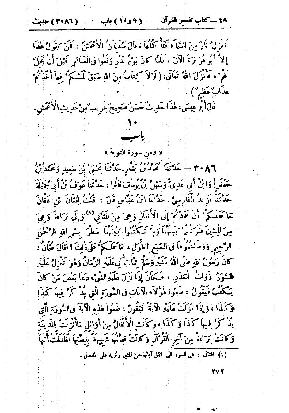 3086 - حَدَّثَنَا مُحَمَّدُ بْنُ بَشَّارٍ قَالَ: حَدَّثَنَا يَحْيَى بْنُ سَعِيدٍ، وَمُحَمَّدُ بْنُ جَعْفَرٍ، وَابْنُ أَبِي عَدِيٍّ، وَسَهْلُ بْنُ يُوسُفَ، قَالُوا: حَدَّثَنَا عَوْفُ بْنُ أَبِي جَمِيلَةَ قَالَ: حَدَّثَنَا يَزِيدُ الفَارِسِيُّ قَالَ: حَدَّثَنَا ابْنُ عَبَّاسٍ، قَالَ: قُلْتُ لِعُثْمَانَ بْنِ عَفَّانَ: مَا حَمَلَكُمْ أَنْ عَمَدْتُمْ إِلَى الأَنْفَالِ وَهِيَ مِنَ المَثَانِي وَإِلَى بَرَاءَةٌ وَهِيَ مِنَ المِئِينَ فَقَرَنْتُمْ بَيْنَهُمَا وَلَمْ تَكْتُبُوا بَيْنَهُمَا سَطْرَ بِسْمِ اللَّهِ الرَّحْمَنِ الرَّحِيمِ وَوَضَعْتُمُوهَا فِي السَّبْعِ الطُّوَلِ، مَا حَمَلَكُمْ عَلَى ذَلِكَ؟ فَقَالَ عُثْمَانُ: كَانَ رَسُولُ اللَّهِ صَلَّى اللَّهُ عَلَيْهِ وَسَلَّمَ مِمَّا يَأْتِي عَلَيْهِ الزَّمَانُ وَهُوَ يُنْزَلُ عَلَيْهِ السُّوَرُ ذَوَاتُ الْعَدَدِ، فَكَانَ إِذَا نَزَلَ عَلَيْهِ الشَّيْءُ دَعَا بَعْضَ مَنْ كَانَ يَكْتُبُ فَيَقُولُ: «§ضَعُوا هَؤُلَاءِ الآيَاتِ فِي السُّورَةِ الَّتِي يُذْكَرُ فِيهَا كَذَا وَكَذَا» وَإِذَا نَزَلَتْ عَلَيْهِ الآيَةَ فَيَقُولُ: «ضَعُوا هَذِهِ الآيَةَ فِي السُّورَةِ الَّتِي يُذْكَرُ فِيهَا كَذَا وَكَذَا»، وَكَانَتِ الأَنْفَالُ مِنْ أَوَائِلِ مَا نَزَلَتْ بِالْمَدِينَةِ وَكَانَتْ بَرَاءَةٌ مِنْ آخِرِ القُرْآنِ وَكَانَتْ قِصَّتُهَا شَبِيهَةً بِقِصَّتِهَا فَظَنَنْتُ أَنَّهَا -[273]- مِنْهَا، فَقُبِضَ رَسُولُ اللَّهِ صَلَّى اللَّهُ عَلَيْهِ وَسَلَّمَ وَلَمْ يُبَيِّنْ لَنَا أَنَّهَا مِنْهَا، فَمِنْ أَجْلِ ذَلِكَ قَرَنْتُ بَيْنَهُمَا وَلَمْ أَكْتُبْ بَيْنَهُمَا سَطْرَ بِسْمِ اللَّهِ الرَّحْمَنِ الرَّحِيمِ، فَوَضَعْتُهَا فِي السَّبْعِ الطُّوَلِ: «هَذَا حَدِيثٌ حَسَنٌ لَا نَعْرِفُهُ إِلَّا مِنْ حَدِيثِ عَوْفٍ، عَنْ يَزِيدَ الفَارِسِيِّ، عَنْ ابْنِ عَبَّاسٍ» وَيَزِيدُ الفَارِسِيُّ قَدْ رَوَى عَنِ ابْنِ عَبَّاسٍ، غَيْرَ حَدِيثٍ، وَيُقَالُ هُوَ: يَزِيدُ بْنُ هُرْمُزَ، وَيَزِيدُ الرَّقَاشِيُّ هُوَ: يَزِيدُ بْنُ أَبَانَ الرَّقَاشِيُّ وَلَمْ يُدْرِكْ ابْنَ عَبَّاسٍ إِنَّمَا رَوَى عَنْ أَنَسِ بْنِ مَالِكٍ، وَكِلَاهُمَا مِنْ أَهْلِ البَصْرَةِ، وَيَزِيدُ الفَارِسِيُّ أَقْدَمُ مِنْ يَزِيدَ الرَّقَاشِيِّ "