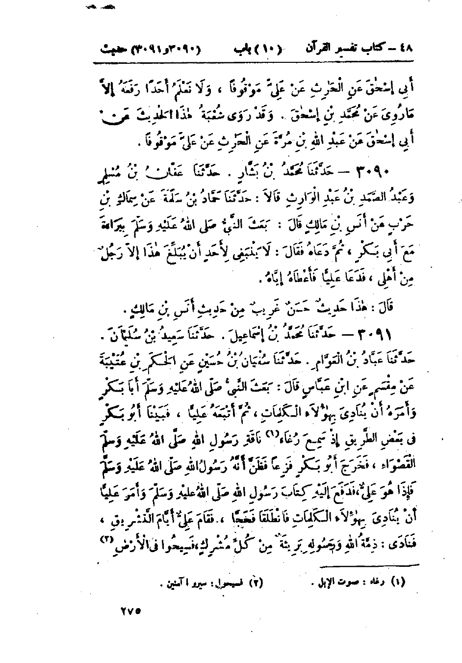3091 - حَدَّثَنَا مُحَمَّدُ بْنُ إِسْمَاعِيلَ قَالَ: حَدَّثَنَا سَعِيدُ بْنُ سُلَيْمَانَ قَالَ: حَدَّثَنَا عَبَّادُ بْنُ العَوَّامِ قَالَ: حَدَّثَنَا سُفْيَانُ بْنُ حُسَيْنٍ، عَنْ الحَكَمِ بْنِ عُتَيْبَةَ، عَنْ مِقْسَمٍ، عَنْ ابْنِ عَبَّاسٍ، قَالَ: بَعَثَ النَّبِيُّ صَلَّى اللَّهُ عَلَيْهِ وَسَلَّمَ أَبَا بَكْرٍ وَأَمَرَهُ أَنْ يُنَادِيَ بِهَؤُلَاءِ الكَلِمَاتِ، ثُمَّ أَتْبَعَهُ عَلِيًّا، فَبَيْنَا أَبُو بَكْرٍ فِي بَعْضِ الطَّرِيقِ إِذْ سَمِعَ رُغَاءَ نَاقَةِ رَسُولِ اللَّهِ صَلَّى اللَّهُ عَلَيْهِ وَسَلَّمَ القَصْوَاءِ، فَخَرَجَ أَبُو بَكْرٍ فَزِعًا فَظَنَّ أَنَّهُ رَسُولُ اللَّهِ صَلَّى اللَّهُ عَلَيْهِ وَسَلَّمَ فَإِذَا هُوَ عَلِيٌّ، فَدَفَعَ إِلَيْهِ كِتَابَ رَسُولِ اللَّهِ صَلَّى اللَّهُ عَلَيْهِ وَسَلَّمَ وَأَمَرَ عَلِيًّا أَنْ يُنَادِيَ بِهَؤُلَاءِ الكَلِمَاتِ فَانْطَلَقَا فَحَجَّا، فَقَامَ عَلِيٌّ أَيَّامَ التَّشْرِيقِ، فَنَادَى: «§ذِمَّةُ اللَّهِ وَرَسُولِهِ بَرِيئَةٌ مِنْ كُلِّ مُشْرِكٍ، فَسِيحُوا فِي الأَرْضِ -[276]- أَرْبَعَةَ أَشْهُرٍ، وَلَا يَحُجَّنَّ بَعْدَ العَامِ مُشْرِكٌ، وَلَا يَطُوفَنَّ بِالبَيْتِ عُرْيَانٌ، وَلَا يَدْخُلُ الجَنَّةَ إِلَّا مُؤْمِنٌ». وَكَانَ عَلِيٌّ يُنَادِي، فَإِذَا عَيِيَ قَامَ أَبُو بَكْرٍ فَنَادَى بِهَا.: «وهَذَا حَدِيثٌ حَسَنٌ غَرِيبٌ مِنْ هَذَا الوَجْهِ مِنْ حَدِيثِ ابْنِ عَبَّاسٍ»