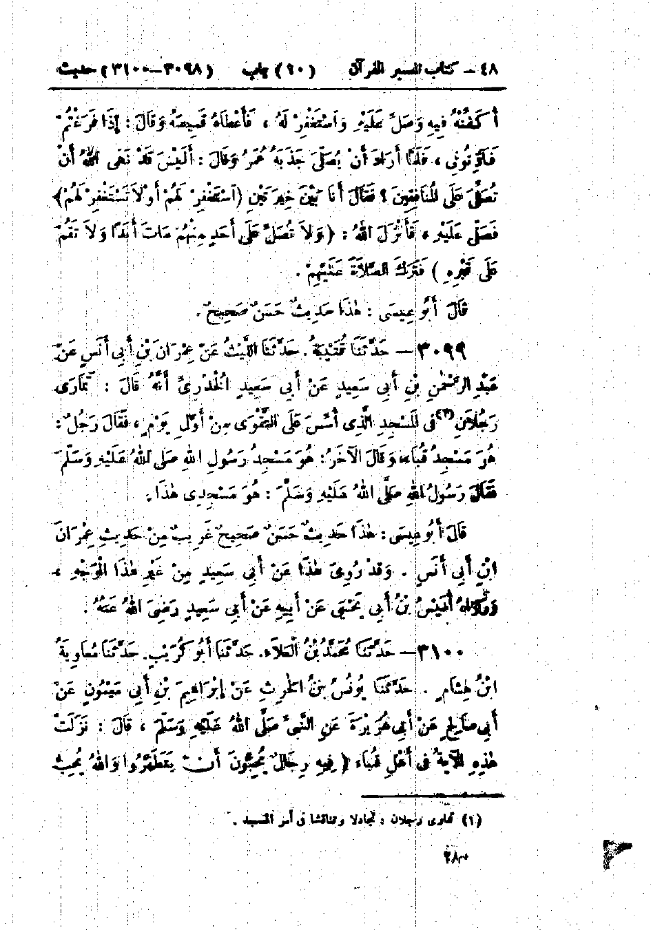 3099 - حَدَّثَنَا قُتَيْبَةُ قَالَ: حَدَّثَنَا اللَّيْثُ، عَنْ عِمْرَانَ بْنِ أَبِي أَنَسٍ، عَنْ عَبْدِ الرَّحْمَنِ بْنِ أَبِي سَعِيدٍ، عَنْ أَبِي سَعِيدٍ الخُدْرِيِّ، أَنَّهُ قَالَ: تَمَارَى رَجُلَانِ فِي المَسْجِدِ الَّذِي أُسِّسَ عَلَى التَّقْوَى مِنْ أَوَّلِ يَوْمٍ، فَقَالَ رَجُلٌ: هُوَ مَسْجِدُ قُبَاءَ، وَقَالَ الآخَرُ: هُوَ مَسْجِدُ رَسُولِ اللَّهِ صَلَّى اللَّهُ عَلَيْهِ وَسَلَّمَ، فَقَالَ رَسُولُ اللَّهِ صَلَّى اللَّهُ عَلَيْهِ وَسَلَّمَ: «§هُوَ مَسْجِدِي هَذَا»: «هَذَا حَدِيثٌ حَسَنٌ صَحِيحٌ مِنْ حَدِيثِ عِمْرَانَ بْنِ أَبِي أَنَسٍ وَقَدْ رُوِيَ هَذَا عَنْ أَبِي سَعِيدٍ مِنْ غَيْرِ هَذَا الوَجْهِ»، وَرَوَاهُ أُنَيْسُ بْنُ أَبِي يَحْيَى، عَنْ أَبِيهِ، عَنْ أَبِي سَعِيدٍ