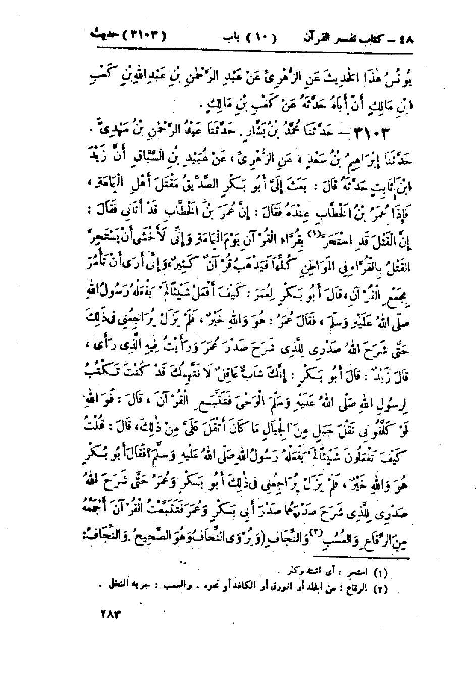 3103 - حَدَّثَنَا مُحَمَّدُ بْنُ بَشَّارٍ قَالَ: حَدَّثَنَا عَبْدُ الرَّحْمَنِ بْنُ مَهْدِيٍّ قَالَ: حَدَّثَنَا إِبْرَاهِيمُ بْنُ سَعْدٍ، عَنْ الزُّهْرِيِّ، عَنْ عُبَيْدِ بْنِ السَّبَّاقِ، أَنَّ زَيْدَ بْنَ ثَابِتٍ، حَدَّثَهُ قَالَ: " بَعَثَ إِلَيَّ أَبُو بَكْرٍ الصِّدِّيقُ مَقْتَلَ أَهْلِ اليَمَامَةِ فَإِذَا عُمَرُ بْنُ الخَطَّابِ عِنْدَهُ فَقَالَ: إِنَّ عُمَرَ بْنَ الخَطَّابِ قَدْ أَتَانِي فَقَالَ: إِنَّ §القَتْلَ قَدْ اسْتَحَرَّ بِقُرَّاءِ القُرْآنِ يَوْمَ اليَمَامَةِ، وَإِنِّي لَأَخْشَى أَنْ يَسْتَحِرَّ القَتْلُ بِالقُرَّاءِ فِي المَوَاطِنِ كُلِّهَا فَيَذْهَبَ قُرْآنٌ كَثِيرٌ، وَإِنِّي أَرَى أَنْ تَأْمُرَ بِجَمْعِ القُرْآنِ، قَالَ أَبُو بَكْرٍ لِعُمَرَ: كَيْفَ أَفْعَلُ شَيْئًا لَمْ يَفْعَلْهُ رَسُولُ اللَّهِ صَلَّى اللَّهُ عَلَيْهِ وَسَلَّمَ؟ فَقَالَ عُمَرُ: هُوَ وَاللَّهِ خَيْرٌ، فَلَمْ يَزَلْ يُرَاجِعُنِي فِي ذَلِكَ حَتَّى شَرَحَ اللَّهُ صَدْرِي لِلَّذِي شَرَحَ لَهُ صَدْرَ عُمَرَ، وَرَأَيْتُ فِيهِ الَّذِي رَأَى "، قَالَ زَيْدٌ: " قَالَ أَبُو بَكْرٍ: إِنَّكَ شَابٌّ عَاقِلٌ لَا نَتَّهِمُكَ، قَدْ كُنْتَ تَكْتُبُ لِرَسُولِ اللَّهِ صَلَّى اللَّهُ عَلَيْهِ وَسَلَّمَ الوَحْيَ فَتَتَبَّعِ القُرْآنَ "، قَالَ: «فَوَاللَّهِ لَوْ كَلَّفُونِي نَقْلَ جَبَلٍ مِنَ الجِبَالِ مَا كَانَ أَثْقَلَ عَلَيَّ مِنْ ذَلِكَ»، قَالَ: " قُلْتُ: كَيْفَ تَفْعَلُونَ شَيْئًا لَمْ يَفْعَلْهُ رَسُولُ اللَّهِ صَلَّى اللَّهُ عَلَيْهِ وَسَلَّمَ؟ فَقَالَ أَبُو بَكْرٍ: هُوَ وَاللَّهِ خَيْرٌ، فَلَمْ يَزَلْ يُرَاجِعُنِي فِي ذَلِكَ أَبُو بَكْرٍ وَعُمَرُ حَتَّى شَرَحَ اللَّهُ صَدْرِي لِلَّذِي شَرَحَ لَهُ صَدْرَهُمَا: صَدْرَ أَبِي بَكْرٍ وَعُمَرَ فَتَتَبَّعْتُ القُرْآنَ أَجْمَعُهُ مِنَ الرِّقَاعِ وَالعُسُبِ وَاللِّخَافِ - يَعْنِي الْحِجَارَةَ الرِّقَاقَ -[284]- وَصُدُورِ الرِّجَالِ، فَوَجَدْتُ آخِرَ سُورَةِ بَرَاءَةٌ مَعَ خُزَيْمَةَ بْنِ ثَابِتٍ {لَقَدْ جَاءَكُمْ رَسُولٌ مِنْ أَنْفُسِكُمْ عَزِيزٌ عَلَيْهِ مَا عَنِتُّمْ حَرِيصٌ عَلَيْكُمْ بِالمُؤْمِنِينَ رَءُوفٌ رَحِيمٌ فَإِنْ تَوَلَّوْا فَقُلْ حَسْبِيَ اللَّهُ لَا إِلَهَ إِلَّا هُوَ عَلَيْهِ تَوَكَّلْتُ وَهُوَ رَبُّ العَرْشِ العَظِيمِ} ": «هَذَا حَدِيثٌ حَسَنٌ صَحِيحٌ»