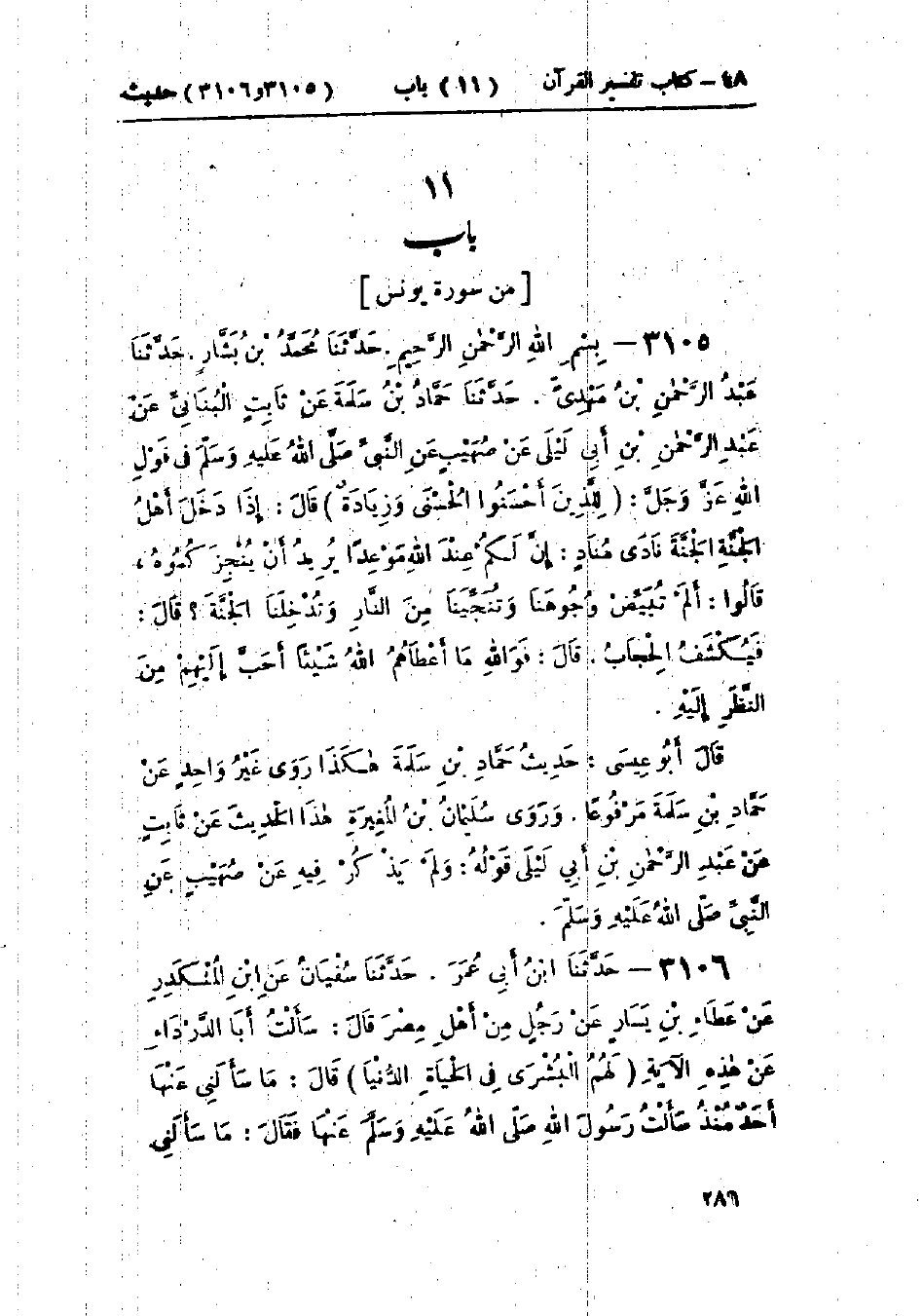 3105 - حَدَّثَنَا مُحَمَّدُ بْنُ بَشَّارٍ قَالَ: حَدَّثَنَا عَبْدُ الرَّحْمَنِ بْنُ مَهْدِيٍّ قَالَ: حَدَّثَنَا حَمَّادُ بْنُ سَلَمَةَ، عَنْ ثَابِتٍ البُنَانِيِّ، عَنْ عَبْدِ الرَّحْمَنِ بْنِ أَبِي لَيْلَى، عَنْ صُهَيْبٍ، عَنِ النَّبِيِّ صَلَّى اللَّهُ عَلَيْهِ وَسَلَّمَ فِي قَوْلِ اللَّهِ عَزَّ وَجَلَّ: {لِلَّذِينَ أَحْسَنُوا الحُسْنَى وَزِيَادَةٌ} [يونس: 26] قَالَ: " §إِذَا دَخَلَ أَهْلُ الجَنَّةِ الجَنَّةَ نَادَى مُنَادٍ: إِنَّ لَكُمْ عِنْدَ اللَّهِ مَوْعِدًا يُرِيدُ أَنْ يُنْجِزَكُمُوهُ، قَالُوا: أَلَمْ يُبَيِّضْ وُجُوهَنَا وَيُنْجِنَا مِنَ النَّارِ وَيُدْخِلْنَا الجَنَّةَ؟ " قَالَ: «فَيُكْشَفُ الحِجَابُ» قَالَ: «فَوَاللَّهِ مَا أَعْطَاهُمُ اللَّهُ شَيْئًا أَحَبَّ إِلَيْهِمْ مِنَ النَّظَرِ إِلَيْهِ»: «حَدِيثُ حَمَّادِ بْنِ سَلَمَةَ هَكَذَا رَوَى غَيْرُ وَاحِدٍ عَنْ حَمَّادِ بْنِ سَلَمَةَ مَرْفُوعًا» وَرَوَى سُلَيْمَانُ بْنُ المُغِيرَةِ، هَذَا الحَدِيثَ عَنْ ثَابِتٍ، عَنْ عَبْدِ الرَّحْمَنِ بْنِ أَبِي لَيْلَى، قَوْلَهُ، «وَلَمْ يَذْكُرْ فِيهِ عَنْ صُهَيْبٍ عَنِ النَّبِيِّ صَلَّى اللَّهُ عَلَيْهِ وَسَلَّمَ»