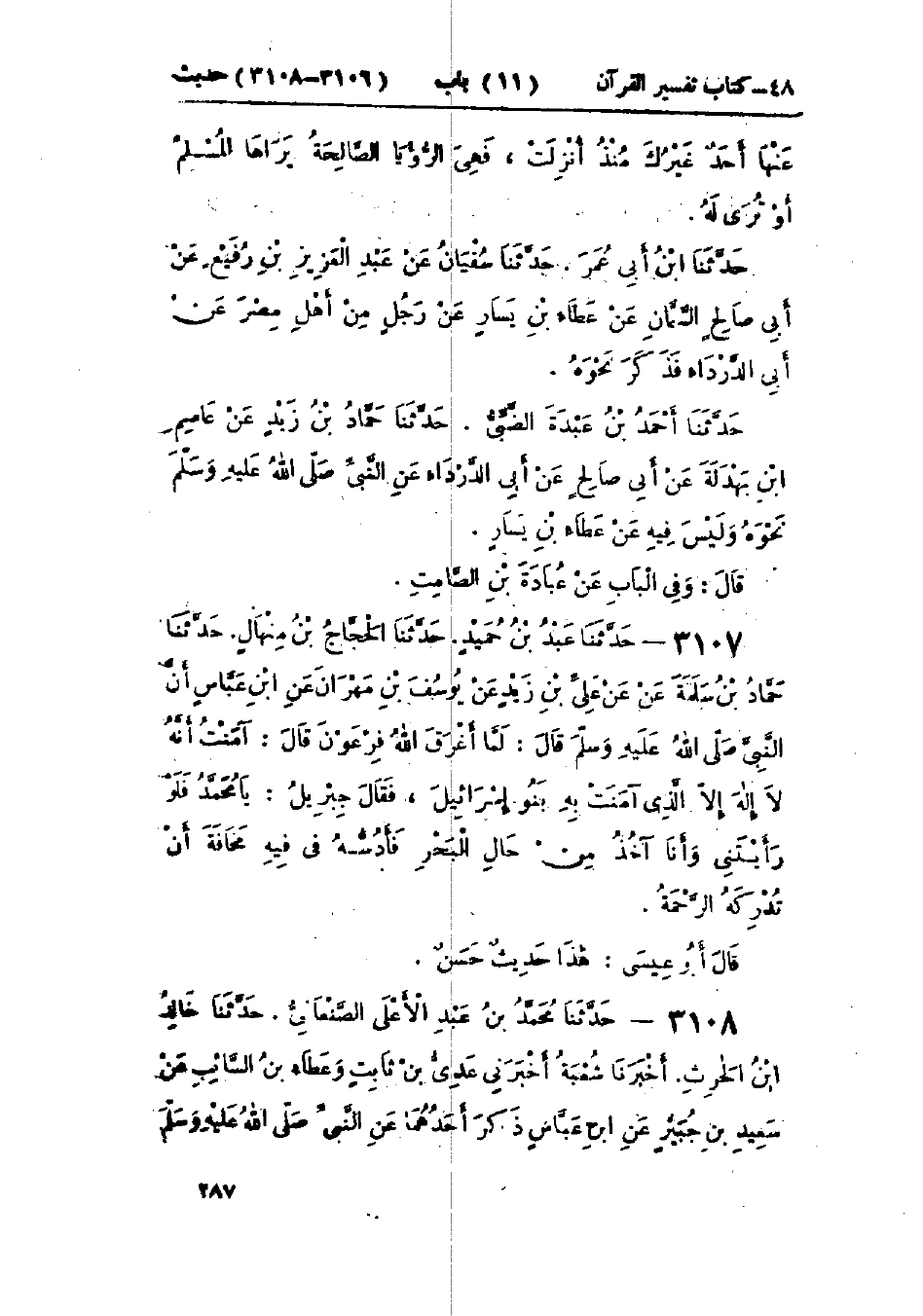 3108 - حَدَّثَنَا مُحَمَّدُ بْنُ عَبْدِ الأَعْلَى الصَّنْعَانِيُّ قَالَ: حَدَّثَنَا خَالِدُ بْنُ الحَارِثِ قَالَ: أَخْبَرَنَا شُعْبَةُ قَالَ: أَخْبَرَنِي عَدِيُّ بْنُ ثَابِتٍ، وَعَطَاءُ بْنُ السَّائِبِ، عَنْ سَعِيدِ بْنِ جُبَيْرٍ، عَنْ ابْنِ عَبَّاسٍ، ذَكَرَ أَحَدُهُمَا، عَنِ النَّبِيِّ صَلَّى اللَّهُ عَلَيْهِ وَسَلَّمَ -[288]- أَنَّهُ ذَكَرَ " أَنَّ §جِبْرِيلَ جَعَلَ يَدُسُّ فِي فِي فِرْعَوْنَ الطِّينَ خَشْيَةَ أَنْ يَقُولَ: لَا إِلَهَ إِلَّا اللَّهُ، فَيَرْحَمَهُ اللَّهُ «، أَوْ» خَشْيَةَ أَنْ يَرْحَمَهُ اللَّهُ ": «هَذَا حَدِيثٌ حَسَنٌ صَحِيحٌ غَرِيبٌ مِنْ هَذَا الوَجْهِ»