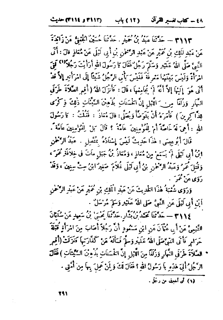 3113 - حَدَّثَنَا عَبْدُ بْنُ حُمَيْدٍ قَالَ: حَدَّثَنَا حُسَيْنٌ الْجُعْفِيُّ، عَنْ زَائِدَةَ، عَنْ عَبْدِ المَلِكِ بْنِ عُمَيْرٍ، عَنْ عَبْدِ الرَّحْمَنِ بْنِ أَبِي لَيْلَى، عَنْ مُعَاذٍ، قَالَ: أَتَى النَّبِيَّ صَلَّى اللَّهُ عَلَيْهِ وَسَلَّمَ رَجُلٌ فَقَالَ: يَا رَسُولَ اللَّهِ، أَرَأَيْتَ رَجُلًا لَقِيَ امْرَأَةً وَلَيْسَ بَيْنَهُمَا مَعْرِفَةٌ فَلَيْسَ يَأْتِي الرَّجُلُ شَيْئًا إِلَى امْرَأَتِهِ إِلَّا قَدْ أَتَى هُوَ إِلَيْهَا إِلَّا أَنَّهُ لَمْ يُجَامِعْهَا؟ قَالَ: §فَأَنْزَلَ اللَّهُ {وَأَقِمِ الصَّلَاةَ طَرَفَيِ النَّهَارِ وَزُلَفًا مِنَ اللَّيْلِ إِنَّ الحَسَنَاتِ يُذْهِبْنَ السَّيِّئَاتِ ذَلِكَ ذِكْرَى لِلذَّاكِرِينَ} [هود: 114] فَأَمَرَهُ أَنْ يَتَوَضَّأَ وَيُصَلِّيَ. قَالَ مُعَاذٌ: فَقُلْتُ: يَا رَسُولَ اللَّهِ، أَهِيَ لَهُ خَاصَّةً أَمْ لِلْمُؤْمِنِينَ عَامَّةً؟ قَالَ: «بَلْ لِلْمُؤْمِنِينَ عَامَّةً»: «هَذَا حَدِيثٌ لَيْسَ إِسْنَادُهُ بِمُتَّصِلٍ عَبْدُ الرَّحْمَنِ بْنُ أَبِي لَيْلَى لَمْ يَسْمَعْ مِنْ مُعَاذٍ، وَمُعَاذُ بْنُ جَبَلٍ مَاتَ فِي خِلَافَةِ عُمَرَ، وَقُتِلَ عُمَرُ وَعَبْدُ الرَّحْمَنِ بْنُ أَبِي لَيْلَى غُلَامٌ صَغِيرٌ ابْنُ سِتِّ سِنِينَ، وَقَدْ رَوَى عَنْ عُمَرَ وَرَآهُ» وَرَوَى شُعْبَةُ، هَذَا الحَدِيثَ عَنْ عَبْدِ المَلِكِ بْنِ عُمَيْرٍ، عَنْ عَبْدِ الرَّحْمَنِ بْنِ أَبِي لَيْلَى، عَنِ النَّبِيِّ صَلَّى اللَّهُ عَلَيْهِ وَسَلَّمَ «مُرْسَلًا»
