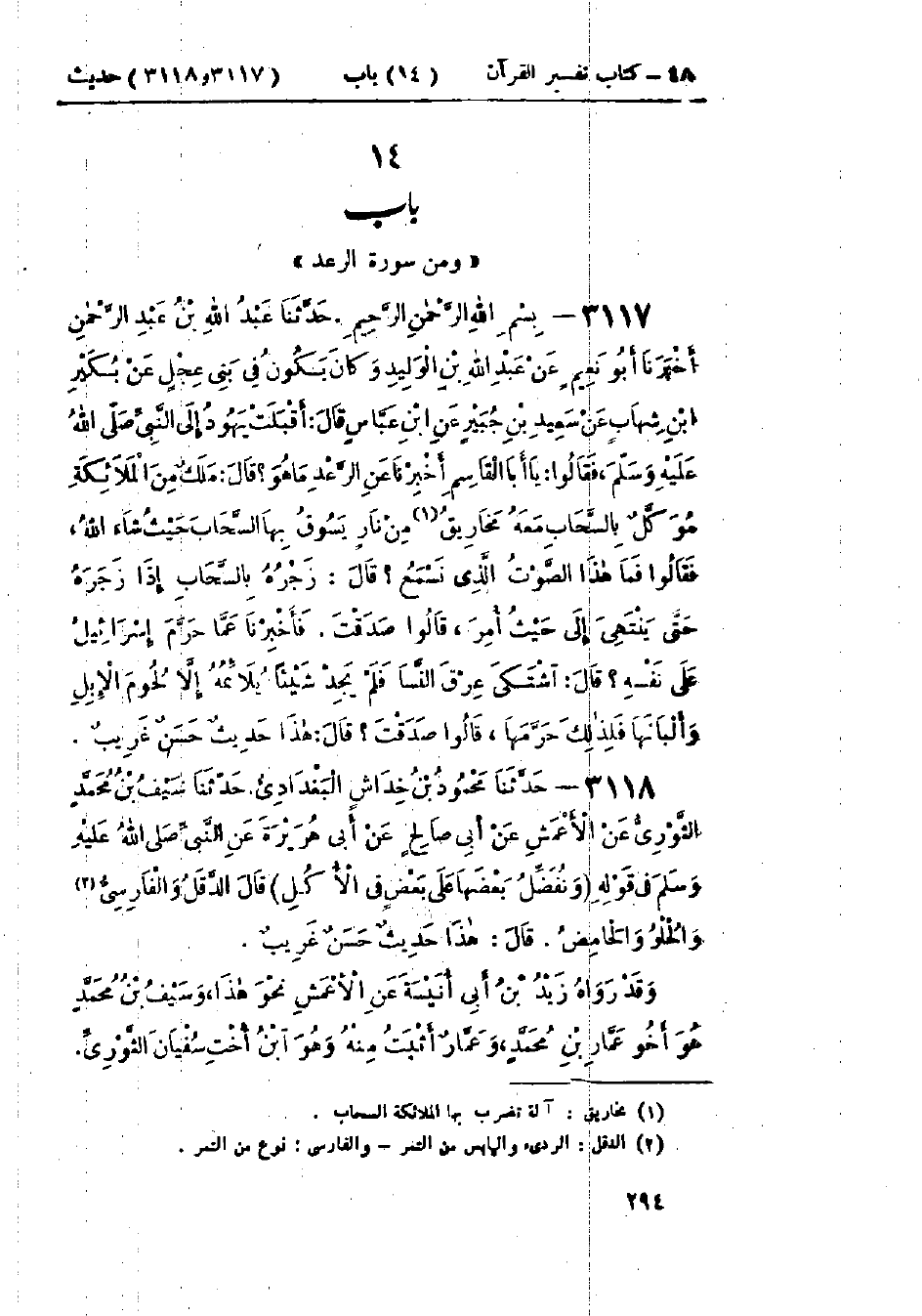 3117 - حَدَّثَنَا عَبْدُ اللَّهِ بْنُ عَبْدِ الرَّحْمَنِ قَالَ: أَخْبَرَنَا أَبُو نُعَيْمٍ، عَنْ عَبْدِ اللَّهِ بْنِ الوَلِيدِ - وَكَانَ يَكُونُ فِي بَنِي عِجْلٍ - عَنْ بُكَيْرِ بْنِ شِهَابٍ، عَنْ سَعِيدِ بْنِ جُبَيْرٍ، عَنْ ابْنِ عَبَّاسٍ، قَالَ: أَقْبَلَتْ يَهُودُ إِلَى النَّبِيِّ صَلَّى اللَّهُ عَلَيْهِ وَسَلَّمَ، فَقَالُوا: يَا أَبَا القَاسِمِ، أَخْبِرْنَا عَنِ الرَّعْدِ مَا هُوَ؟ قَالَ: «§مَلَكٌ مِنَ المَلَائِكَةِ مُوَكَّلٌ بِالسَّحَابِ مَعَهُ مَخَارِيقُ مِنْ نَارٍ يَسُوقُ بِهَا السَّحَابَ حَيْثُ شَاءَ اللَّهُ» فَقَالُوا: فَمَا هَذَا الصَّوْتُ الَّذِي نَسْمَعُ؟ قَالَ: «زَجْرَةٌ بِالسَّحَابِ إِذَا زَجَرَهُ حَتَّى يَنْتَهِيَ إِلَى حَيْثُ أُمِرَ» قَالُوا: صَدَقْتَ. فَقَالُوا: فَأَخْبِرْنَا عَمَّا حَرَّمَ إِسْرَائِيلُ عَلَى نَفْسِهِ؟ قَالَ: «اشْتَكَى عِرْقَ النَّسَا فَلَمْ يَجِدْ شَيْئًا يُلَائِمُهُ إِلَّا لُحُومَ الإِبِلِ وَأَلْبَانَهَا فَلِذَلِكَ حَرَّمَهَا» قَالُوا: صَدَقْتَ. «هَذَا حَدِيثٌ حَسَنٌ غَرِيبٌ»