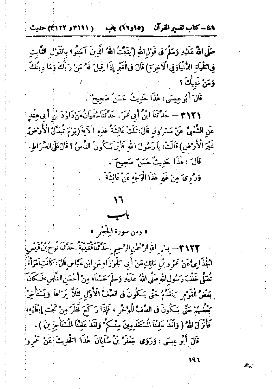 3121 - حَدَّثَنَا ابْنُ أَبِي عُمَرَ قَالَ: حَدَّثَنَا سُفْيَانُ، عَنْ دَاوُدَ بْنِ أبِي هِنْدٍ، عَنْ الشَّعْبِيِّ، عَنْ مَسْرُوقٍ، قَالَ: تَلَتْ عَائِشَةُ، هَذِهِ الآيَةَ {يَوْمَ تُبَدَّلُ الأَرْضُ غَيْرَ الأَرْضِ} [إبراهيم: 48] قَالَتْ: يَا رَسُولَ اللَّهِ، فَأَيْنَ يَكُونُ النَّاسُ؟ قَالَ: «§عَلَى الصِّرَاطِ». «هَذَا حَدِيثٌ حَسَنٌ صَحِيحٌ، وَرُوِيَ مِنْ غَيْرِ هَذَا الوَجْهِ عَنْ عَائِشَةَ»