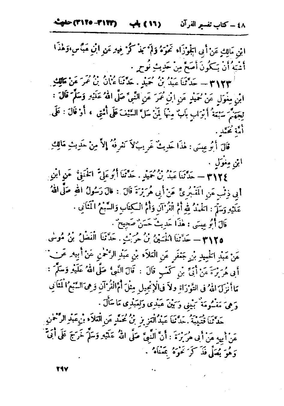 3125 - حَدَّثَنَا الحُسَيْنُ بْنُ حُرَيْثٍ قَالَ: حَدَّثَنَا الفَضْلُ بْنُ مُوسَى، عَنْ عَبْدِ الحَمِيدِ بْنِ جَعْفَرٍ، عَنْ العَلَاءِ بْنِ عَبْدِ الرَّحْمَنِ، عَنْ أَبِيهِ، عَنْ أَبِي هُرَيْرَةَ، عَنْ أُبَيِّ بْنِ كَعْبٍ، قَالَ: قَالَ النَّبِيُّ صَلَّى اللَّهُ عَلَيْهِ وَسَلَّمَ: «§مَا أَنْزَلَ اللَّهُ فِي التَّوْرَاةِ وَالْإِنْجِيلِ مِثْلَ أُمِّ القُرْآنِ، وَهِيَ السَّبْعُ المَثَانِي، وَهِيَ مَقْسُومَةٌ بَيْنِي وَبَيْنَ عَبْدِي، وَلِعَبْدِي مَا سَأَلَ» حَدَّثَنَا قُتَيْبَةُ قَالَ: حَدَّثَنَا عَبْدُ العَزِيزِ بْنُ مُحَمَّدٍ، عَنِ العَلَاءِ بْنِ عَبْدِ الرَّحْمَنِ، عَنْ أَبِيهِ، عَنْ أَبِي هُرَيْرَةَ، أَنَّ النَّبِيَّ صَلَّى اللَّهُ عَلَيْهِ وَسَلَّمَ خَرَجَ عَلَى أُبَيٍّ وَهُوَ يُصَلِّي فَذَكَرَ نَحْوَهُ بِمَعْنَاهُ.: -[298]- «حَدِيثُ عَبْدِ العَزِيزِ بْنِ مُحَمَّدٍ أَطْوَلُ وَأَتَمُّ، وَهَذَا أَصَحُّ مِنْ حَدِيثِ عَبْدِ الحَمِيدِ بْنِ جَعْفَرٍ، وَهَكَذَا رَوَى غَيْرُ وَاحِدٍ عَنِ العَلَاءِ بْنِ عَبْدِ الرَّحْمَنِ»