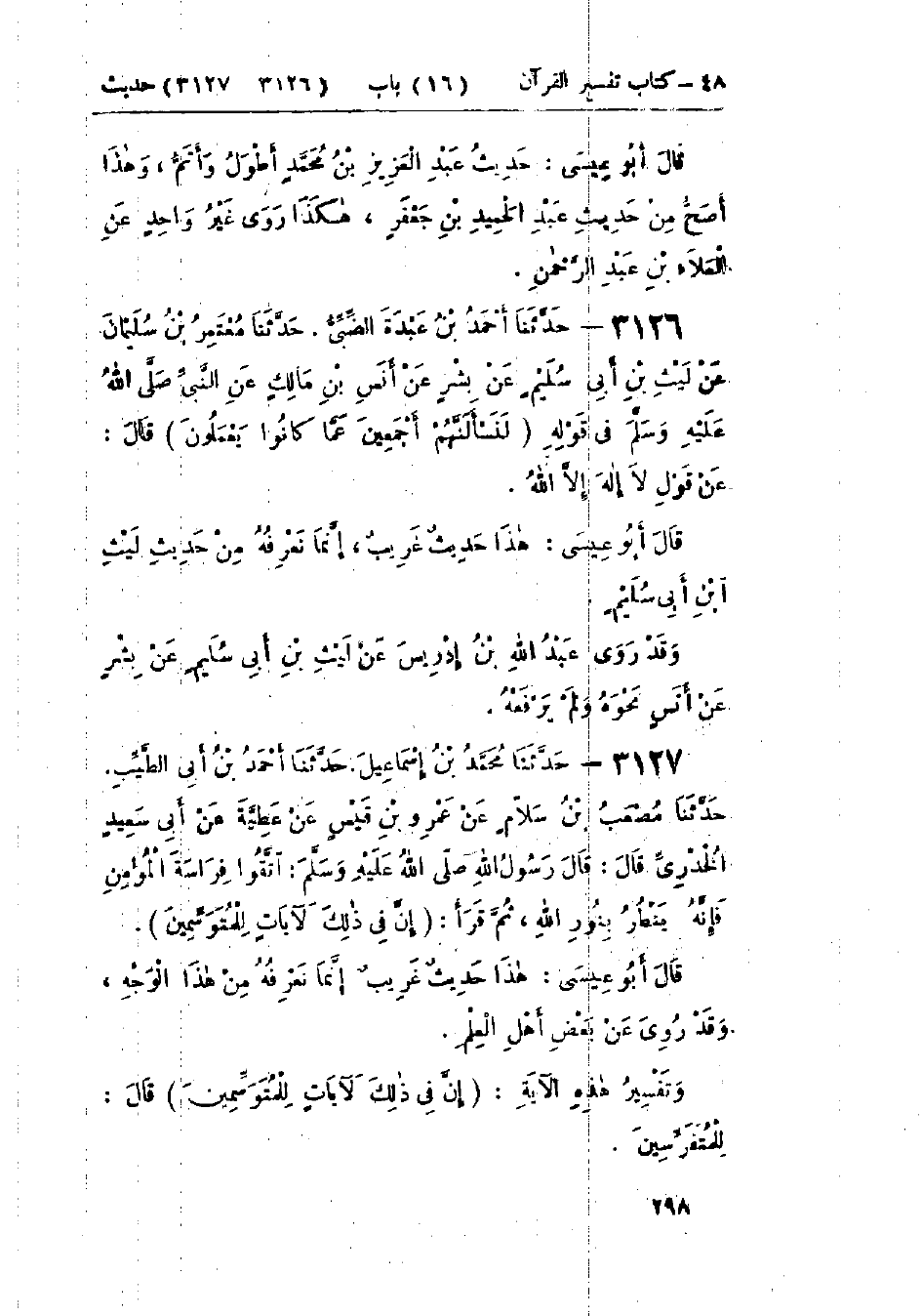 3127 - حَدَّثَنَا مُحَمَّدُ بْنُ إِسْمَاعِيلَ قَالَ: حَدَّثَنَا أَحْمَدُ بْنُ أَبِي الطَّيِّبِ قَالَ: حَدَّثَنَا مُصْعَبُ بْنُ سَلَّامٍ، عَنْ عَمْرِو بْنِ قَيْسٍ، عَنْ عَطِيَّةَ، عَنْ أَبِي سَعِيدٍ الخُدْرِيِّ، قَالَ: قَالَ رَسُولُ اللَّهِ صَلَّى اللَّهُ عَلَيْهِ وَسَلَّمَ: «§اتَّقُوا فِرَاسَةَ المُؤْمِنِ فَإِنَّهُ يَنْظُرُ بِنُورِ اللَّهِ»، ثُمَّ قَرَأَ: {إِنَّ فِي ذَلِكَ لَآيَاتٍ لِلْمُتَوَسِّمِينَ} [الحجر: 75]: " هَذَا حَدِيثٌ غَرِيبٌ، إِنَّمَا نَعْرِفُهُ مِنْ هَذَا الوَجْهِ وَقَدْ رُوِيَ عَنْ بَعْضِ أَهْلِ العِلْمِ فِي تَفْسِيرِ هَذِهِ الآيَةِ: {إِنَّ فِي ذَلِكَ لَآيَاتٍ لِلْمُتَوَسِّمِينَ} [الحجر: 75] قَالَ: لِلْمُتَفَرِّسِينَ "