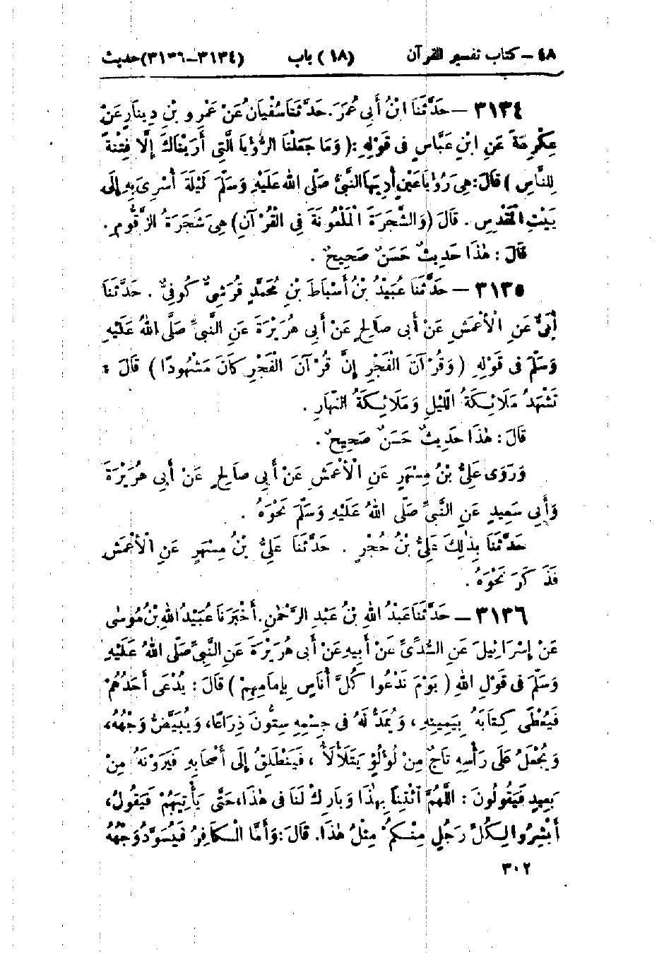 3134 - حَدَّثَنَا ابْنُ أَبِي عُمَرَ قَالَ: حَدَّثَنَا سُفْيَانُ، عَنْ عَمْرِو بْنِ دِينَارٍ، عَنْ عِكْرِمَةَ، عَنْ ابْنِ عَبَّاسٍ، فِي قَوْلِهِ تَعَالَى: {وَمَا جَعَلْنَا الرُّؤْيَا الَّتِي أَرَيْنَاكَ إِلَّا فِتْنَةً لِلنَّاسِ} [الإسراء: 60] قَالَ: «§هِيَ رُؤْيَا عَيْنٍ أُرِيَهَا النَّبِيُّ صَلَّى اللَّهُ عَلَيْهِ وَسَلَّمَ لَيْلَةَ أُسْرِيَ بِهِ إِلَى بَيْتِ المَقْدِسِ». قَالَ: {وَالشَّجَرَةَ المَلْعُونَةَ فِي القُرْآنِ} [الإسراء: 60] «هِيَ شَجَرَةُ الزَّقُّومِ». «هَذَا حَدِيثٌ حَسَنٌ صَحِيحٌ»