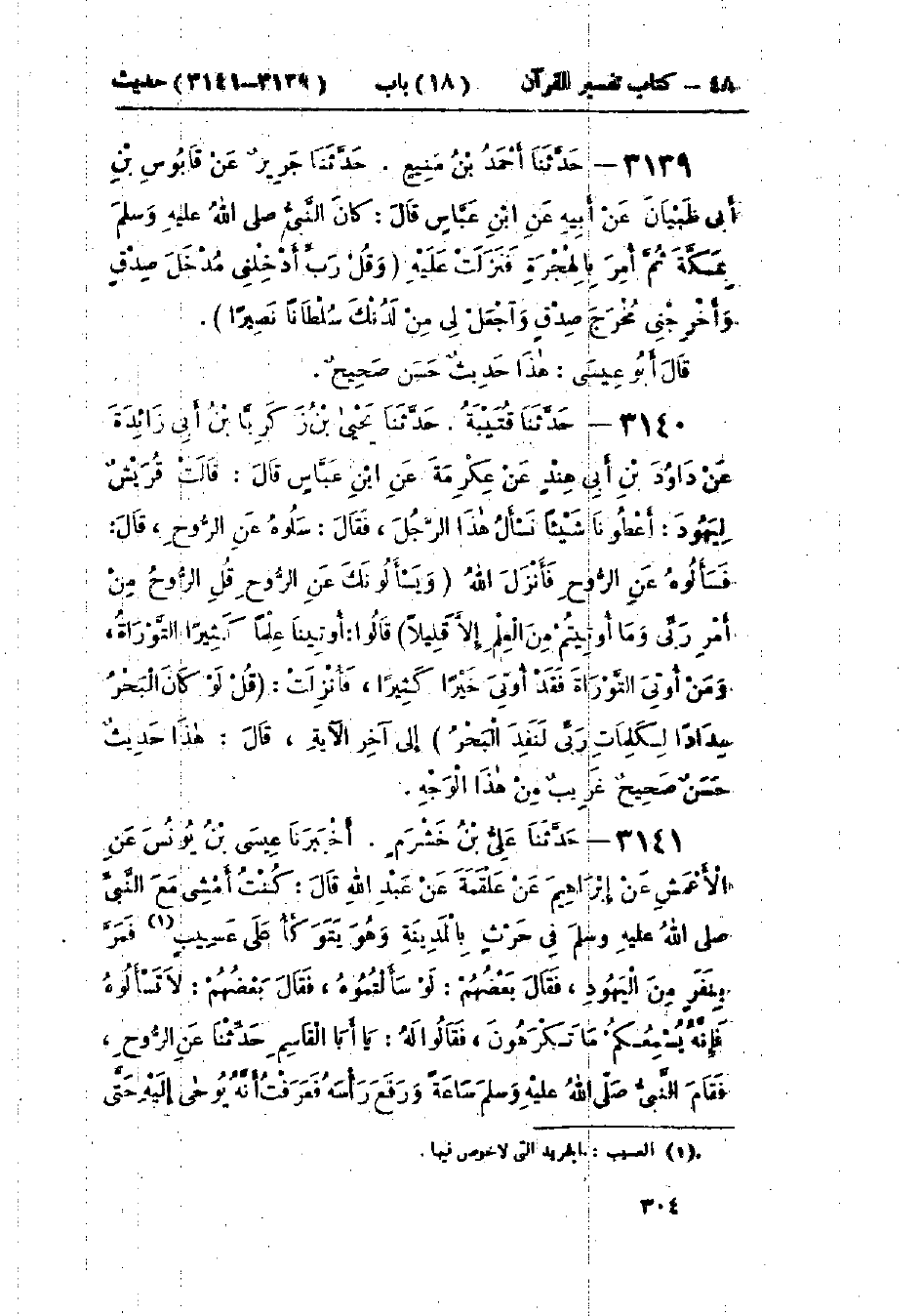 3141 - حَدَّثَنَا عَلِيُّ بْنُ خَشْرَمٍ قَالَ: أَخْبَرَنَا عِيسَى بْنُ يُونُسَ، عَنْ الأَعْمَشِ، عَنْ إِبْرَاهِيمَ، عَنْ عَلْقَمَةَ، عَنْ عَبْدِ اللَّهِ، قَالَ: كُنْتُ أَمْشِي مَعَ النَّبِيِّ صَلَّى اللَّهُ عَلَيْهِ وَسَلَّمَ فِي حَرْثٍ بِالمَدِينَةِ وَهُوَ يَتَوَكَّأُ عَلَى عَسِيبٍ فَمَرَّ بِنَفَرٍ مِنَ اليَهُودِ، فَقَالَ بَعْضُهُمْ: لَوْ سَأَلْتُمُوهُ، فَقَالَ بَعْضُهُمْ: لَا تَسْأَلُوهُ فَإِنَّهُ يُسْمِعُكُمْ مَا تَكْرَهُونَ، فَقَالُوا لَهُ: يَا أَبَا القَاسِمِ حَدِّثْنَا عَنِ الرُّوحِ، فَقَامَ النَّبِيُّ صَلَّى اللَّهُ عَلَيْهِ وَسَلَّمَ سَاعَةً وَرَفَعَ رَأْسَهُ إِلَى السَّمَاءِ فَعَرَفْتُ أَنَّهُ يُوحَى إِلَيْهِ حَتَّى -[305]- صَعِدَ الوَحْيُ، ثُمَّ قَالَ: " {§الرُّوحُ مِنْ أَمْرِ رَبِّي وَمَا أُوتِيتُمْ مِنَ العِلْمِ إِلَّا قَلِيلًا} [الإسراء: 85] ": «هَذَا حَدِيثٌ حَسَنٌ صَحِيحٌ»