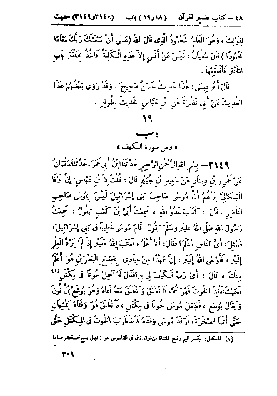 3149 - حَدَّثَنَا ابْنُ أَبِي عُمَرَ قَالَ: حَدَّثَنَا سُفْيَانُ، عَنْ عَمْرِو بْنِ دِينَارٍ، عَنْ سَعِيدِ بْنِ جُبَيْرٍ، قَالَ: قُلْتُ لِابْنِ عَبَّاسٍ: إِنَّ نَوْفًا البِكَالِيَّ يَزْعُمُ أَنَّ مُوسَى صَاحِبَ بني إسرائيل لَيْسَ بِمُوسَى صَاحِبِ الخَضِرِ، قَالَ: كَذَبَ عَدُوُّ اللَّهِ، سَمِعْتُ أُبَيَّ بْنَ كَعْبٍ، يَقُولُ: سَمِعْتُ رَسُولَ اللَّهِ صَلَّى اللَّهُ عَلَيْهِ وَسَلَّمَ يَقُولُ: " قَامَ مُوسَى خَطِيبًا فِي بني إسرائيل، فَسُئِلَ: أَيُّ النَّاسِ أَعْلَمُ؟ فَقَالَ: أَنَا أَعْلَمُ، فَعَتَبَ اللَّهُ عَلَيْهِ إِذْ لَمْ يَرُدَّ العِلْمَ إِلَيْهِ، فَأَوْحَى اللَّهُ إِلَيْهِ أَنَّ عَبْدًا مِنْ عِبَادِي بِمَجْمَعِ البَحْرَيْنِ هُوَ أَعْلَمُ مِنْكَ، قَالَ: أَيْ رَبِّ، فَكَيْفَ لِي بِهِ؟ فَقَالَ لَهُ: §احْمِلْ حُوتًا فِي مِكْتَلٍ فَحَيْثُ تَفْقِدُ الحُوتَ فَهُوَ ثَمَّ، فَانْطَلَقَ وَانْطَلَقَ مَعَهُ فَتَاهُ وَهُوَ يُوشَعُ بْنُ نُونٍ فَجَعَلَ مُوسَى حُوتًا فِي مِكْتَلٍ، فَانْطَلَقَ هُوَ وَفَتَاهُ يَمْشِيَانِ حَتَّى إِذَا أَتَيَا الصَّخْرَةَ، فَرَقَدَ مُوسَى وَفَتَاهُ فَاضْطَرَبَ الحُوتُ فِي المِكْتَلِ حَتَّى -[310]- خَرَجَ مِنَ المِكْتَلِ فَسَقَطَ فِي البَحْرِ "، قَالَ: " وَأَمْسَكَ اللَّهُ عَنْهُ جِرْيَةَ المَاءِ، حَتَّى كَانَ مِثْلَ الطَّاقِ وَكَانَ لِلْحُوتِ سَرَبًا. وَكَانَ لِمُوسَى وَلِفَتَاهُ عَجَبًا، فَانْطَلَقَا بَقِيَّةَ يَوْمِهِمَا وَلَيْلَتِهِمَا وَنُسِّيَ صَاحِبُ مُوسَى أَنْ يُخْبِرَهُ، فَلَمَّا أَصْبَحَ مُوسَى {قَالَ لِفَتَاهُ آتِنَا غَدَاءَنَا لَقَدْ لَقِينَا مِنْ سَفَرِنَا هَذَا نَصَبًا} [الكهف: 62] " قَالَ: " وَلَمْ يَنْصَبْ حَتَّى جَاوَزَ المَكَانَ الَّذِي أُمِرَ بِهِ {قَالَ أَرَأَيْتَ إِذْ أَوَيْنَا إِلَى الصَّخْرَةِ فَإِنِّي نَسِيتُ الحُوتَ وَمَا أَنْسَانِيهُ إِلَّا الشَّيْطَانُ أَنْ أَذْكُرَهُ وَاتَّخَذَ سَبِيلَهُ فِي البَحْرِ عَجَبًا قَالَ} [الكهف: 64] مُوسَى {ذَلِكَ مَا كُنَّا نَبْغِ فَارْتَدَّا عَلَى آثَارِهِمَا قَصَصًا} [الكهف: 64] " قَالَ: «فَكَانَا يَقُصَّانِ آثَارَهُمَا» - قَالَ سُفْيَانُ: يَزْعُمُ نَاسٌ أَنَّ تِلْكَ الصَّخْرَةَ عِنْدَهَا عَيْنُ الحَيَاةِ وَلَا يُصِيبُ مَاؤُهَا مَيِّتًا إِلَّا عَاشَ - قَالَ: «وَكَانَ الحُوتُ قَدْ أُكِلَ مِنْهُ، فَلَمَّا قُطِرَ عَلَيْهِ المَاءُ عَاشَ»، قَالَ: " فَقَصَّا آثَارَهُمَا حَتَّى أَتَيَا الصَّخْرَةَ، فَرَأَى رَجُلًا مُسَجًّى عَلَيْهِ بِثَوْبٍ، فَسَلَّمَ عَلَيْهِ مُوسَى، فَقَالَ: أَنَّى بِأَرْضِكَ السَّلَامُ؟ قَالَ: أَنَا مُوسَى، قَالَ: مُوسَى بني إسرائيل؟ قَالَ: نَعَمْ، قَالَ: يَا مُوسَى إِنَّكَ عَلَى عِلْمٍ مِنْ عِلْمِ اللَّهِ عَلَّمَكَهُ اللَّهُ لَا أَعْلَمُهُ، وَأَنَا عَلَى عِلْمٍ مِنْ عِلْمِ اللَّهِ عَلَّمَنِيهِ لَا تَعْلَمُهُ، فَقَالَ مُوسَى: {هَلْ أَتَّبِعُكَ عَلَى أَنْ تُعَلِّمَنِ مِمَّا عُلِّمْتَ رُشْدًا قَالَ إِنَّكَ لَنْ تَسْتَطِيعَ مَعِيَ صَبْرًا وَكَيْفَ تَصْبِرُ عَلَى مَا لَمْ تُحِطْ بِهِ خُبْرًا قَالَ سَتَجِدُنِي إِنْ شَاءَ اللَّهُ صَابِرًا وَلَا أَعْصِي لَكَ أَمْرًا} [الكهف: 66] قَالَ لَهُ الخَضِرُ: {فَإِنْ اتَّبَعْتَنِي فَلَا تَسْأَلْنِي عَنْ شَيْءٍ حَتَّى أُحْدِثَ لَكَ مِنْهُ -[311]- ذِكْرًا} [الكهف: 70] قَالَ: نَعَمْ، فَانْطَلَقَ الخَضِرُ وَمُوسَى يَمْشِيَانِ عَلَى سَاحِلِ البَحْرِ، فَمَرَّتْ بِهِمَا سَفِينَةٌ فَكَلَّمَاهُمْ أَنْ يَحْمِلُوهُمَا فَعَرَفُوا الخَضِرَ فَحَمَلُوهُمَا بِغَيْرِ نَوْلٍ فَعَمَدَ الخَضِرُ إِلَى لَوْحٍ مِنْ أَلْوَاحِ السَّفِينَةِ فَنَزَعَهُ، فَقَالَ لَهُ مُوسَى: قَوْمٌ حَمَلُونَا بِغَيْرِ نَوْلٍ فَعَمَدْتَ إِلَى سَفِينَتِهِمْ فَخَرَقْتَهَا {لِتُغْرِقَ أَهْلَهَا لَقَدْ جِئْتَ شَيْئً