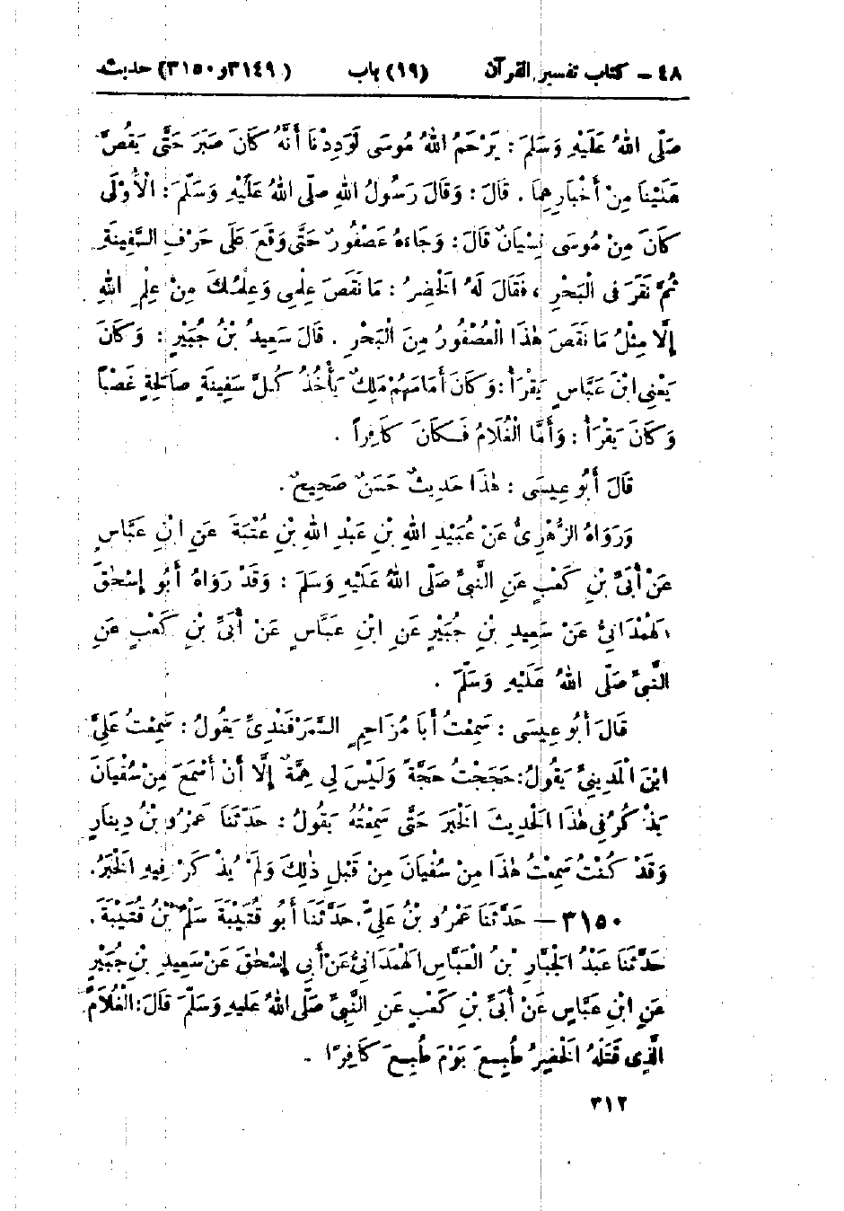 3150 - حَدَّثَنَا عَمْرُو بْنُ عَليٍّ قَالَ: حَدَّثَنَا أَبُو قُتَيْبَةَ سَلْمُ بْنُ قُتَيْبَةَ قَالَ: حَدَّثَنَا عَبْدُ الجَبَّارِ بْنُ الْعَبَّاسِ، عَنْ أَبِي إِسْحَاقَ، عَنْ سَعِيدِ بْنِ جُبَيْرٍ، عَنْ ابْنِ عَبَّاسٍ، عَنْ أُبَيِّ بْنِ كَعْبٍ، عَنِ النَّبِيِّ صَلَّى اللَّهُ عَلَيْهِ وَسَلَّمَ قَالَ: «§الغُلَامُ الَّذِي قَتَلَهُ الخَضِرُ طُبِعَ يَوْمَ طُبِعَ كَافِرًا»: -[313]- «هَذَا حَدِيثٌ حَسَنٌ صَحِيحٌ غَرِيبٌ»
