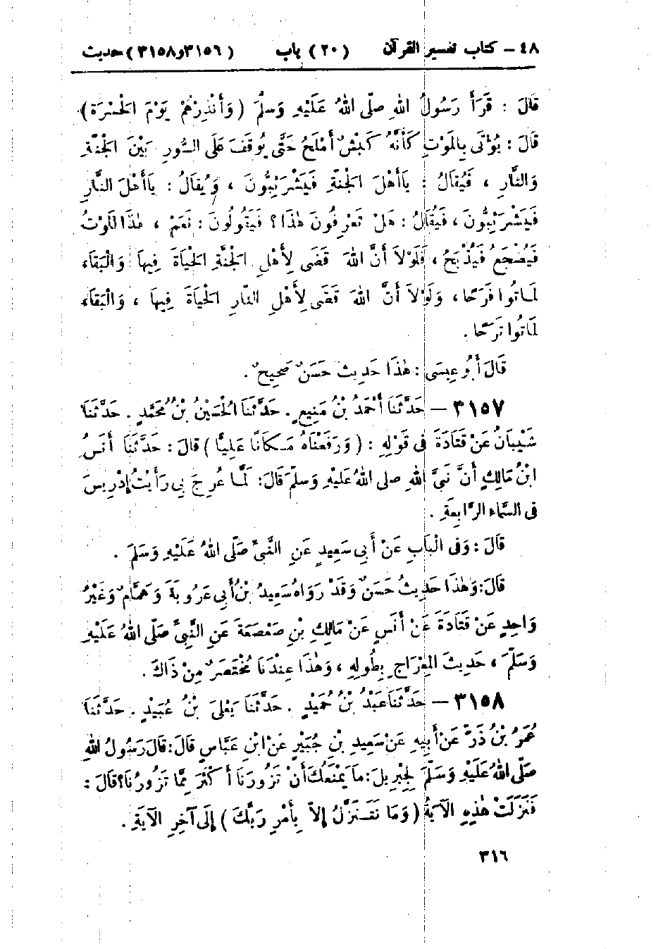 3157 - حَدَّثَنَا أَحْمَدُ بْنُ مَنِيعٍ قَالَ: حَدَّثَنَا الحُسَيْنُ بْنُ مُحَمَّدٍ قَالَ: حَدَّثَنَا شَيْبَانُ، عَنْ قَتَادَةَ، فِي قَوْلِهِ: {وَرَفَعْنَاهُ مَكَانًا عَلِيًّا} [مريم: 57] قَالَ: حَدَّثَنَا أَنَسُ بْنُ مَالِكٍ، أَنَّ نَبِيَّ اللَّهِ صَلَّى اللَّهُ عَلَيْهِ وَسَلَّمَ قَالَ: «§لَمَّا عُرِجَ بِي رَأَيْتُ إِدْرِيسَ فِي السَّمَاءِ الرَّابِعَةِ». وَفِي البَابِ عَنْ أَبِي سَعِيدٍ عَنِ النَّبِيِّ صَلَّى اللَّهُ عَلَيْهِ وَسَلَّمَ: «وَهَذَا حَدِيثٌ حَسَنٌ صَحِيحٌ» وَقَدْ رَوَاهُ سَعِيدُ بْنُ أَبِي عَرُوبَةَ، وَهَمَّامٌ، وَغَيْرُ وَاحِدٍ، عَنْ قَتَادَةَ، عَنْ أَنَسٍ، عَنْ مَالِكِ بْنِ صَعْصَعَةَ، عَنِ النَّبِيِّ صَلَّى اللَّهُ عَلَيْهِ وَسَلَّمَ حَدِيثَ المِعْرَاجِ بِطُولِهِ، «وَهَذَا عِنْدِي مُخْتَصَرٌ مِنْ ذَاكَ»