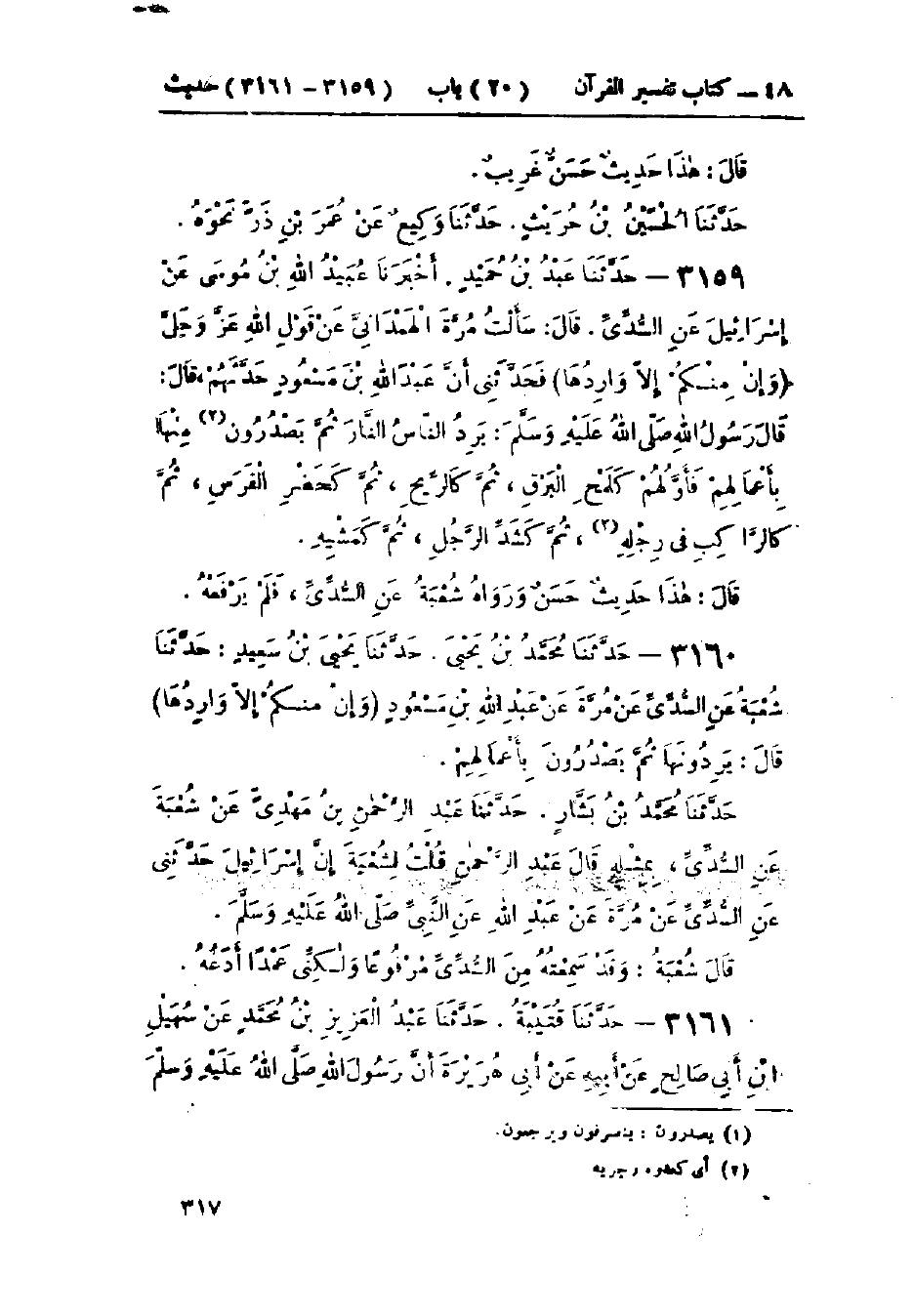 3159 - حَدَّثَنَا عَبْدُ بْنُ حُمَيْدٍ قَالَ: أَخْبَرَنَا عُبَيْدُ اللَّهِ بْنُ مُوسَى، عَنْ إِسْرَائِيلَ، عَنْ السُّدِّيِّ، قَالَ: سَأَلْتُ مُرَّةَ الهَمْدَانِيَّ، عَنْ قَوْلِ اللَّهِ عَزَّ وَجَلَّ: {وَإِنْ مِنْكُمْ إِلَّا وَارِدُهَا} [مريم: 71] فَحَدَّثَنِي أَنَّ عَبْدَ اللَّهِ بْنَ مَسْعُودٍ، حَدَّثَهُمْ، قَالَ: قَالَ رَسُولُ اللَّهِ صَلَّى اللَّهُ عَلَيْهِ وَسَلَّمَ: «§يَرِدُ النَّاسُ النَّارَ ثُمَّ يَصْدُرُونَ مِنْهَا بِأَعْمَالِهِمْ، فَأَوَّلُهُمْ كَلَمْحِ البَرْقِ، ثُمَّ كَالرِّيحِ، ثُمَّ كَحُضْرِ الفَرَسِ، ثُمَّ كَالرَّاكِبِ فِي رَحْلِهِ، ثُمَّ كَشَدِّ الرَّجُلِ، ثُمَّ كَمَشْيِهِ». «هَذَا حَدِيثٌ حَسَنٌ، وَرَوَاهُ شُعْبَةُ، عَنِ السُّدِّيِّ فَلَمْ يَرْفَعْهُ»،