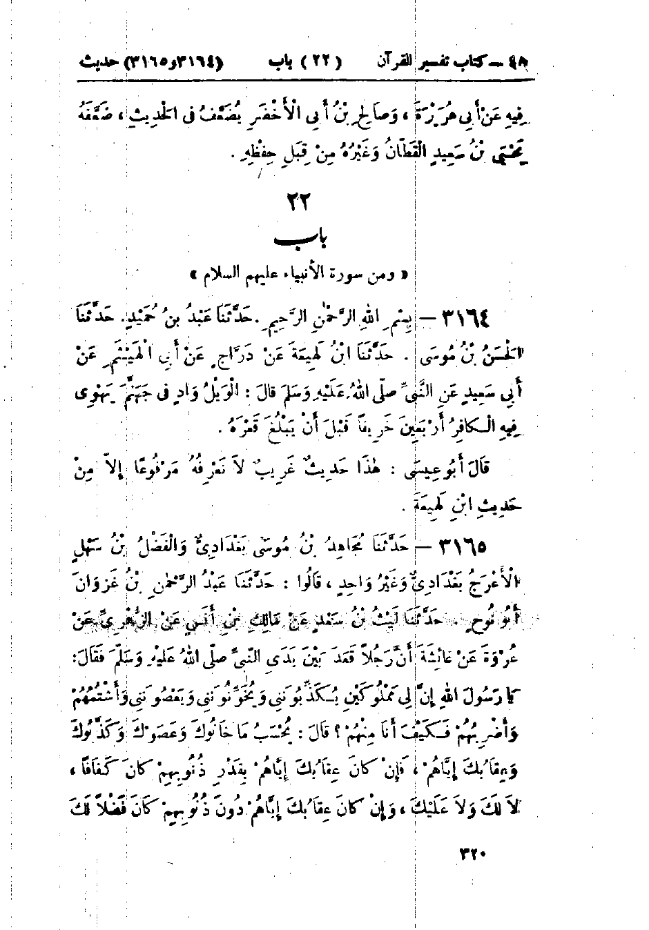 3164 - حَدَّثَنَا عَبْدُ بْنُ حُمَيْدٍ قَالَ: حَدَّثَنَا الحَسَنُ بْنُ مُوسَى قَالَ: حَدَّثَنَا ابْنُ لَهِيعَةَ، عَنْ دَرَّاجٍ، عَنْ أَبِي الهَيْثَمِ، عَنْ أَبِي سَعِيدٍ، عَنِ النَّبِيِّ صَلَّى اللَّهُ عَلَيْهِ وَسَلَّمَ قَالَ: «§الوَيْلُ وَادٍ فِي جَهَنَّمَ يَهْوِي فِيهِ الكَافِرُ أَرْبَعِينَ خَرِيفًا قَبْلَ أَنْ يَبْلُغَ قَعْرَهُ»: «هَذَا حَدِيثٌ غَرِيبٌ لَا نَعْرِفُهُ مَرْفُوعًا إِلَّا مِنْ حَدِيثِ ابْنِ لَهِيعَةَ»