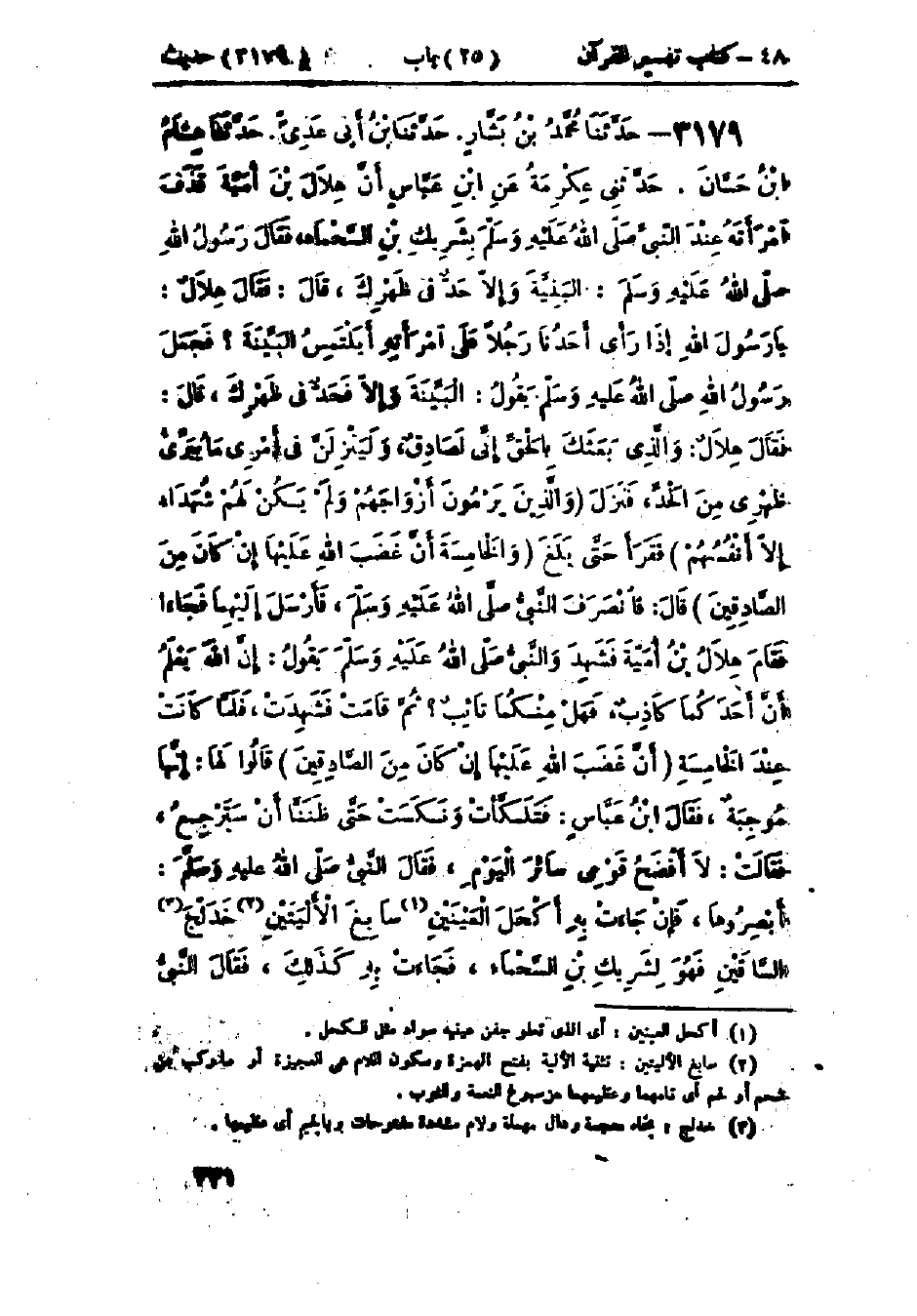3179 - حَدَّثَنَا مُحَمَّدُ بْنُ بَشَّارٍ قَالَ: حَدَّثَنَا ابْنُ أَبِي عَدِيٍّ قَالَ: حَدَّثَنَا هِشَامُ بْنُ حَسَّانَ قَالَ: حَدَّثَنِي عِكْرِمَةُ، عَنْ ابْنِ عَبَّاسٍ، أَنَّ هِلَالَ بْنَ أُمَيَّةَ، قَذَفَ امْرَأَتَهُ عِنْدَ النَّبِيِّ صَلَّى اللَّهُ عَلَيْهِ وَسَلَّمَ بِشَرِيكِ ابْنِ السَّحْمَاءِ فَقَالَ رَسُولُ اللَّهِ صَلَّى اللَّهُ عَلَيْهِ وَسَلَّمَ: «§البَيِّنَةَ وَإِلَّا حَدٌّ فِي ظَهْرِكَ»، قَالَ: فَقَالَ هِلَالٌ: يَا رَسُولَ اللَّهِ، إِذَا رَأَى أَحَدُنَا رَجُلًا عَلَى امْرَأَتِهِ أَيَلْتَمِسُ البَيِّنَةَ؟ فَجَعَلَ رَسُولُ اللَّهِ صَلَّى اللَّهُ عَلَيْهِ وَسَلَّمَ يَقُولُ: «البَيِّنَةَ وَإِلَّا فَحَدٌّ فِي ظَهْرِكَ»، قَالَ: فَقَالَ هِلَالٌ: وَالَّذِي بَعَثَكَ بِالحَقِّ إِنِّي لَصَادِقٌ، وَلَيَنْزِلَنَّ فِي أَمْرِي مَا يُبَرِّئُ ظَهْرِي مِنَ الحَدِّ، فَنَزَلَ {وَالَّذِينَ يَرْمُونَ أَزْوَاجَهُمْ وَلَمْ يَكُنْ لَهُمْ شُهَدَاءُ إِلَّا أَنْفُسُهُمْ} [النور: 6]- فَقَرَأَ حَتَّى بَلَغَ - {وَالخَامِسَةَ أَنَّ غَضَبَ اللَّهِ عَلَيْهَا إِنْ كَانَ مِنَ الصَّادِقِينَ} [النور: 9] قَالَ: فَانْصَرَفَ النَّبِيُّ صَلَّى اللَّهُ عَلَيْهِ وَسَلَّمَ، فَأَرْسَلَ إِلَيْهِمَا فَجَاءَا، فَقَامَ هِلَالُ بْنُ أُمَيَّةَ فَشَهِدَ وَالنَّبِيُّ صَلَّى اللَّهُ عَلَيْهِ وَسَلَّمَ يَقُولُ: «إِنَّ اللَّهَ يَعْلَمُ أَنَّ أَحَدَكُمَا كَاذِبٌ، فَهَلْ مِنْكُمَا تَائِبٌ»؟ ثُمَّ قَامَتْ فَشَهِدَتْ، فَلَمَّا كَانَتْ عِنْدَ الخَامِسَةِ {أَنَّ غَضَبَ اللَّهِ عَلَيْهَا إِنْ كَانَ مِنَ الصَّادِقِينَ} [النور: 9] قَالُوا لَهَا: إِنَّهَا مُوجِبَةٌ، فَقَالَ ابْنُ عَبَّاسٍ: فَتَلَكَّأَتْ وَنَكَسَتْ حَتَّى ظَنَّنَا أَنْ سَتَرْجِعُ، فَقَالَتْ: لَا أَفْضَحُ قَوْمِي سَائِرَ اليَوْمِ، فَقَالَ النَّبِيُّ صَلَّى اللَّهُ عَلَيْهِ وَسَلَّمَ: «أَبْصِرُوهَا، فَإِنْ جَاءَتْ بِهِ أَكْحَلَ العَيْنَيْنِ سَابِغَ الأَلْيَتَيْنِ خَدَلَّجَ السَّاقَيْنِ فَهُوَ لِشَرِيكِ ابْنِ السَّحْمَاءِ»، فَجَاءَتْ بِهِ كَذَلِكَ، فَقَالَ النَّبِيُّ -[332]- صَلَّى اللَّهُ عَلَيْهِ وَسَلَّمَ: «لَوْلَا مَا مَضَى مِنْ كِتَابِ اللَّهِ عَزَّ وَجَلَّ لَكَانَ لَنَا وَلَهَا شَأْنٌ». هَذَا حَدِيثٌ حَسَنٌ غَرِيبٌ وَهَكَذَا رَوَى عَبَّادُ بْنُ مَنْصُورٍ، هَذَا الحَدِيثَ عَنْ عِكْرِمَةَ، عَنْ ابْنِ عَبَّاسٍ، عَنِ النَّبِيِّ صَلَّى اللَّهُ عَلَيْهِ وَسَلَّمَ، وَرَوَاهُ أَيُّوبُ، عَنْ عِكْرِمَةَ مُرْسَلًا، وَلَمْ يَذْكُرْ فِيهِ عَنْ ابْنِ عَبَّاسٍ