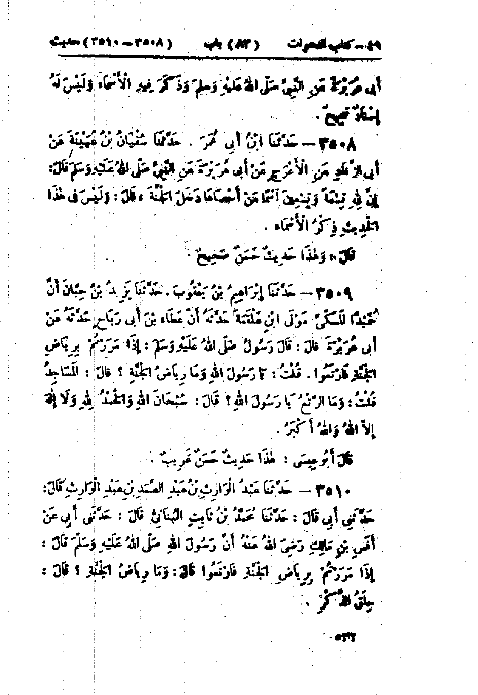 3510 - حَدَّثَنَا عَبْدُ الوَارِثِ بْنُ عَبْدِ الصَّمَدِ بْنِ عَبْدِ الوَارِثِ، قَالَ: حَدَّثَنِي أَبِي، قَالَ: حَدَّثَنَا مُحَمَّدُ بْنُ ثَابِتٍ هُوَ الْبُنَانِيُّ قَالَ: حَدَّثَنِي أَبِي، عَنْ أَنَسِ بْنِ مَالِكٍ، أَنَّ رَسُولَ اللَّهِ صَلَّى اللَّهُ عَلَيْهِ وَسَلَّمَ قَالَ: «§إِذَا مَرَرْتُمْ بِرِيَاضِ الجَنَّةِ فَارْتَعُوا» قَالُوا: وَمَا رِيَاضُ الجَنَّةِ؟ قَالَ: «حِلَقُ الذِّكْرِ».: -[533]- هَذَا حَدِيثٌ حَسَنٌ غَرِيبٌ مِنْ هَذَا الوَجْهِ مِنْ حَدِيثِ ثَابِتٍ عَنْ أَنَسٍ