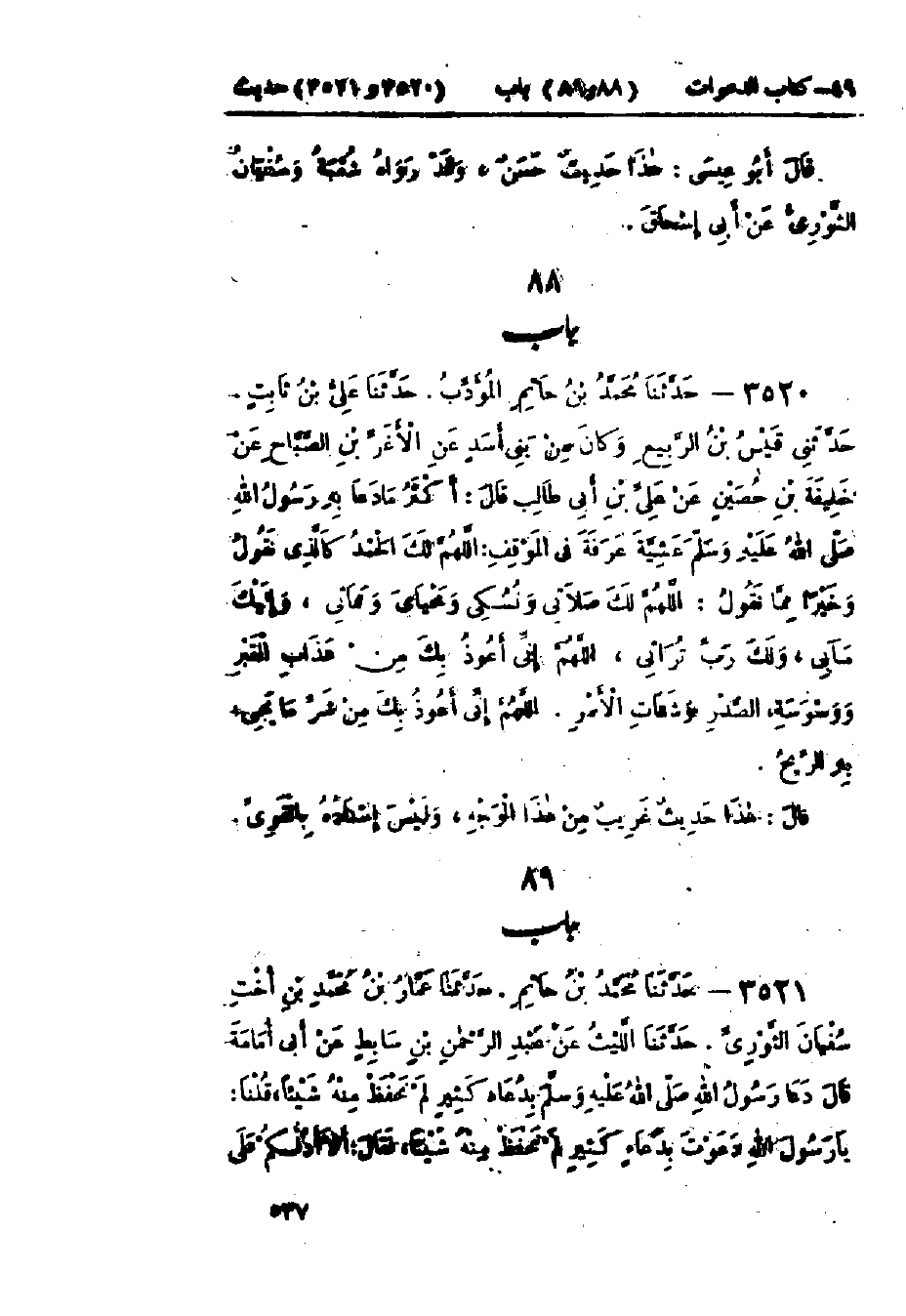 3520 - حَدَّثَنَا مُحَمَّدُ بْنُ حَاتِمٍ المُؤَدِّبُ قَالَ: حَدَّثَنَا عَلِيُّ بْنُ ثَابِتٍ قَالَ: حَدَّثَنِي قَيْسُ بْنُ الرَّبِيعِ، وَكَانَ مِنْ بَنِي أَسَدٍ، عَنْ الأَغَرِّ بْنِ الصَّبَّاحِ، عَنْ خَلِيفَةَ بْنِ حُصَيْنٍ، عَنْ عَلِيِّ بْنِ أَبِي طَالِبٍ، قَالَ: أَكْثَرُ مَا دَعَا بِهِ رَسُولُ اللَّهِ صَلَّى اللَّهُ عَلَيْهِ وَسَلَّمَ عَشِيَّةَ عَرَفَةَ فِي المَوْقِفِ: «§اللَّهُمَّ لَكَ الحَمْدُ كَالَّذِي نَقُولُ وَخَيْرًا مِمَّا نَقُولُ، اللَّهُمَّ لَكَ صَلَاتِي وَنُسُكِي وَمَحْيَايَ وَمَمَاتِي، وَإِلَيْكَ مَآبِي، وَلَكَ رَبِّ تُرَاثِي، اللَّهُمَّ إِنِّي أَعُوذُ بِكَ مِنْ عَذَابِ القَبْرِ وَوَسْوَسَةِ الصَّدْرِ وَشَتَاتِ الأَمْرِ، اللَّهُمَّ إِنِّي أَعُوذُ بِكَ مِنْ شَرِّ مَا يَجِيءُ بِهِ الرِّيحُ».: هَذَا حَدِيثٌ غَرِيبٌ مِنْ هَذَا الوَجْهِ وَلَيْسَ إِسْنَادُهُ بِالقَوِيِّ