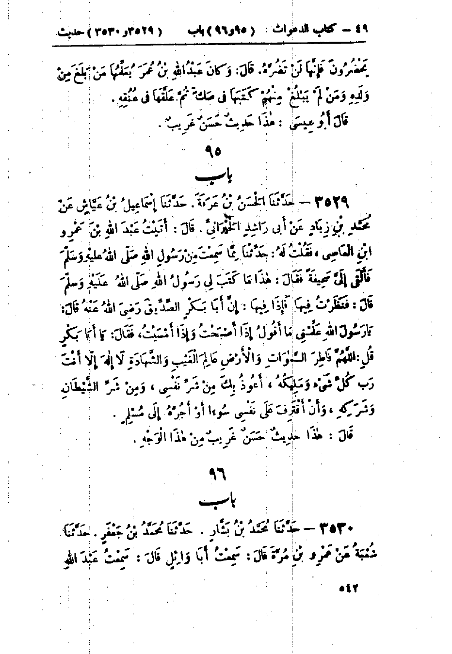 3529 - حَدَّثَنَا الحَسَنُ بْنُ عَرَفَةَ قَالَ: حَدَّثَنَا إِسْمَاعِيلُ بْنُ عَيَّاشٍ، عَنْ مُحَمَّدِ بْنِ زِيَادٍ، عَنْ أَبِي رَاشِدٍ الحُبْرَانِيِّ، قَالَ: أَتَيْتُ عَبْدَ اللَّهِ بْنَ عَمْرِو بْنِ العَاصِ، فَقُلْتُ لَهُ: حَدِّثْنَا مِمَّا سَمِعْتَ مِنْ رَسُولِ اللَّهِ صَلَّى اللَّهُ عَلَيْهِ وَسَلَّمَ، فَأَلْقَى إِلَيَّ صَحِيفَةً، فَقَالَ: هَذَا مَا كَتَبَ لِي رَسُولُ اللَّهِ صَلَّى اللَّهُ عَلَيْهِ وَسَلَّمَ، قَالَ: فَنَظَرْتُ فِيهَا فَإِذَا فِيهَا: إِنَّ أَبَا بَكْرٍ الصِّدِّيقَ قَالَ: يَا رَسُولَ اللَّهِ عَلِّمْنِي مَا أَقُولُ إِذَا أَصْبَحْتُ وَإِذَا أَمْسَيْتُ، فَقَالَ: " يَا أَبَا بَكْرٍ قُلْ: §اللَّهُمَّ فَاطِرَ السَّمَوَاتِ وَالأَرْضِ عَالِمَ الغَيْبِ وَالشَّهَادَةِ لَا إِلَهَ إِلَّا أَنْتَ رَبَّ كُلِّ شَيْءٍ وَمَلِيكَهُ، أَعُوذُ بِكَ مِنْ شَرِّ نَفْسِي، وَمِنْ شَرِّ الشَّيْطَانِ وَشِرْكِهِ، وَأَنْ أَقْتَرِفَ عَلَى نَفْسِي سُوءًا أَوْ أَجُرَّهُ إِلَى مُسْلِمٍ ".: هَذَا حَدِيثٌ حَسَنٌ غَرِيبٌ مِنْ هَذَا الوَجْهِ