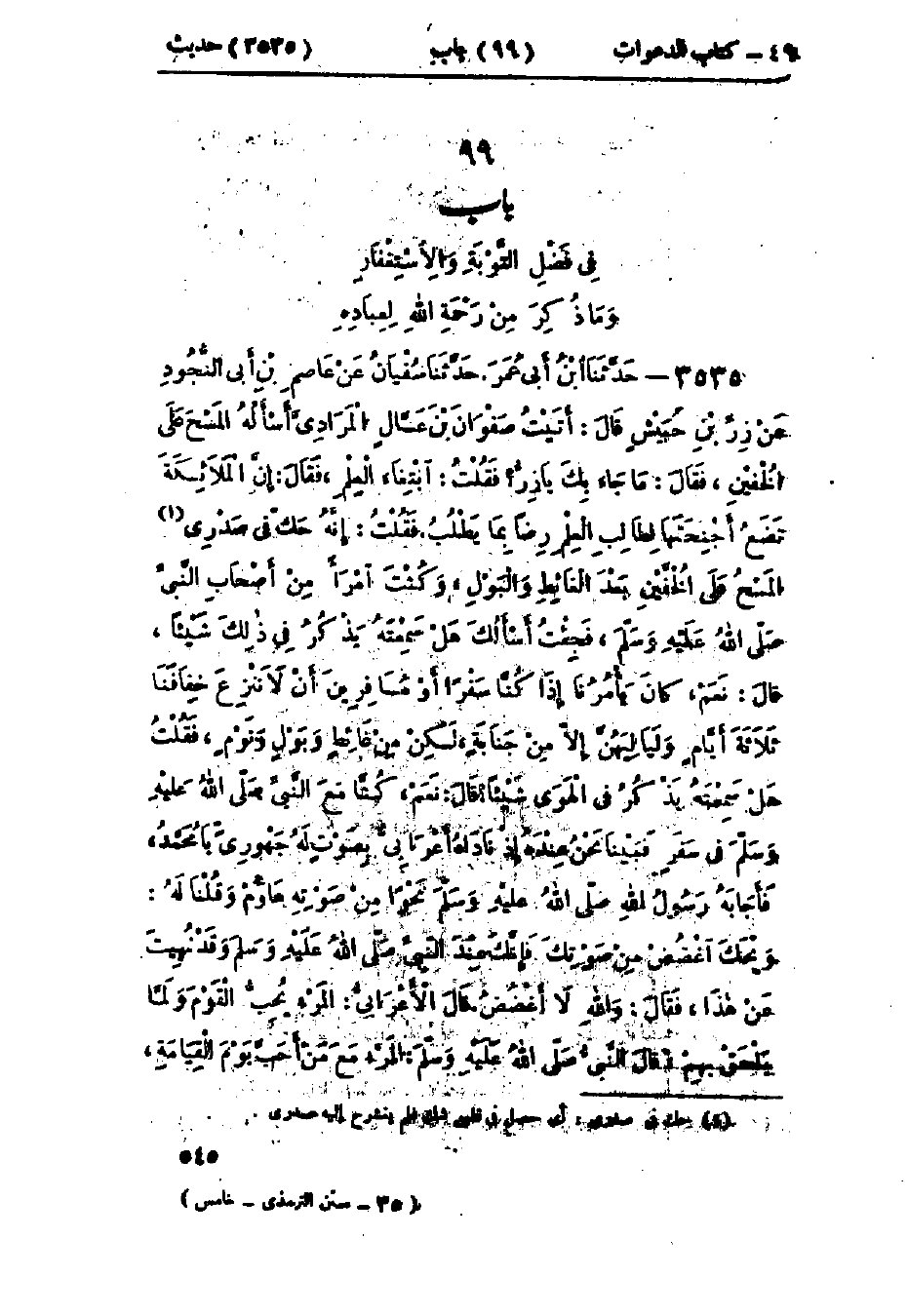3535 - حَدَّثَنَا ابْنُ أَبِي عُمَرَ قَالَ: حَدَّثَنَا سُفْيَانُ، عَنْ عَاصِمِ بْنِ أَبِي النَّجُودِ، عَنْ زِرِّ بْنِ حُبَيْشٍ، قَالَ: أَتَيْتُ صَفْوَانَ بْنَ عَسَّالٍ المُرَادِيَّ، أَسْأَلُهُ عَنِ المَسْحِ عَلَى الخُفَّيْنِ، فَقَالَ: مَا جَاءَ بِكَ يَا زِرُّ؟ فَقُلْتُ: ابْتِغَاءَ العِلْمِ، فَقَالَ: إِنَّ المَلَائِكَةَ لَتَضَعُ أَجْنِحَتَهَا لِطَالِبِ العِلْمِ رِضًا بِمَا يَطْلُبُ، فَقُلْتُ: إِنَّهُ حَكَّ فِي صَدْرِي المَسْحُ عَلَى الخُفَّيْنِ بَعْدَ الغَائِطِ وَالبَوْلِ، وَكُنْتَ امْرَأً مِنْ أَصْحَابِ النَّبِيِّ صَلَّى اللَّهُ عَلَيْهِ وَسَلَّمَ، فَجِئْتُ أَسْأَلُكَ هَلْ سَمِعْتَهُ يَذْكُرُ فِي ذَلِكَ شَيْئًا، قَالَ: نَعَمْ، كَانَ يَأْمُرُنَا إِذَا كُنَّا سَفَرًا أَوْ مُسَافِرِينَ أَنْ لَا نَنْزِعَ خِفَافَنَا ثَلَاثَةَ أَيَّامٍ وَلَيَالِيهِنَّ إِلَّا مِنْ جَنَابَةٍ، لَكِنْ مِنْ غَائِطٍ وَبَوْلٍ وَنَوْمٍ، فَقُلْتُ: هَلْ سَمِعْتَهُ يَذْكُرُ فِي الهَوَى شَيْئًا؟ قَالَ: نَعَمْ، كُنَّا مَعَ النَّبِيِّ صَلَّى اللَّهُ عَلَيْهِ وَسَلَّمَ فِي سَفَرٍ فَبَيْنَا نَحْنُ عِنْدَهُ إِذْ نَادَاهُ أَعْرَابِيٌّ بِصَوْتٍ لَهُ جَهْوَرِيٍّ يَا مُحَمَّدُ، فَأَجَابَهُ رَسُولُ اللَّهِ صَلَّى اللَّهُ عَلَيْهِ وَسَلَّمَ عَلَى نَحْوٍ مِنْ صَوْتِهِ هَاؤُمُ وَقُلْنَا لَهُ: وَيْحَكَ اغْضُضْ مِنْ صَوْتِكَ فَإِنَّكَ عِنْدَ النَّبِيِّ صَلَّى اللَّهُ عَلَيْهِ وَسَلَّمَ وَقَدْ نُهِيتَ عَنْ هَذَا، فَقَالَ: وَاللَّهِ لَا أَغْضُضُ. قَالَ الأَعْرَابِيُّ: المَرْءُ يُحِبُّ القَوْمَ وَلَمَّا يَلْحَقْ بِهِمْ، قَالَ النَّبِيُّ صَلَّى اللَّهُ عَلَيْهِ وَسَلَّمَ: «§المَرْءُ مَعَ مَنْ أَحَبَّ يَوْمَ القِيَامَةِ»، -[546]- فَمَا زَالَ يُحَدِّثُنَا حَتَّى ذَكَرَ بَابًا مِنْ قِبَلِ المَغْرِبِ مَسِيرَةُ عَرْضِهِ، أَوْ يَسِيرُ الرَّاكِبُ فِي عَرْضِهِ أَرْبَعِينَ أَوْ سَبْعِينَ عَامًا، قَالَ سُفْيَانُ: قِبَلَ الشَّامِ خَلَقَهُ اللَّهُ يَوْمَ خَلَقَ السَّمَوَاتِ وَالأَرْضَ مَفْتُوحًا - يَعْنِي لِلتَّوْبَةِ - لَا يُغْلَقُ حَتَّى تَطْلُعَ الشَّمْسُ مِنْهُ.: هَذَا حَدِيثٌ حَسَنٌ صَحِيحٌ