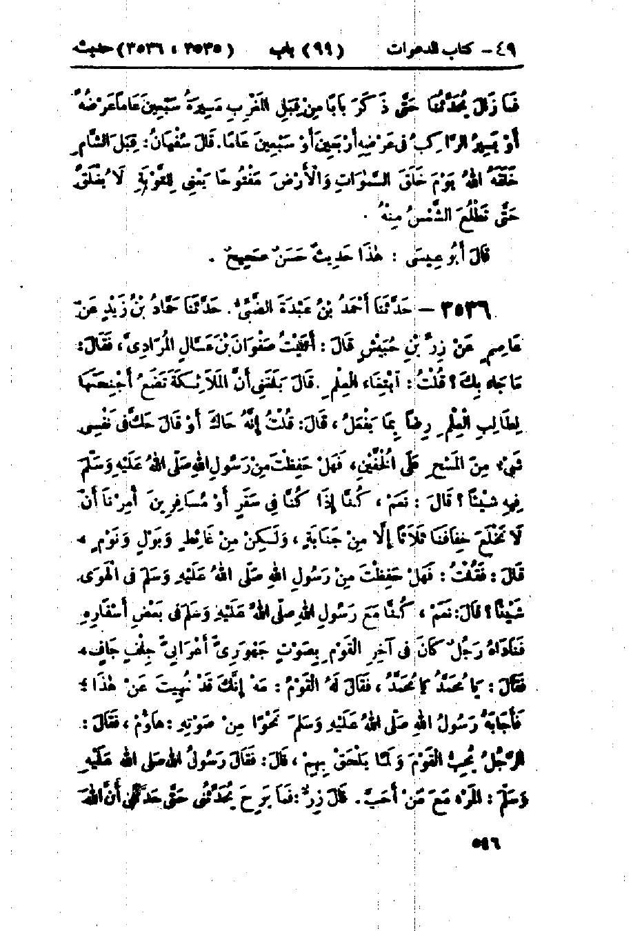 3536 - حَدَّثَنَا أَحْمَدُ بْنُ عَبْدَةَ الضَّبِّيُّ قَالَ: حَدَّثَنَا حَمَّادُ بْنُ زَيْدٍ، عَنْ عَاصِمٍ، عَنْ زِرِّ بْنِ حُبَيْشٍ، قَالَ: أَتَيْتُ صَفْوَانَ بْنَ عَسَّالٍ المُرَادِيَّ، فَقَالَ لِي: مَا جَاءَ بِكَ؟ قُلْتُ: ابْتِغَاءَ العِلْمِ. قَالَ: بَلَغَنِي أَنَّ المَلَائِكَةَ تَضَعُ أَجْنِحَتَهَا لِطَالِبِ العِلْمِ رِضًا بِمَا يَفْعَلُ، قَالَ: قُلْتُ لَهُ: إِنَّهُ حَاكَ، أَوْ قَالَ: حَكَّ فِي نَفْسِي شَيْءٌ مِنَ الْمَسْحِ عَلَى الخُفَّيْنِ، فَهَلْ حَفِظْتَ مِنْ رَسُولِ اللَّهِ صَلَّى اللَّهُ عَلَيْهِ وَسَلَّمَ فِيهِ شَيْئًا؟ قَالَ: نَعَمْ، كُنَّا إِذَا كُنَّا سَفَرًا أَوْ مُسَافِرِينَ أُمِرْنَا أَنْ لَا نَخْلَعَ خِفَافَنَا ثَلَاثًا إِلَّا مِنْ جَنَابَةٍ، وَلَكِنْ مِنْ غَائِطٍ وَبَوْلٍ وَنَوْمٍ، قَالَ: فَقُلْتُ: فَهَلْ حَفِظْتَ مِنْ رَسُولِ اللَّهِ صَلَّى اللَّهُ عَلَيْهِ وَسَلَّمَ فِي الهَوَى شَيْئًا؟ قَالَ: نَعَمْ، كُنَّا مَعَ رَسُولِ اللَّهِ صَلَّى اللَّهُ عَلَيْهِ وَسَلَّمَ فِي بَعْضِ أَسْفَارِهِ فَنَادَاهُ رَجُلٌ كَانَ فِي آخِرِ القَوْمِ بِصَوْتٍ جَهْوَرِيٍّ أَعْرَابِيٌّ جِلْفٌ جَافٍ فَقَالَ: يَا مُحَمَّدُ يَا مُحَمَّدُ، فَقَالَ لَهُ القَوْمُ: مَهْ، إِنَّكَ قَدْ نُهِيتَ عَنْ هَذَا، فَأَجَابَهُ رَسُولُ اللَّهِ صَلَّى اللَّهُ عَلَيْهِ وَسَلَّمَ نَحْوًا مِنْ صَوْتِهِ هَاؤُمُ فَقَالَ: الرَّجُلُ يُحِبُّ القَوْمَ وَلَمَّا يَلْحَقْ بِهِمْ، قَالَ: فَقَالَ رَسُولُ اللَّهِ صَلَّى اللَّهُ عَلَيْهِ وَسَلَّمَ: «§المَرْءُ مَعَ مَنْ أَحَبَّ». قَالَ زِرٌّ: فَمَا بَرِحَ يُحَدِّثُنِي حَتَّى حَدَّثَنِي أَنَّ اللَّهَ -[547]- عَزَّ وَجَلَّ جَعَلَ بِالمَغْرِبِ بَابًا عَرْضُهُ مَسِيرَةُ سَبْعِينَ عَامًا لِلتَّوْبَةِ لَا يُغْلَقُ حَتَّى تَطْلُعَ الشَّمْسُ مِنْ قِبَلِهِ، وَذَلِكَ قَوْلُ اللَّهِ عَزَّ وَجَلَّ {يَوْمَ يَأْتِي بَعْضُ آيَاتِ رَبِّكَ لَا يَنْفَعُ نَفْسًا إِيمَانُهَا} [الأنعام: 158] الآيَةَ.: هَذَا حَدِيثٌ حَسَنٌ صَحِيحٌ