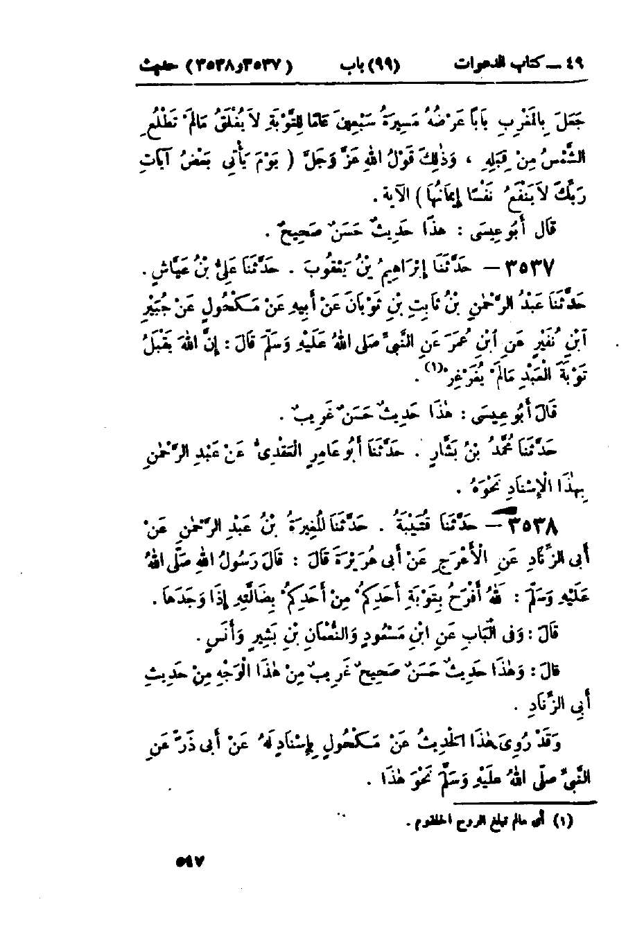 3537 - حَدَّثَنَا إِبْرَاهِيمُ بْنُ يَعْقُوبَ قَالَ: حَدَّثَنَا عَلِيُّ بْنُ عَيَّاشٍ الحِمْصِيُّ قَالَ: حَدَّثَنَا عَبْدُ الرَّحْمَنِ بْنُ ثَابِتِ بْنِ ثَوْبَانَ، عَنْ أَبِيهِ، عَنْ مَكْحُولٍ، عَنْ جُبَيْرِ بْنِ نُفَيْرٍ، عَنْ ابْنِ عُمَرَ، عَنِ النَّبِيِّ صَلَّى اللَّهُ عَلَيْهِ وَسَلَّمَ قَالَ: «إِنَّ §اللَّهَ يَقْبَلُ تَوْبَةَ العَبْدِ مَا لَمْ يُغَرْغِرْ».: هَذَا حَدِيثٌ حَسَنٌ غَرِيبٌ. حَدَّثَنَا مُحَمَّدُ بْنُ بَشَّارٍ قَالَ: حَدَّثَنَا أَبُو عَامِرٍ العَقَدِيُّ، عَنْ عَبْدِ الرَّحْمَنِ بْنُ ثَابِتِ بْنِ ثَوْبَانَ، عَنْ أَبِيهِ، عَنْ مَكْحُولٍ، عَنْ جُبَيْرِ بْنِ نُفَيْرٍ، عَنِ ابْنِ عُمَرَ، عَنِ النَّبِيِّ صَلَّى اللَّهُ عَلَيْهِ وَسَلَّمَ، نَحْوَهُ بِمَعْنَاهُ