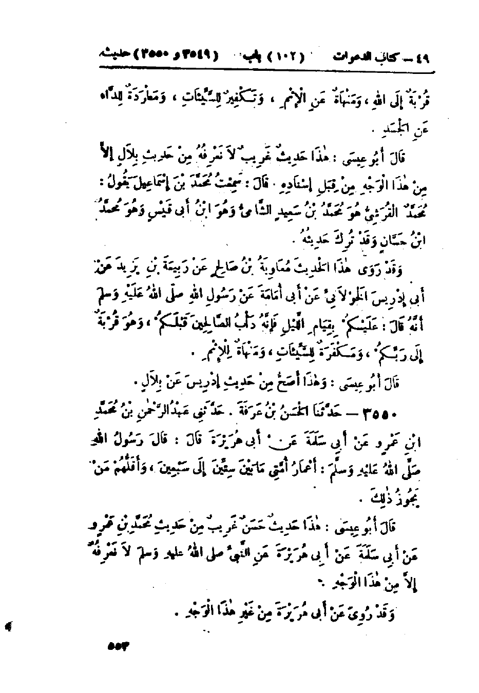 3550 - حَدَّثَنَا الحَسَنُ بْنُ عَرَفَةَ، قَالَ: حَدَّثَنِي عَبْدُ الرَّحْمَنِ بْنُ مُحَمَّدٍ المُحَارِبِيُّ، عَنْ مُحَمَّدِ بْنِ عَمْرٍو، عَنْ أَبِي سَلَمَةَ، عَنْ أَبِي هُرَيْرَةَ، قَالَ: قَالَ رَسُولُ اللَّهِ صَلَّى اللَّهُ عَلَيْهِ وَسَلَّمَ: «§أَعْمَارُ أُمَّتِي مَا بَيْنَ السِّتِّينَ إِلَى السَّبْعِينَ، وَأَقَلُّهُمْ مَنْ يَجُوزُ ذَلِكَ»: هَذَا حَدِيثٌ حَسَنٌ غَرِيبٌ مِنْ حَدِيثِ مُحَمَّدِ بْنِ عَمْرٍو، عَنْ أَبِي سَلَمَةَ، عَنْ أَبِي هُرَيْرَةَ، عَنِ النَّبِيِّ صَلَّى اللَّهُ عَلَيْهِ وَسَلَّمَ لَا نَعْرِفُهُ إِلَّا مِنْ هَذَا الوَجْهِ. وَقَدْ رُوِيَ عَنْ أَبِي هُرَيْرَةَ مِنْ غَيْرِ هَذَا الْوَجْهِ