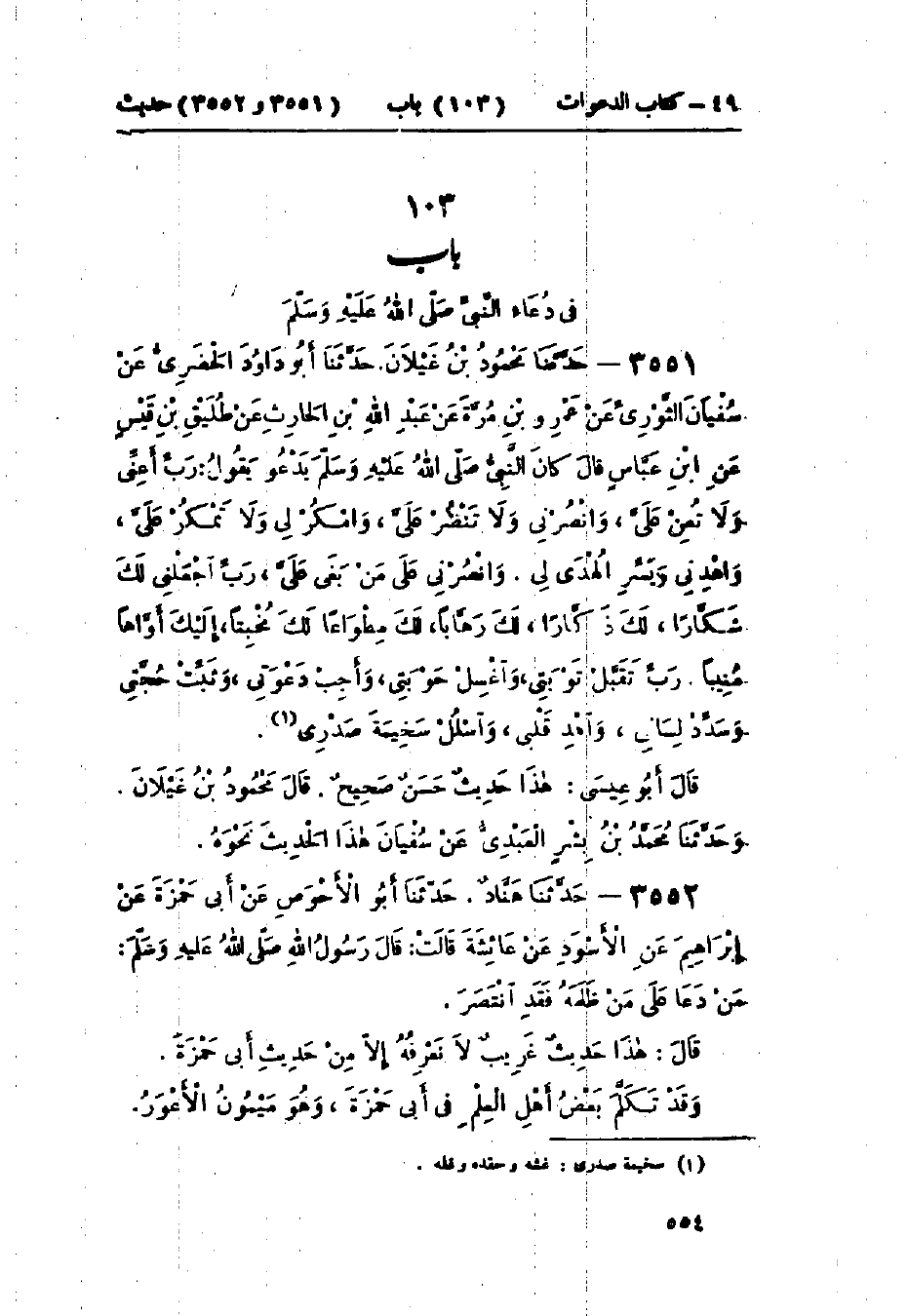 3551 - حَدَّثَنَا مَحْمُودُ بْنُ غَيْلَانَ قَالَ: حَدَّثَنَا أَبُو دَاوُدَ الحَفَرِيُّ، عَنْ سُفْيَانَ الثَّوْرِيِّ، عَنْ عَمْرِو بْنِ مُرَّةَ، عَنْ عَبْدِ اللَّهِ بْنِ الحَارِثِ، عَنْ طُلَيْقِ بْنِ قَيْسٍ، عَنْ ابْنِ عَبَّاسٍ، قَالَ: كَانَ النَّبِيُّ صَلَّى اللَّهُ عَلَيْهِ وَسَلَّمَ يَدْعُو يَقُولُ: «§رَبِّ أَعِنِّي وَلَا تُعِنْ عَلَيَّ، وَانْصُرْنِي وَلَا تَنْصُرْ عَلَيَّ، وَامْكُرْ لِي وَلَا تَمْكُرْ عَلَيَّ، وَاهْدِنِي وَيَسِّرِ الهُدَى لِي، وَانْصُرْنِي عَلَى مَنْ بَغَى عَلَيَّ، رَبِّ اجْعَلْنِي لَكَ شَكَّارًا، لَكَ ذَكَّارًا، لَكَ رَهَّابًا، لَكَ مِطْوَاعًا، لَكَ مُخْبِتًا، إِلَيْكَ أَوَّاهًا مُنِيبًا، رَبِّ تَقَبَّلْ تَوْبَتِي، وَاغْسِلْ حَوْبَتِي، وَأَجِبْ دَعْوَتِي، وَثَبِّتْ حُجَّتِي، وَسَدِّدْ لِسَانِي، وَاهْدِ قَلْبِي، وَاسْلُلْ سَخِيمَةَ صَدْرِي»: هَذَا حَدِيثٌ حَسَنٌ صَحِيحٌ قَالَ: مَحْمُودُ بْنُ غَيْلَانَ، وَحَدَّثَنَا مُحَمَّدُ بْنُ بِشْرٍ العَبْدِيُّ، عَنْ سُفْيَانَ، هَذَا الحَدِيثَ نَحْوَهُ