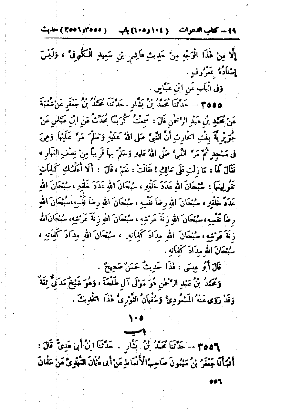 3555 - حَدَّثَنَا مُحَمَّدُ بْنُ بَشَّارٍ قَالَ: حَدَّثَنَا مُحَمَّدُ بْنُ جَعْفَرٍ، عَنْ شُعْبَةَ، عَنْ مُحَمَّدِ بْنِ عَبْدِ الرَّحْمَنِ، قَالَ: سَمِعْتُ كُرَيْبًا، يُحَدِّثُ عَنْ ابْنِ عَبَّاسٍ، عَنْ جُوَيْرِيَةَ بِنْتِ الحَارِثِ، أَنَّ النَّبِيَّ صَلَّى اللَّهُ عَلَيْهِ وَسَلَّمَ مَرَّ عَلَيْهَا وَهِيَ فِي مَسْجِدِهَا ثُمَّ مَرَّ النَّبِيُّ صَلَّى اللَّهُ عَلَيْهِ وَسَلَّمَ بِهَا قَرِيبًا مِنْ نِصْفِ النَّهَارِ، فَقَالَ لَهَا: «مَا زِلْتِ عَلَى حَالِكِ» فَقَالَتْ: نَعَمْ، قَالَ: " §أَلَا أُعَلِّمُكِ كَلِمَاتٍ تَقُولِينَهَا: سُبْحَانَ اللَّهِ عَدَدَ خَلْقِهِ، سُبْحَانَ اللَّهِ عَدَدَ خَلْقِهِ، سُبْحَانَ اللَّهِ عَدَدَ خَلْقِهِ، سُبْحَانَ اللَّهِ رِضَا نَفْسِهِ، سُبْحَانَ اللَّهِ رِضَا نَفْسِهِ، سُبْحَانَ اللَّهِ رِضَا نَفْسِهِ، سُبْحَانَ اللَّهِ زِنَةَ عَرْشِهِ، سُبْحَانَ اللَّهِ زِنَةَ عَرْشِهِ، سُبْحَانَ اللَّهِ زِنَةَ عَرْشِهِ، سُبْحَانَ اللَّهِ مِدَادَ كَلِمَاتِهِ، سُبْحَانَ اللَّهِ مِدَادَ كَلِمَاتِهِ، سُبْحَانَ اللَّهِ مِدَادَ كَلِمَاتِهِ ": هَذَا حَدِيثٌ حَسَنٌ صَحِيحٌ وَمُحَمَّدُ بْنُ عَبْدِ الرَّحْمَنِ هُوَ مَوْلَى آلِ طَلْحَةَ، وَهُوَ شَيْخٌ مَدَينِيٌّ ثِقَةٌ، وَقَدْ رَوَى عَنْهُ المَسْعُودِيُّ، وَسُفْيَانُ الثَّوْرِيُّ، هَذَا الحَدِيثَ