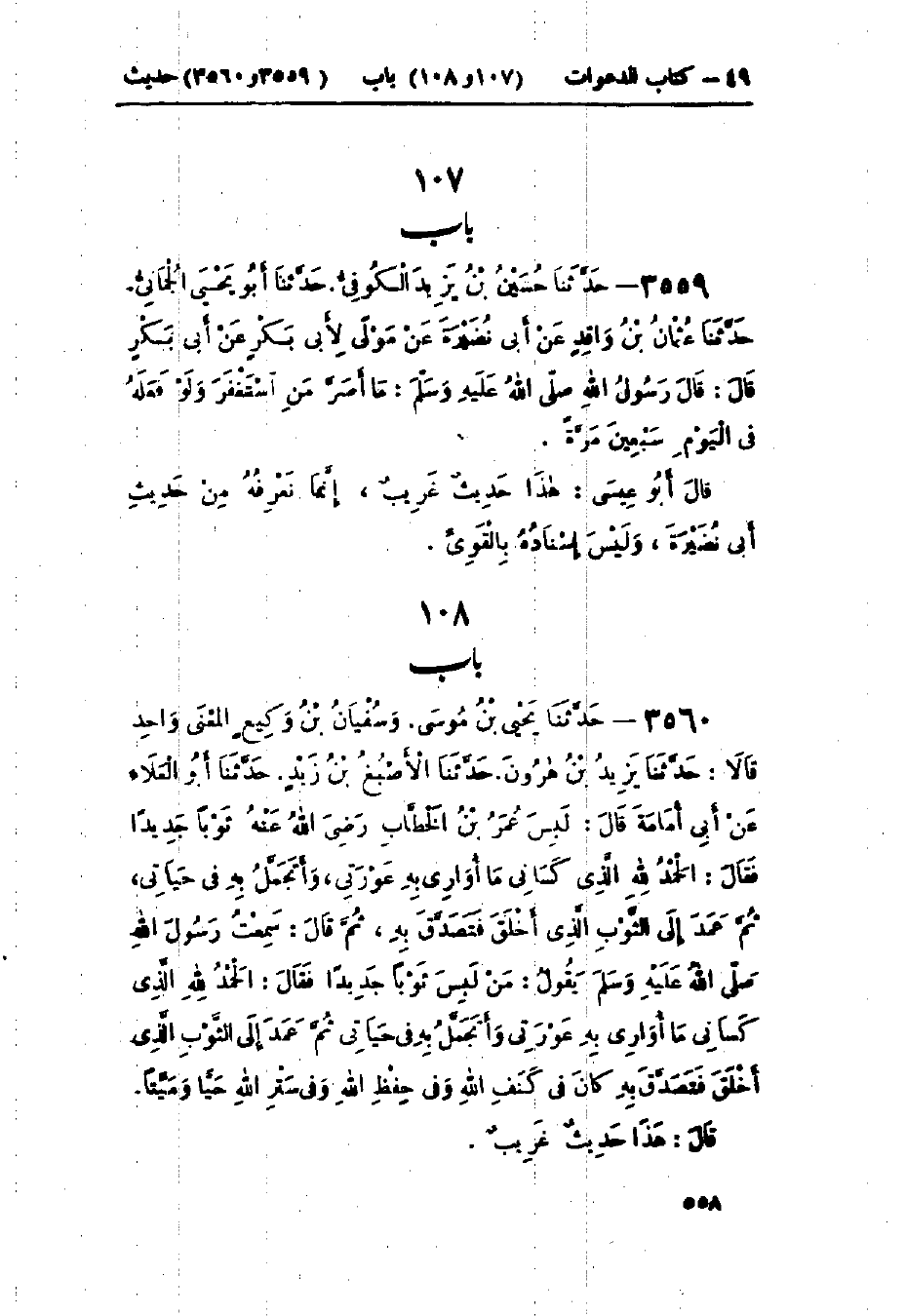 3560 - حَدَّثَنَا يَحْيَى بْنُ مُوسَى، وَسُفْيَانُ بْنُ وَكِيعٍ، المَعْنَى وَاحِدٌ، قَالَا: حَدَّثَنَا يَزِيدُ بْنُ هَارُونَ قَالَ: حَدَّثَنَا الأَصْبَغُ بْنُ زَيْدٍ قَالَ: حَدَّثَنَا أَبُو العَلَاءِ، عَنْ أَبِي أُمَامَةَ، قَالَ: لَبِسَ عُمَرُ بْنُ الخَطَّابِ، ثَوْبًا جَدِيدًا فَقَالَ: الحَمْدُ لِلَّهِ الَّذِي كَسَانِي مَا أُوَارِي بِهِ عَوْرَتِي، وَأَتَجَمَّلُ بِهِ فِي حَيَاتِي، ثُمَّ عَمَدَ إِلَى الثَّوْبِ الَّذِي أَخْلَقَ فَتَصَدَّقَ بِهِ، ثُمَّ قَالَ: سَمِعْتُ رَسُولَ اللَّهِ صَلَّى اللَّهُ عَلَيْهِ وَسَلَّمَ يَقُولُ: " §مَنْ لَبِسَ ثَوْبًا جَدِيدًا فَقَالَ: الحَمْدُ لِلَّهِ الَّذِي كَسَانِي مَا أُوَارِي بِهِ عَوْرَتِي، وَأَتَجَمَّلُ بِهِ فِي حَيَاتِي ثُمَّ عَمَدَ إِلَى الثَّوْبِ الَّذِي أَخْلَقَ فَتَصَدَّقَ بِهِ كَانَ فِي كَنَفِ اللَّهِ وَفِي حِفْظِ اللَّهِ، وَفِي سَتْرِ اللَّهِ حَيًّا وَمَيِّتًا ": هَذَا حَدِيثٌ غَرِيبٌ -[559]- وَقَدْ رَوَاهُ يَحْيَى بْنُ أَيُّوبَ، عَنْ عُبَيْدِ اللَّهِ بْنِ زَحْرٍ، عَنْ عَلِيِّ بْنِ يَزِيدَ، عَنِ القَاسِمِ، عَنْ أَبِي أُمَامَةَ
