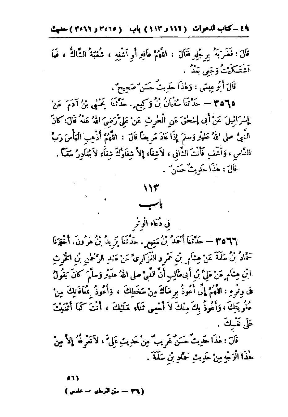 3566 - حَدَّثَنَا أَحْمَدُ بْنُ مَنِيعٍ قَالَ: حَدَّثَنَا يَزِيدُ بْنُ هَارُونَ قَالَ: أَخْبَرَنَا حَمَّادُ بْنُ سَلَمَةَ، عَنْ هِشَامِ بْنِ عَمْرٍو الفَزَارِيِّ، عَنْ عَبْدِ الرَّحْمَنِ بْنِ الحَارِثِ بْنِ هِشَامٍ، عَنْ عَلِيِّ بْنِ أَبِي طَالِبٍ، أَنَّ النَّبِيَّ صَلَّى اللَّهُ عَلَيْهِ وَسَلَّمَ كَانَ §يَقُولُ فِي وِتْرِهِ: «اللَّهُمَّ إِنِّي أَعُوذُ بِرِضَاكَ مِنْ سَخَطِكَ، وَأَعُوذُ بِمُعَافَاتِكَ مِنْ عُقُوبَتِكَ، وَأَعُوذُ بِكَ مِنْكَ لَا أُحْصِي ثَنَاءً عَلَيْكَ، أَنْتَ كَمَا أَثْنَيْتَ عَلَى نَفْسِكَ» قَالَ: هَذَا حَدِيثٌ حَسَنٌ غَرِيبٌ لَا نَعْرِفُهُ إِلَّا مِنْ هَذَا الْوَجْهِ مِنْ حَدِيثِ حَمَّادِ بْنِ سَلَمَةَ