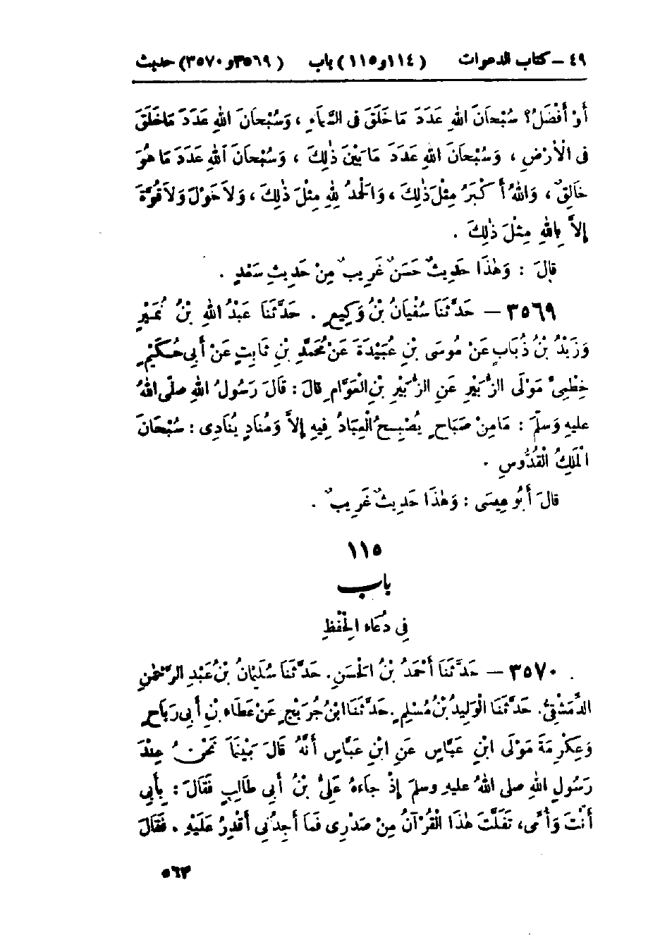 3570 - حَدَّثَنَا أَحْمَدُ بْنُ الحَسَنِ قَالَ: حَدَّثَنَا سُلَيْمَانُ بْنُ عَبْدِ الرَّحْمَنِ الدِّمَشْقِيُّ قَالَ: حَدَّثَنَا الوَلِيدُ بْنُ مُسْلِمٍ قَالَ: حَدَّثَنَا ابْنُ جُرَيْجٍ، عَنْ عَطَاءِ بْنِ أَبِي رَبَاحٍ، وَعِكْرِمَةَ، مَوْلَى ابْنِ عَبَّاسٍ عَنْ ابْنِ عَبَّاسٍ، أَنَّهُ قَالَ: بَيْنَمَا نَحْنُ عِنْدَ رَسُولِ اللَّهِ صَلَّى اللَّهُ عَلَيْهِ وَسَلَّمَ إِذْ جَاءَهُ عَلِيُّ بْنُ أَبِي طَالِبٍ فَقَالَ: بِأَبِي أَنْتَ وَأُمِّي، تَفَلَّتَ هَذَا القُرْآنُ مِنْ صَدْرِي فَمَا أَجِدُنِي أَقْدِرُ عَلَيْهِ، فَقَالَ -[564]- رَسُولُ اللَّهِ صَلَّى اللَّهُ عَلَيْهِ وَسَلَّمَ: «يَا أَبَا الحَسَنِ، أَفَلَا أُعَلِّمُكَ كَلِمَاتٍ يَنْفَعُكَ اللَّهُ بِهِنَّ، وَيَنْفَعُ بِهِنَّ مَنْ عَلَّمْتَهُ، وَيُثَبِّتُ مَا تَعَلَّمْتَ فِي صَدْرِكَ؟» قَالَ: أَجَلْ يَا رَسُولَ اللَّهِ فَعَلِّمْنِي. قَالَ: " §إِذَا كَانَ لَيْلَةُ الجُمُعَةِ، فَإِنْ اسْتَطَعْتَ أَنْ تَقُومَ فِي ثُلُثِ اللَّيْلِ الآخِرِ فَإِنَّهَا سَاعَةٌ مَشْهُودَةٌ، وَالدُّعَاءُ فِيهَا مُسْتَجَابٌ، وَقَدْ قَالَ أَخِي يَعْقُوبُ لِبَنِيهِ {سَوْفَ أَسْتَغْفِرُ لَكُمْ رَبِّي} [يوسف: 98] يَقُولُ: حَتَّى تَأْتِيَ لَيْلَةُ الجُمْعَةِ، فَإِنْ لَمْ تَسْتَطِعْ فَقُمْ فِي وَسَطِهَا، فَإِنْ لَمْ تَسْتَطِعْ فَقُمْ فِي أَوَّلِهَا، فَصَلِّ أَرْبَعَ رَكَعَاتٍ، تَقْرَأُ فِي الرَّكْعَةِ الأُولَى بِفَاتِحَةِ الكِتَابِ وَسُورَةِ يس وَفِي الرَّكْعَةِ الثَّانِيَةِ بِفَاتِحَةِ الكِتَابِ وَحم الدُّخَانِ، وَفِي الرَّكْعَةِ الثَّالِثَةِ بِفَاتِحَةِ الكِتَابِ وَالم تَنْزِيلُ السَّجْدَةِ، وَفِي الرَّكْعَةِ الرَّابِعَةِ بِفَاتِحَةِ الكِتَابِ وَتَبَارَكَ المُفَصَّلِ، فَإِذَا فَرَغْتَ مِنَ التَّشَهُّدِ فَاحْمَدِ اللَّهَ، وَأَحْسِنْ الثَّنَاءَ عَلَى اللَّهِ، وَصَلِّ عَلَيَّ وَأَحْسِنْ، وَعَلَى سَائِرِ النَّبِيِّينَ، وَاسْتَغْفِرْ لِلْمُؤْمِنِينَ وَالمُؤْمِنَاتِ وَلِإِخْوَانِكَ الَّذِينَ سَبَقُوكَ بِالإِيمَانِ، ثُمَّ قُلْ فِي آخِرِ ذَلِكَ: اللَّهُمَّ ارْحَمْنِي بِتَرْكِ المَعَاصِي أَبَدًا مَا أَبْقَيْتَنِي، وَارْحَمْنِي أَنْ أَتَكَلَّفَ مَا لَا يَعْنِينِي، وَارْزُقْنِي حُسْنَ النَّظَرِ فِيمَا يُرْضِيكَ عَنِّي، اللَّهُمَّ بَدِيعَ السَّمَوَاتِ وَالأَرْضِ ذَا الجَلَالِ وَالإِكْرَامِ وَالعِزَّةِ الَّتِي لَا تُرَامُ، أَسْأَلُكَ يَا أَللَّهُ يَا رَحْمَنُ بِجَلَالِكَ وَنُورِ وَجْهِكَ أَنْ تُلْزِمَ قَلْبِي حِفْظَ كِتَابِكَ كَمَا عَلَّمْتَنِي، وَارْزُقْنِي أَنْ أَتْلُوَهُ عَلَى النَّحْوِ الَّذِي يُرْضِيكَ عَنِّيَ، اللَّهُمَّ بَدِيعَ السَّمَوَاتِ وَالأَرْضِ ذَا الجَلَالِ وَالإِكْرَامِ وَالعِزَّةِ الَّتِي لَا تُرَامُ، أَسْأَلُكَ يَا أَللَّهُ يَا رَحْمَنُ بِجَلَالِكَ وَنُورِ وَجْهِكَ أَنْ تُنَوِّرَ بِكِتَابِكَ بَصَرِي، وَأَنْ تُطْلِقَ بِهِ لِسَانِي، وَأَنْ تُفَرِّجَ بِهِ عَنْ قَلْبِي، وَأَنْ تَشْرَحَ بِهِ صَدْرِي، وَأَنْ تَغْسِلَ بِهِ بَدَنِي، فَإِنَّهُ لَا يُعِينُنِي -[565]- عَلَى الحَقِّ غَيْرُكَ وَلَا يُؤْتِيهِ إِلَّا أَنْتَ، وَلَا حَوْلَ وَلَا قُوَّةَ إِلَّا بِاللَّهِ العَلِيِّ العَظِيمِ، يَا أَبَا الحَسَنِ فَافْعَلْ ذَلِكَ ثَلَاثَ جُمَعٍ أَوْ خَمْسًا أَوْ سَبْعًا تُجَبْ بِإِذْنِ اللَّهِ، وَالَّذِي بَعَثَنِي بِالحَقِّ مَا أَخْطَأَ مُؤْمِنًا قَطُّ " قَالَ عَبْدُ اللَّهِ بْنُ عَبَّاسٍ: فَوَاللَّهِ مَا لَبِثَ عَلِيٌّ إِلَّا خَمْسًا أَوْ سَبْعًا حَتَّى جَاءَ رَسُولَ اللَّهِ صَلَّى اللَّهُ عَلَيْهِ وَسَلَّمَ فِي مِثْلِ ذَلِكَ المَجْلِسِ فَقَالَ: يَا رَسُولَ اللَّهِ، إِنِّي كُنْتُ فِيمَا خَلَا لَا آخُذُ إِلَّا أَرْبَعَ آيَاتٍ أَوْ نَحْوَهُنَّ، فَإِذَا قَ