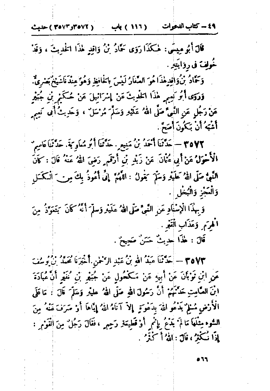 3572 - حَدَّثَنَا أَحْمَدُ بْنُ مَنِيعٍ قَالَ: حَدَّثَنَا أَبُو مُعَاوِيَةَ قَالَ: حَدَّثَنَا عَاصِمٌ الأَحْوَلُ، عَنْ أَبِي عُثْمَانَ، عَنْ زَيْدِ بْنِ أَرْقَمَ، قَالَ: كَانَ النَّبِيُّ صَلَّى اللَّهُ عَلَيْهِ وَسَلَّمَ يَقُولُ: «§اللَّهُمَّ إِنِّي أَعُوذُ بِكَ مِنَ الكَسَلِ وَالعَجْزِ وَالبُخْلِ»