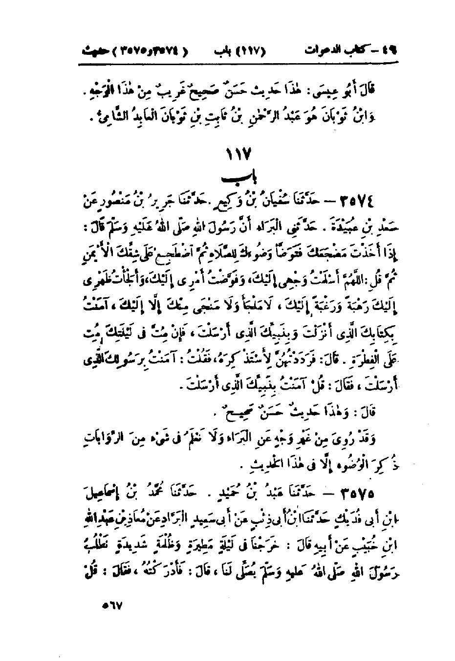 3574 - حَدَّثَنَا سُفْيَانُ بْنُ وَكِيعٍ قَالَ: حَدَّثَنَا جَرِيرٌ، عَنْ مَنْصُورٍ، عَنْ سَعْدِ بْنِ عُبَيْدَةَ قَالَ: حَدَّثَنِي البَرَاءُ، أَنَّ رَسُولَ اللَّهِ صَلَّى اللَّهُ عَلَيْهِ وَسَلَّمَ قَالَ: " §إِذَا أَخَذْتَ مَضْجَعَكَ فَتَوَضَّأْ وُضُوءَكَ لِلصَّلَاةِ، ثُمَّ اضْطَجِعْ عَلَى شِقِّكَ الأَيْمَنِ، ثُمَّ قُلْ: اللَّهُمَّ أَسْلَمْتُ وَجْهِي إِلَيْكَ، وَفَوَّضْتُ أَمْرِي إِلَيْكَ، وَأَلْجَأْتُ ظَهْرِي إِلَيْكَ، رَغْبَةً وَرَهْبَةً إِلَيْكَ، لَا مَلْجَأَ وَلَا مَنْجَا مِنْكَ إِلَّا إِلَيْكَ، آمَنْتُ بِكِتَابِكَ الَّذِي أَنْزَلْتَ، وَبِنَبِيِّكَ الَّذِي أَرْسَلْتَ، فَإِنْ مُتَّ فِي لَيْلَتِكَ مُتَّ عَلَى الفِطْرَةِ "، قَالَ: فَرَدَدْتُهُنَّ لِأَسْتَذْكِرَهُ، فَقُلْتُ: آمَنْتُ بِرَسُولِكَ الَّذِي أَرْسَلْتَ، فَقَالَ: " قُلْ: آمَنْتُ بِنَبِيِّكَ الَّذِي أَرْسَلْتَ ". وَهَذَا حَدِيثٌ حَسَنٌ صَحِيحٌ وَقَدْ رُوِيَ مِنْ غَيْرِ وَجْهٍ عَنِ البَرَاءِ وَلَا نَعْلَمُ فِي شَيْءٍ مِنَ الرِّوَايَاتِ ذِكْرَ الوُضُوءِ إِلَّا فِي هَذَا الحَدِيثِ