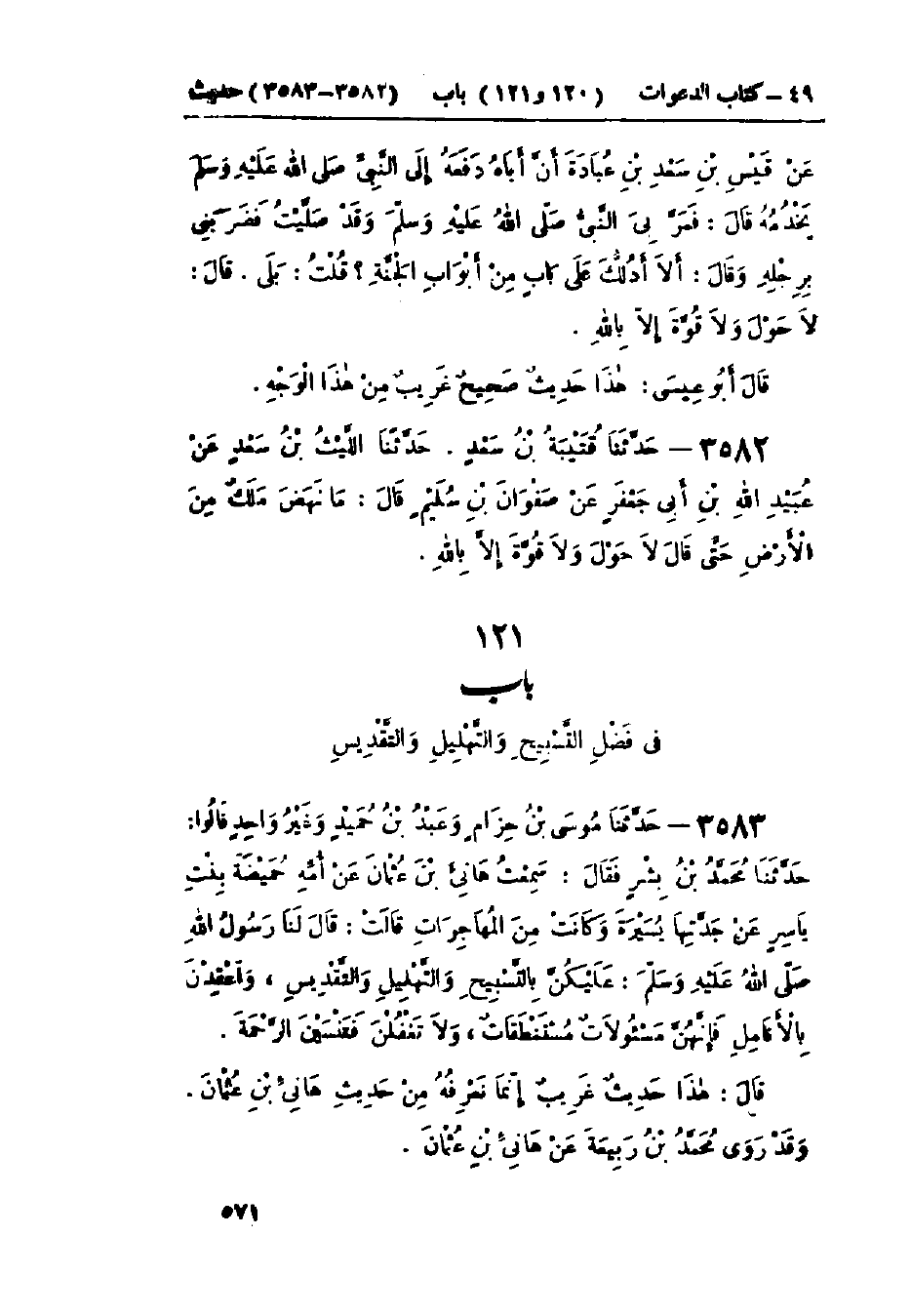 3583 - حَدَّثَنَا مُوسَى بْنُ حِزَامٍ، وَعَبْدُ بْنُ حُمَيْدٍ، وَغَيْرُ وَاحِدٍ، قَالُوا: حَدَّثَنَا مُحَمَّدُ بْنُ بِشْرٍ، قَالَ: سَمِعْتُ هَانِئَ بْنَ عُثْمَانَ، عَنْ أُمِّهِ حُمَيْضَةَ بِنْتِ يَاسِرٍ، عَنْ جَدَّتِهَا يُسَيْرَةَ، وَكَانَتْ مِنْ المُهَاجِرَاتِ، قَالَتْ: قَالَ لَنَا رَسُولُ اللَّهِ صَلَّى اللَّهُ عَلَيْهِ وَسَلَّمَ: «§عَلَيْكُنَّ بِالتَّسْبِيحِ وَالتَّهْلِيلِ وَالتَّقْدِيسِ، وَاعْقِدْنَ بِالأَنَامِلِ فَإِنَّهُنَّ مَسْئُولَاتٌ مُسْتَنْطَقَاتٌ، وَلَا تَغْفُلْنَ فَتَنْسَيْنَ الرَّحْمَةَ». «هَذَا حَدِيثٌ إِنَّمَا نَعْرِفُهُ مِنْ حَدِيثِ هَانِئِ بْنِ عُثْمَانَ» وَقَدْ رَوَاهُ مُحَمَّدُ بْنُ رَبِيعَةَ، عَنْ هَانِئِ بْنِ عُثْمَانَ