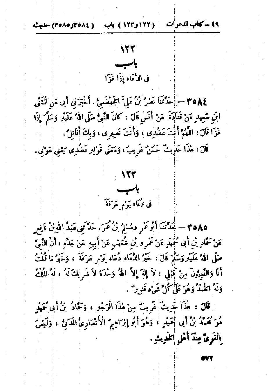 3584 - حَدَّثَنَا نَصْرُ بْنُ عَلِيٍّ الجَهْضَمِيُّ قَالَ: أَخْبَرَنِي أَبِي، عَنْ المُثَنَّى بْنِ سَعِيدٍ، عَنْ قَتَادَةَ، عَنْ أَنَسٍ، قَالَ: كَانَ النَّبِيُّ صَلَّى اللَّهُ عَلَيْهِ وَسَلَّمَ إِذَا غَزَا، قَالَ: «§اللَّهُمَّ أَنْتَ عَضُدِي، وَأَنْتَ نَصِيرِي وَبِكَ أُقَاتِلُ». هَذَا حَدِيثٌ حَسَنٌ غَرِيبٌ