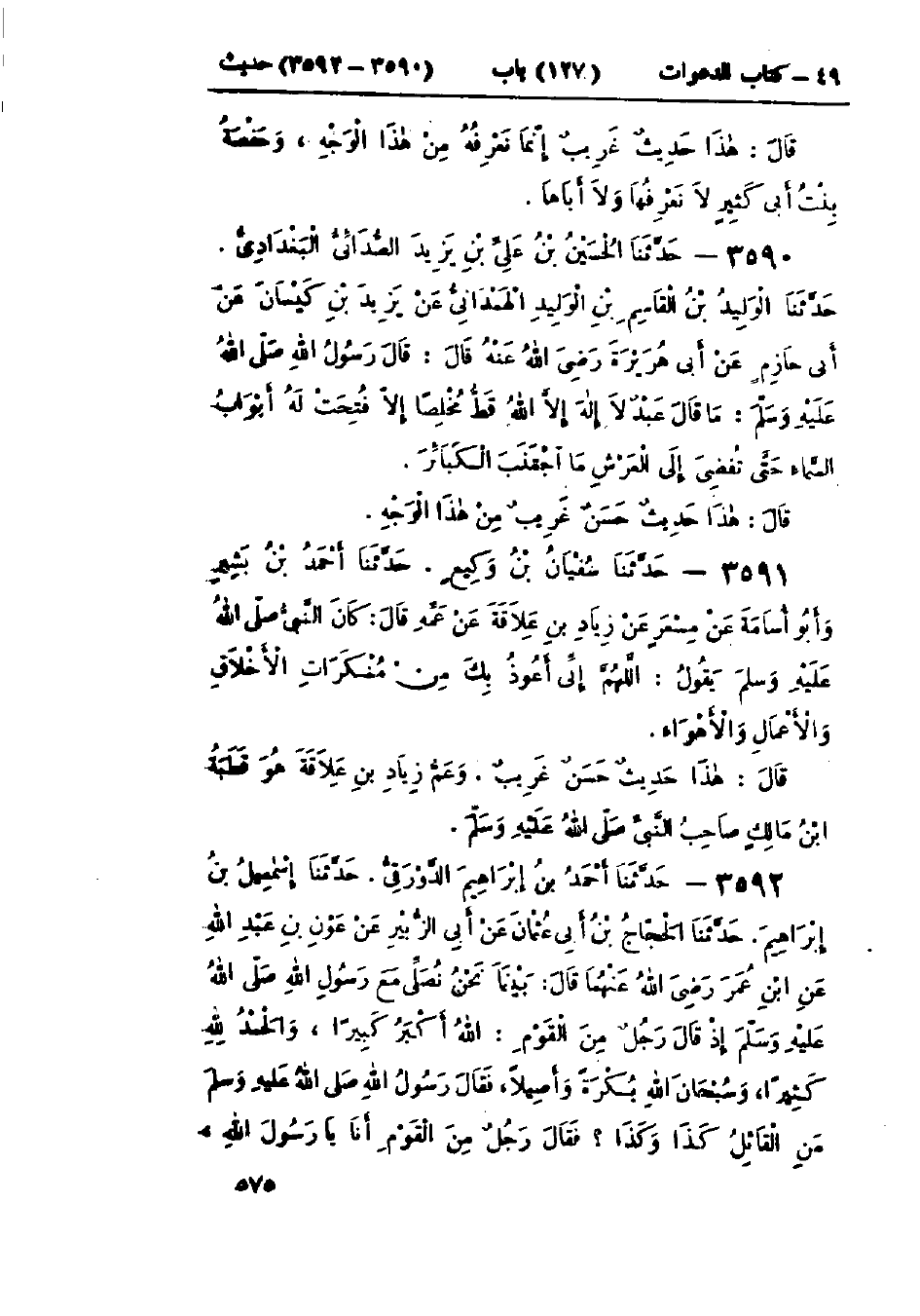 3592 - حَدَّثَنَا أَحْمَدُ بْنُ إِبْرَاهِيمَ الدَّوْرَقِيُّ قَالَ: حَدَّثَنَا إِسْمَاعِيلُ بْنُ إِبْرَاهِيمَ قَالَ: حَدَّثَنَا الحَجَّاجُ بْنُ أَبِي عُثْمَانَ، عَنْ أَبِي الزُّبَيْرِ، عَنْ عَوْنِ بْنِ عَبْدِ اللَّهِ، عَنْ ابْنِ عُمَرَ، قَالَ: بَيْنَا نَحْنُ نُصَلِّي مَعَ رَسُولِ اللَّهِ صَلَّى اللَّهُ عَلَيْهِ وَسَلَّمَ، إِذْ قَالَ رَجُلٌ مِنَ القَوْمِ: اللَّهُ أَكْبَرُ كَبِيرًا، وَالحَمْدُ لِلَّهِ كَثِيرًا، وَسُبْحَانَ اللَّهِ بُكْرَةً وَأَصِيلًا، فَقَالَ رَسُولُ اللَّهِ صَلَّى اللَّهُ عَلَيْهِ وَسَلَّمَ: «مَنِ القَائِلُ كَذَا وَكَذَا؟» فَقَالَ رَجُلٌ مِنَ القَوْمِ: أَنَا يَا رَسُولَ اللَّهِ، -[576]- قَالَ: «§عَجِبْتُ لَهَا فُتِحَتْ لَهَا أَبْوَابُ السَّمَاءِ» قَالَ ابْنُ عُمَرَ: «مَا تَرَكْتُهُنَّ مُنْذُ سَمِعْتُ مِنْ رَسُولِ اللَّهِ صَلَّى اللَّهُ عَلَيْهِ وَسَلَّمَ»: «هَذَا حَدِيثٌ حَسَنٌ صَحِيحٌ غَرِيبٌ مِنْ هَذَا الوَجْهِ» وَحَجَّاجُ بْنُ أَبِي عُثْمَانَ هُوَ: حَجَّاجُ بْنُ مَيْسَرَةَ الصَّوَّافُ وَيُكْنَى أَبَا الصَّلْتِ، وَهُوَ ثِقَةٌ عِنْدَ أَهْلِ الحَدِيثِ "