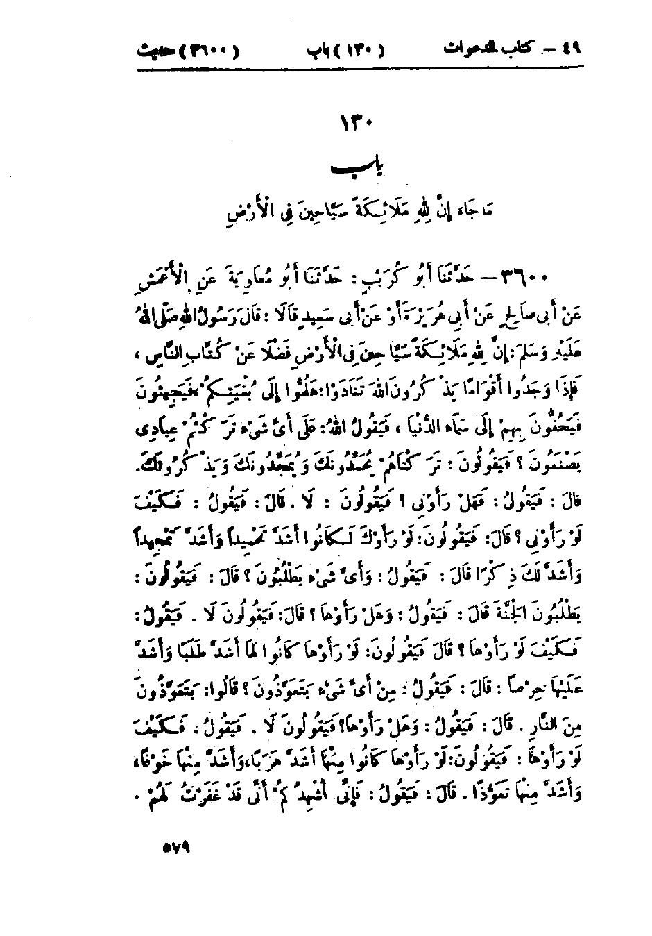 3600 - حَدَّثَنَا أَبُو كُرَيْبٍ قَالَ: حَدَّثَنَا أَبُو مُعَاوِيَةَ، عَنْ الأَعْمَشِ، عَنْ أَبِي صَالِحٍ، عَنْ أَبِي هُرَيْرَةَ، أَوْ عَنْ أَبِي سَعِيدٍ، قَالَ: قَالَ رَسُولُ اللَّهِ صَلَّى اللَّهُ عَلَيْهِ وَسَلَّمَ: " إِنَّ لِلَّهِ مَلَائِكَةً سَيَّاحِينَ فِي الأَرْضِ فُضُلًا عَنْ كُتَّابِ النَّاسِ، فَإِذَا وَجَدُوا أَقْوَامًا يَذْكُرُونَ اللَّهَ تَنَادَوْا: هَلُمُّوا إِلَى بُغْيَتِكُمْ، فَيَجِيئُونَ فَيَحُفُّونَ بِهِمْ إِلَى سَمَاءِ الدُّنْيَا، فَيَقُولُ اللَّهُ: §أَيَّ شَيْءٍ تَرَكْتُمْ عِبَادِي يَصْنَعُونَ، فَيَقُولُونَ: تَرَكْنَاهُمْ يَحْمَدُونَكَ وَيُمَجِّدُونَكَ وَيَذْكُرُونَكَ، قَالَ: فَيَقُولُ: فَهَلْ رَأَوْنِي، فَيَقُولُونَ: لَا، قَالَ: فَيَقُولُ: فَكَيْفَ لَوْ رَأَوْنِي؟ قَالَ: فَيَقُولُونَ: لَوْ رَأَوْكَ لَكَانُوا أَشَدَّ تَحْمِيدًا، وَأَشَدَّ تَمْجِيدًا، وَأَشَدَّ لَكَ ذِكْرًا، قَالَ: فَيَقُولُ: وَأَيُّ شَيْءٍ يَطْلُبُونَ؟ قَالَ: فَيَقُولُونَ: يَطْلُبُونَ الجَنَّةَ، قَالَ: فَيَقُولُ: وَهَلْ رَأَوْهَا؟ قَالَ: فَيَقُولُونَ: لَا، فَيَقُولُ: فَكَيْفَ لَوْ رَأَوْهَا؟ قَالَ: فَيَقُولُونَ: لَوْ رَأَوْهَا؟ لَكَانُوا أَشَدَّ لَهَا طَلَبًا، وَأَشَدَّ عَلَيْهَا حِرْصًا، قَالَ: فَيَقُولُ: فَمِنْ أَيِّ شَيْءٍ يَتَعَوَّذُونَ؟ قَالُوا: يَتَعَوَّذُونَ مِنَ النَّارِ، قَالَ: فَيَقُولُ: وَهَلْ رَأَوْهَا؟ فَيَقُولُونَ: لَا، فَيَقُولُ: فَكَيْفَ لَوْ رَأَوْهَا؟ فَيَقُولُونَ: لَوْ رَأَوْهَا لَكَانُوا مِنْهَا أَشَدَّ هَرَبًا، وَأَشَدَّ مِنْهَا خَوْفًا، وَأَشَدَّ مِنْهَا تَعَوُّذًا، قَالَ: فَيَقُولُ: فَإِنِّي أُشْهِدُكُمْ أَنِّي قَدْ غَفَرْتُ لَهُمْ، -[580]- فَيَقُولُونَ: إِنَّ فِيهِمْ فُلَانًا الخَطَّاءَ لَمْ يُرِدْهُمْ إِنَّمَا جَاءَهُمْ لِحَاجَةٍ، فَيَقُولُ: هُمُ القَوْمُ لَا يَشْقَى لَهُمْ جَلِيسٌ ": «هَذَا حَدِيثٌ حَسَنٌ صَحِيحٌ»، «وَقَدْ رُوِيَ عَنْ أَبِي هُرَيْرَةَ مِنْ غَيْرِ هَذَا الوَجْهِ»