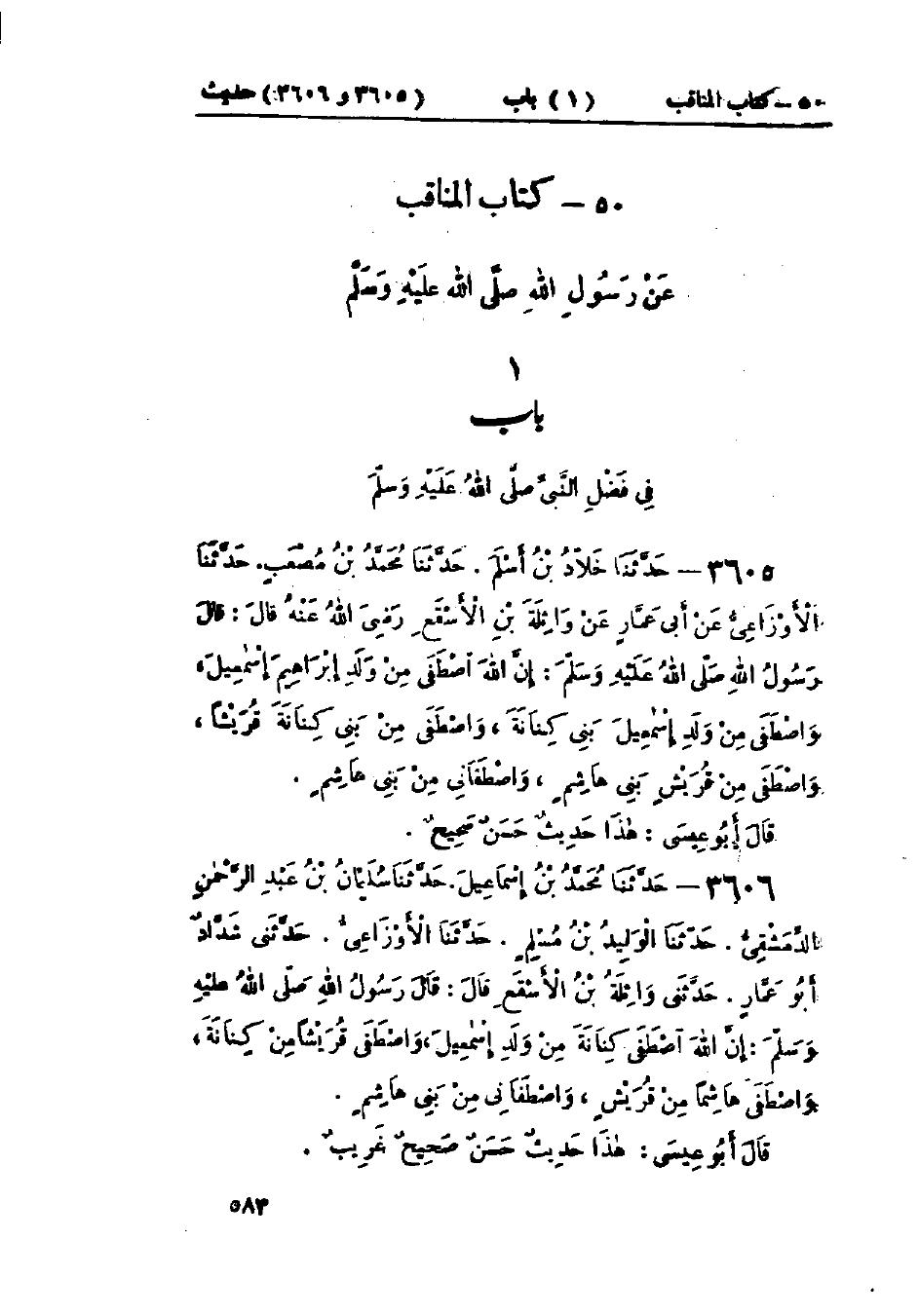 3605 - حَدَّثَنَا خَلَّادُ بْنُ أَسْلَمَ قَالَ: حَدَّثَنَا مُحَمَّدُ بْنُ مُصْعَبٍ قَالَ: حَدَّثَنَا الأَوْزَاعِيُّ، عَنْ أَبِي عَمَّارٍ، عَنْ وَاثِلَةَ بْنِ الأَسْقَعِ، قَالَ: قَالَ رَسُولُ اللَّهِ صَلَّى اللَّهُ عَلَيْهِ وَسَلَّمَ: «§إِنَّ اللَّهَ اصْطَفَى مِنْ وَلَدِ إِبْرَاهِيمَ، إِسْمَاعِيلَ، وَاصْطَفَى مِنْ وَلَدِ إِسْمَاعِيلَ بَنِي كِنَانَةَ، وَاصْطَفَى مِنْ بَنِي كِنَانَةَ قُرَيْشًا، وَاصْطَفَى مِنْ قُرَيْشٍ بَنِي هَاشِمٍ، وَاصْطَفَانِي مِنْ بَنِي هَاشِمٍ»: «هَذَا حَدِيثٌ حَسَنٌ صَحِيحٌ»