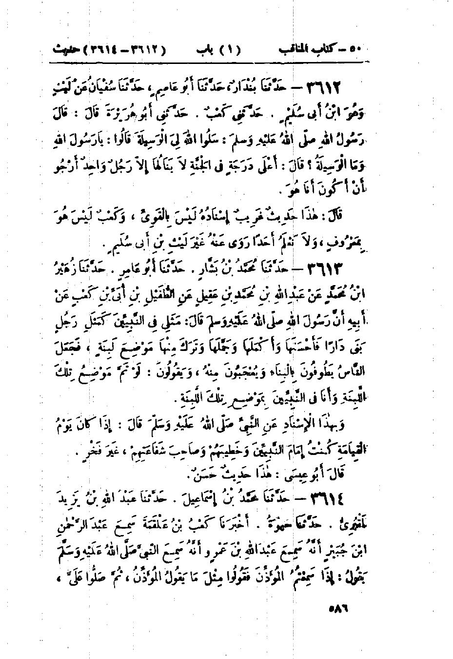 3614 - حَدَّثَنَا مُحَمَّدُ بْنُ إِسْمَاعِيلَ قَالَ: حَدَّثَنَا عَبْدُ اللَّهِ بْنُ يَزِيدَ الْمُقْرِئُ قَالَ: حَدَّثَنَا حَيْوَةُ قَالَ: أَخْبَرَنَا كَعْبُ بْنُ عَلْقَمَةَ، سَمِعَ عَبْدَ الرَّحْمَنِ بْنَ جُبَيْرٍ، أَنَّهُ سَمِعَ عَبْدَ اللَّهِ بْنَ عَمْرٍو، أَنَّهُ سَمِعَ النَّبِيَّ صَلَّى اللَّهُ عَلَيْهِ وَسَلَّمَ يَقُولُ: «§إِذَا سَمِعْتُمُ المُؤَذِّنَ فَقُولُوا مِثْلَ مَا يَقُولُ، ثُمَّ صَلُّوا عَلَيَّ، -[587]- فَإِنَّهُ مَنْ صَلَّى عَلَيَّ صَلَاةً صَلَّى اللَّهُ عَلَيْهِ بِهَا عَشْرًا، ثُمَّ سَلُوا لِيَ الوَسِيلَةَ فَإِنَّهَا مَنْزِلَةٌ فِي الجَنَّةِ لَا تَنْبَغِي إِلَّا لِعَبْدٍ مِنْ عِبَادِ اللَّهِ وَأَرْجُو أَنْ أَكُونَ أَنَا هُوَ، وَمَنْ سَأَلَ لِيَ الوَسِيلَةَ حَلَّتْ عَلَيْهِ الشَّفَاعَةُ»: «هَذَا حَدِيثٌ حَسَنٌ صَحِيحٌ» قَالَ مُحَمَّدٌ: عَبْدُ الرَّحْمَنِ بْنُ جُبَيْرٍ هَذَا قُرَشِيٌّ وَهُوَ مِصْرِيٌّ وَعَبْدُ الرَّحْمَنِ بْنُ جُبَيْرِ بْنِ نُفَيْرٍ شَامِيٌّ
