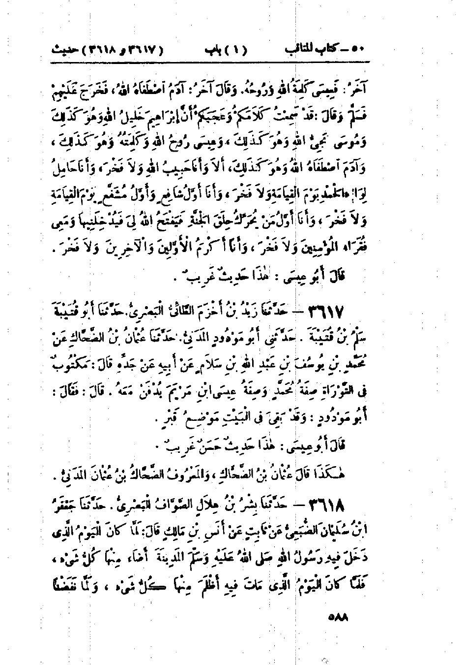 3617 - حَدَّثَنَا زَيْدُ بْنُ أَخْزَمَ الطَّائِيُّ البَصْرِيُّ قَالَ: حَدَّثَنَا أَبُو قُتَيْبَةَ سَلْمُ بْنُ قُتَيْبَةَ قَالَ: حَدَّثَنِي أَبُو مَوْدُودٍ المَدَنِيُّ قَالَ: حَدَّثَنَا عُثْمَانُ بْنُ الضَّحَّاكِ، عَنْ مُحَمَّدِ بْنِ يُوسُفَ بْنِ عَبْدِ اللَّهِ بْنِ سَلَامٍ، عَنْ أَبِيهِ، عَنْ جَدِّهِ، قَالَ: «§مَكْتُوبٌ فِي التَّوْرَاةِ صِفَةُ مُحَمَّدٍ وَعِيسَى ابْنِ مَرْيَمَ يُدْفَنُ مَعَهُ» قَالَ: فَقَالَ أَبُو مَوْدُودٍ وَقَدْ بَقِيَ فِي البَيْتِ مَوْضِعُ قَبْرٍ: «هَذَا حَدِيثٌ حَسَنٌ غَرِيبٌ» هَكَذَا قَالَ: عُثْمَانُ بْنُ الضَّحَّاكِ، وَالمَعْرُوفُ الضَّحَّاكُ بْنُ عُثْمَانَ الْمَدِينِيُّ
